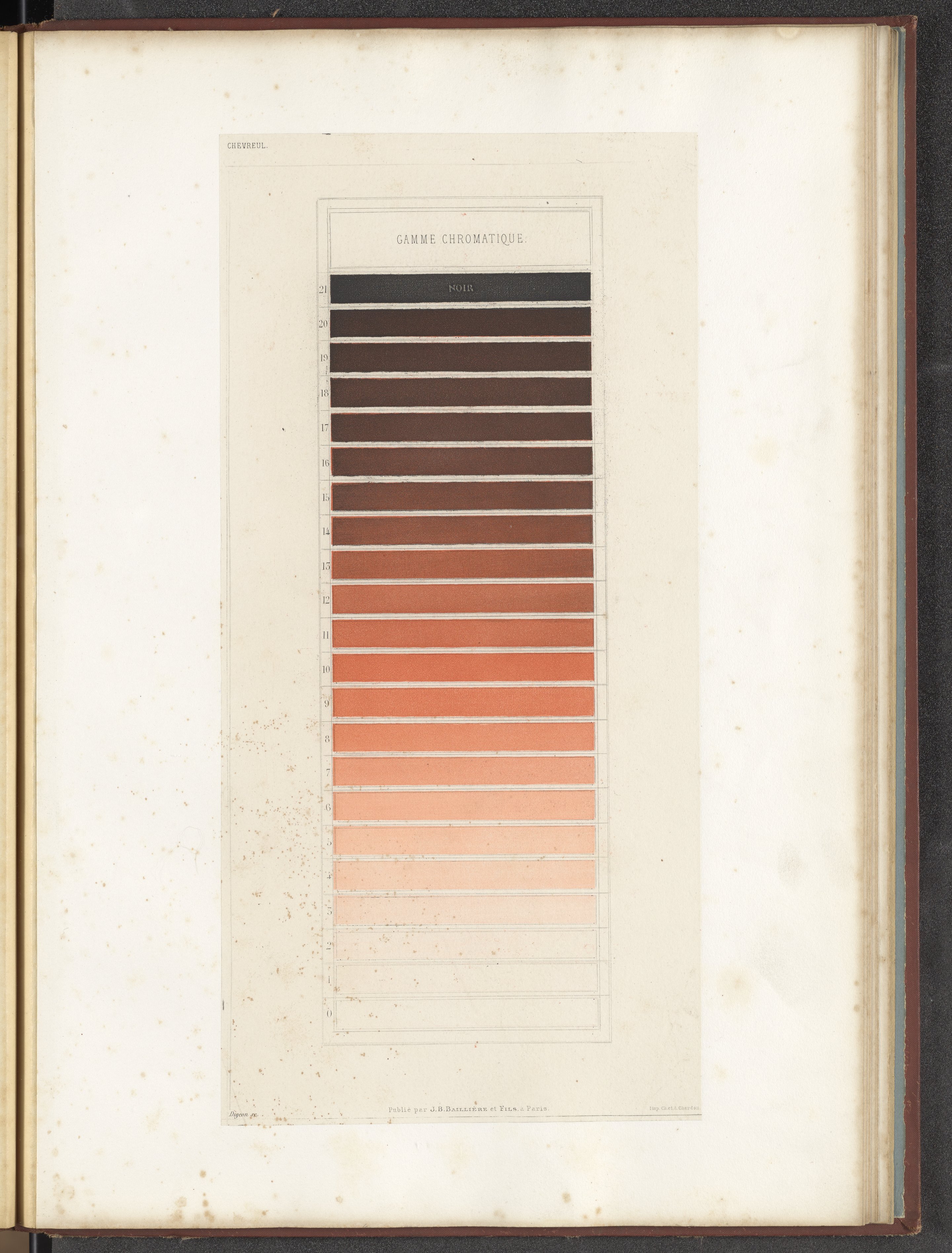 Chevreul, M. E. (Michel Eugène). “Plate XVIII: Gamme Chromatique: Orangé.” In Des Couleurs Et De Leurs Applications Aux Arts Industriels à l'Aide Des Cercles Chromatiques. Paris, France: J.-B. Baillière et fils, 1864. https://digital.sciencehistory.org/works/79407x312.