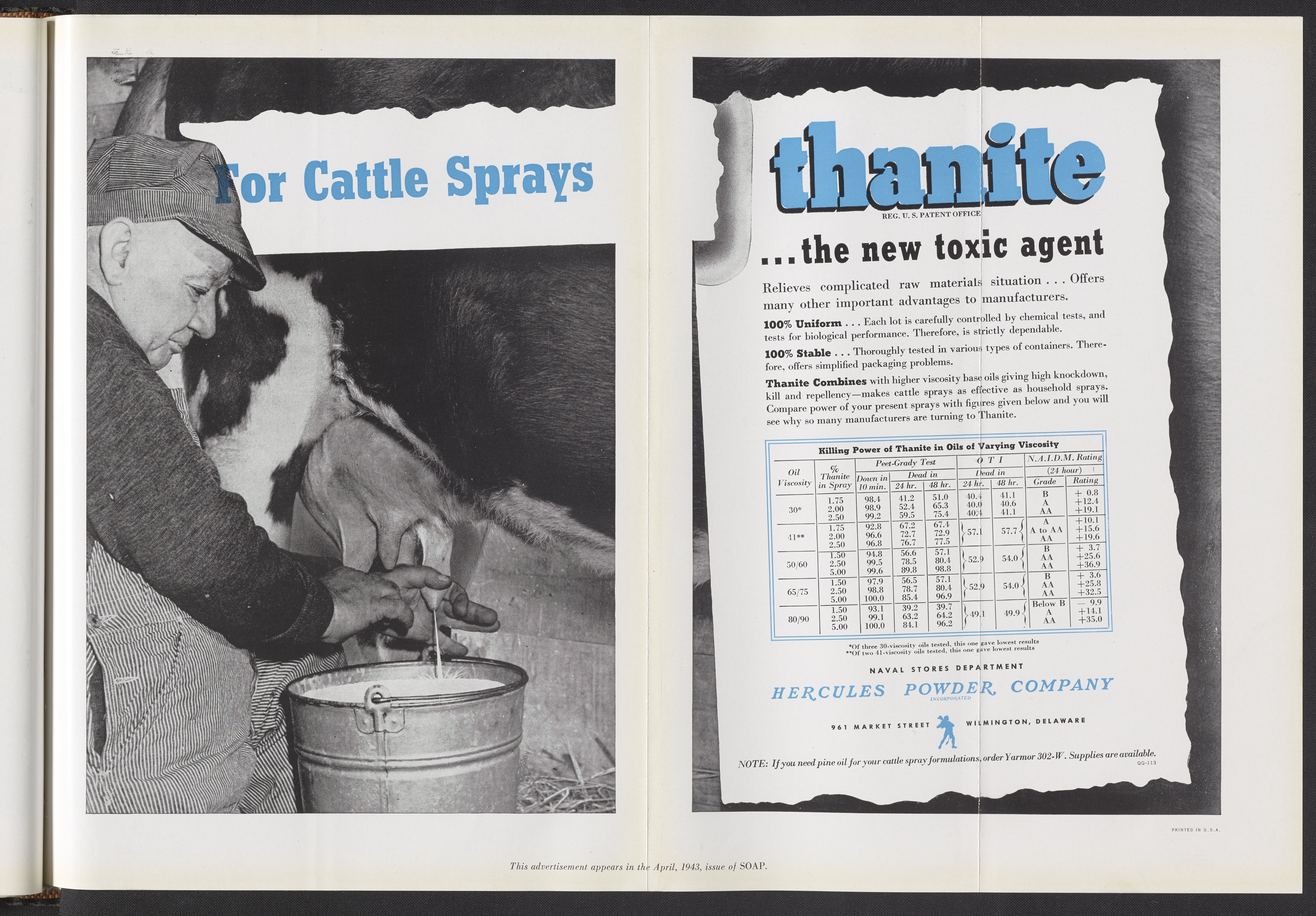 Hercules Incorporated. “For Cattle Sprays...Thanite...the New Toxic Agent.” 1943 Hercules Advertisements, 1943. Records of Hercules Incorporated, Volume 1943. Science History Institute. Philadelphia. https://digital.sciencehistory.org/works/7d278t88q.