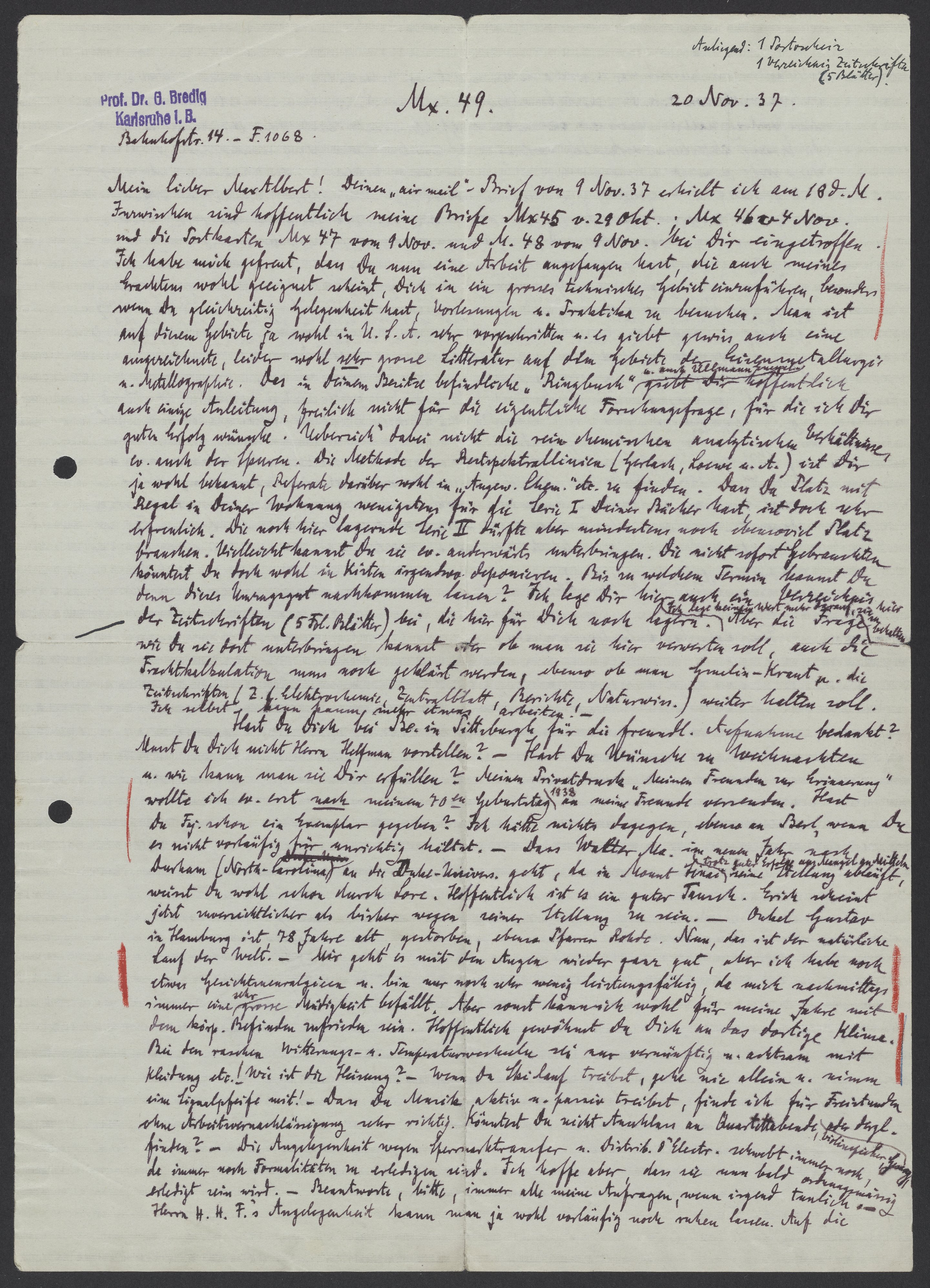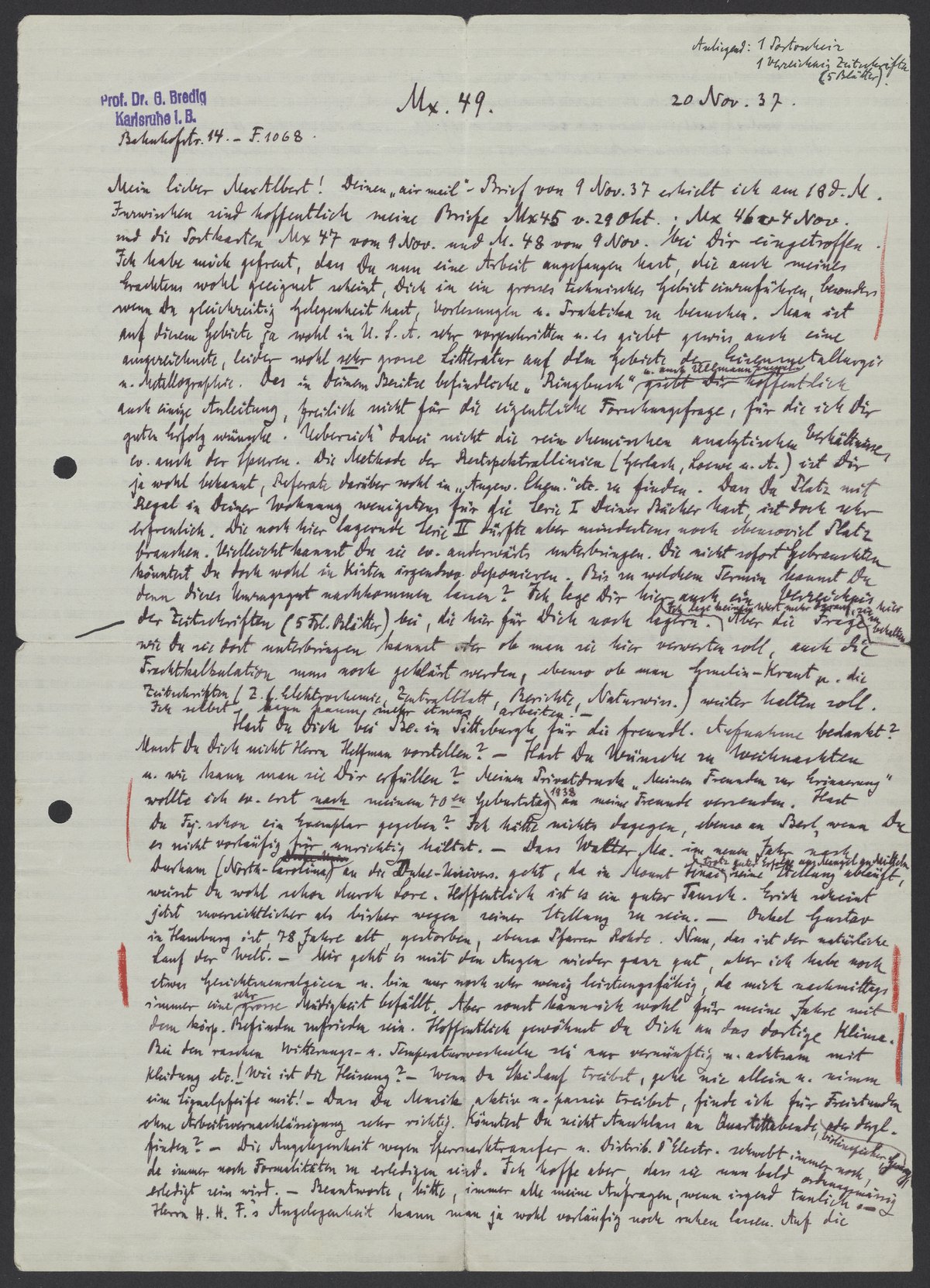 Letter from Georg Bredig to Max Bredig, November 20, 1937