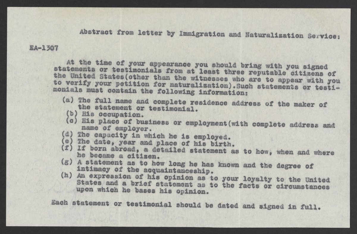 Testimonial outlines from the United States Immigration and Naturalization Service