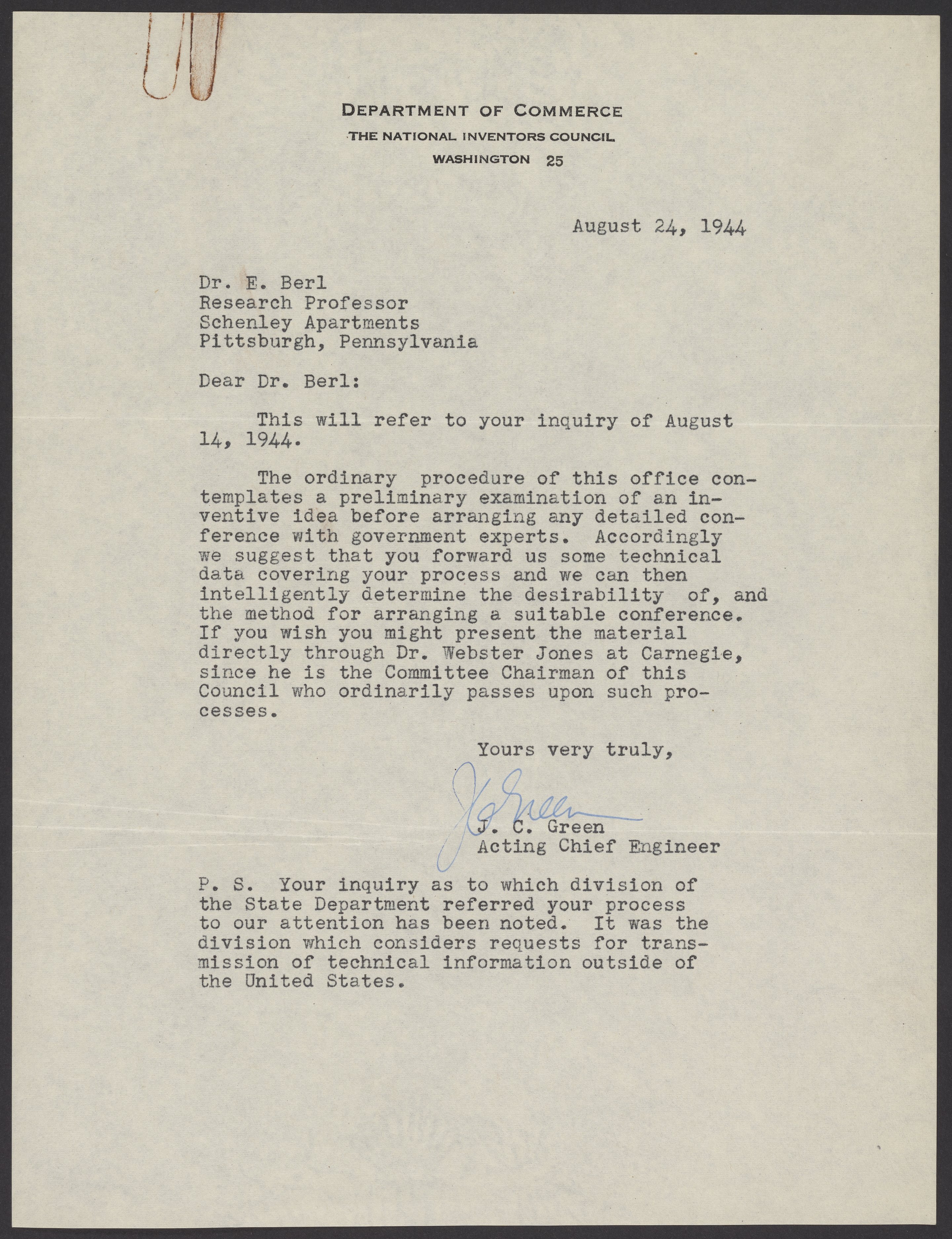 Green, J. C., and National Inventors Council (U.S.). “Letter from the National Inventors Council to Ernst Berl, August 24, 1944,” August 24, 1944. Ernst Berl Papers, Box 2, Folder 46. Science History Institute. Philadelphia. https://digital.sciencehistory.org/works/7fmsddp.