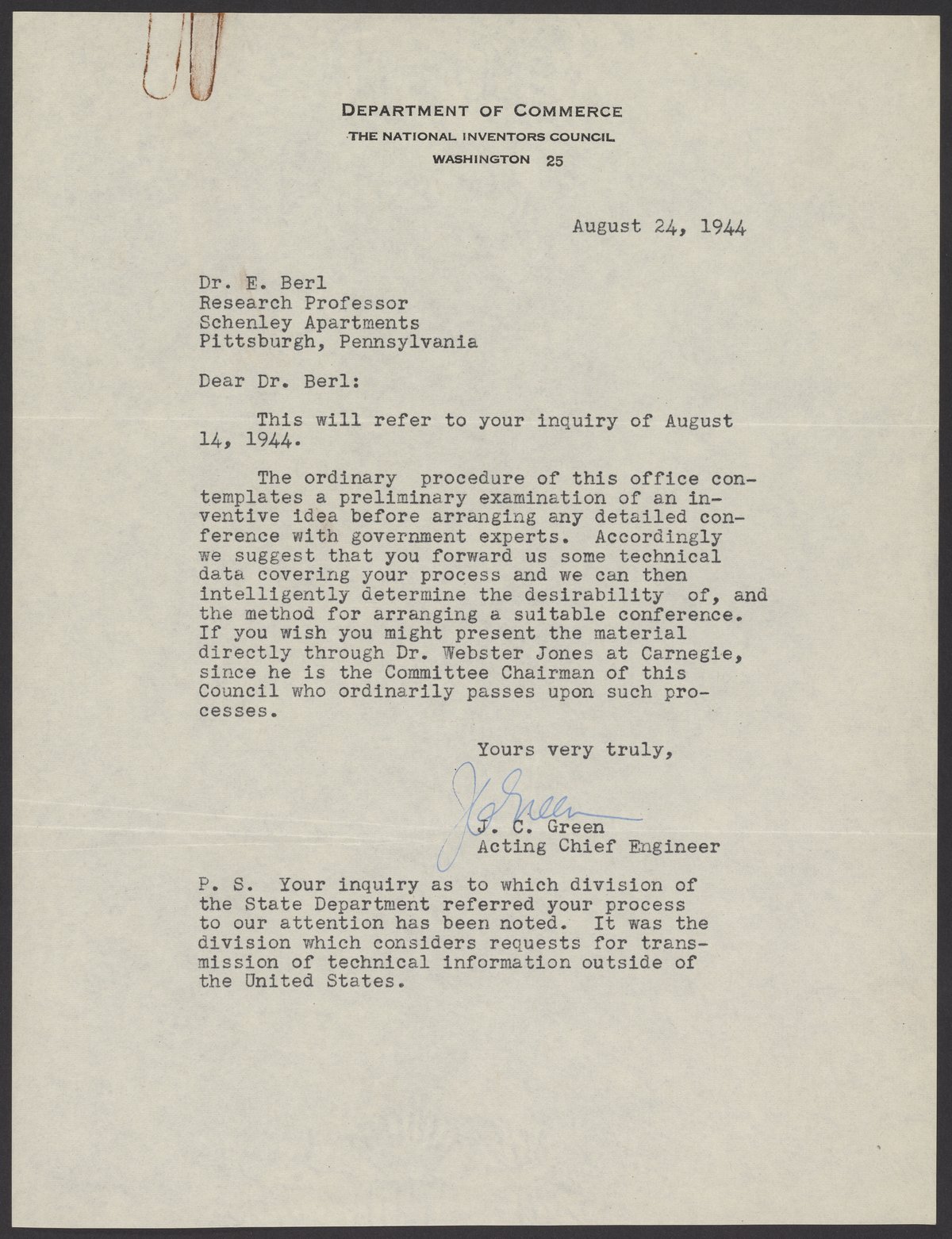 Letter from the National Inventors Council to Ernst Berl, August 24, 1944