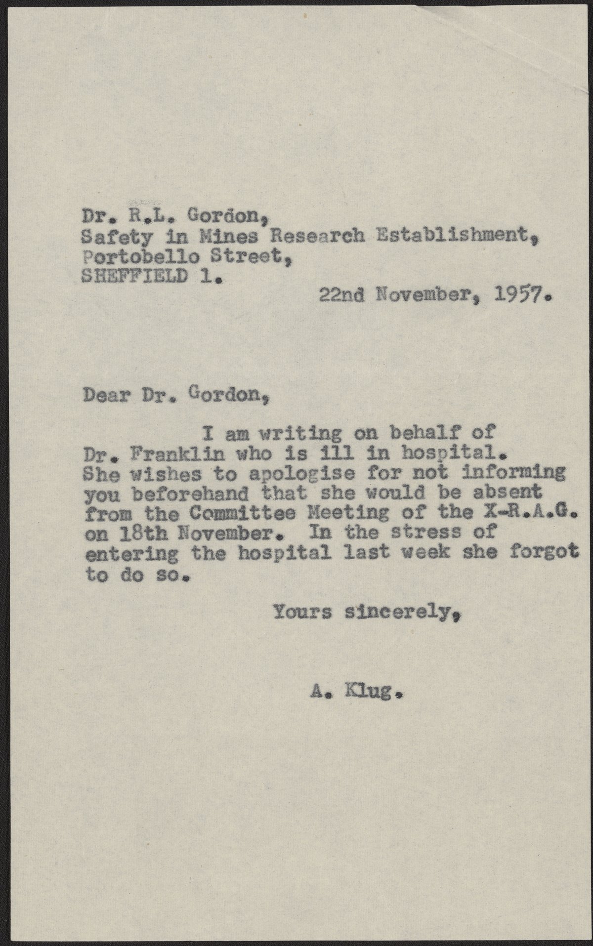 Letter from Aaron Klug (1926-2018) to R. L. (Richard Lee) Gordon (1935-2014) apologizing on behalf of Rosalind Franklin (1920-1958), who missed a committee meeting due to falling ill and being admitted to the hospital.