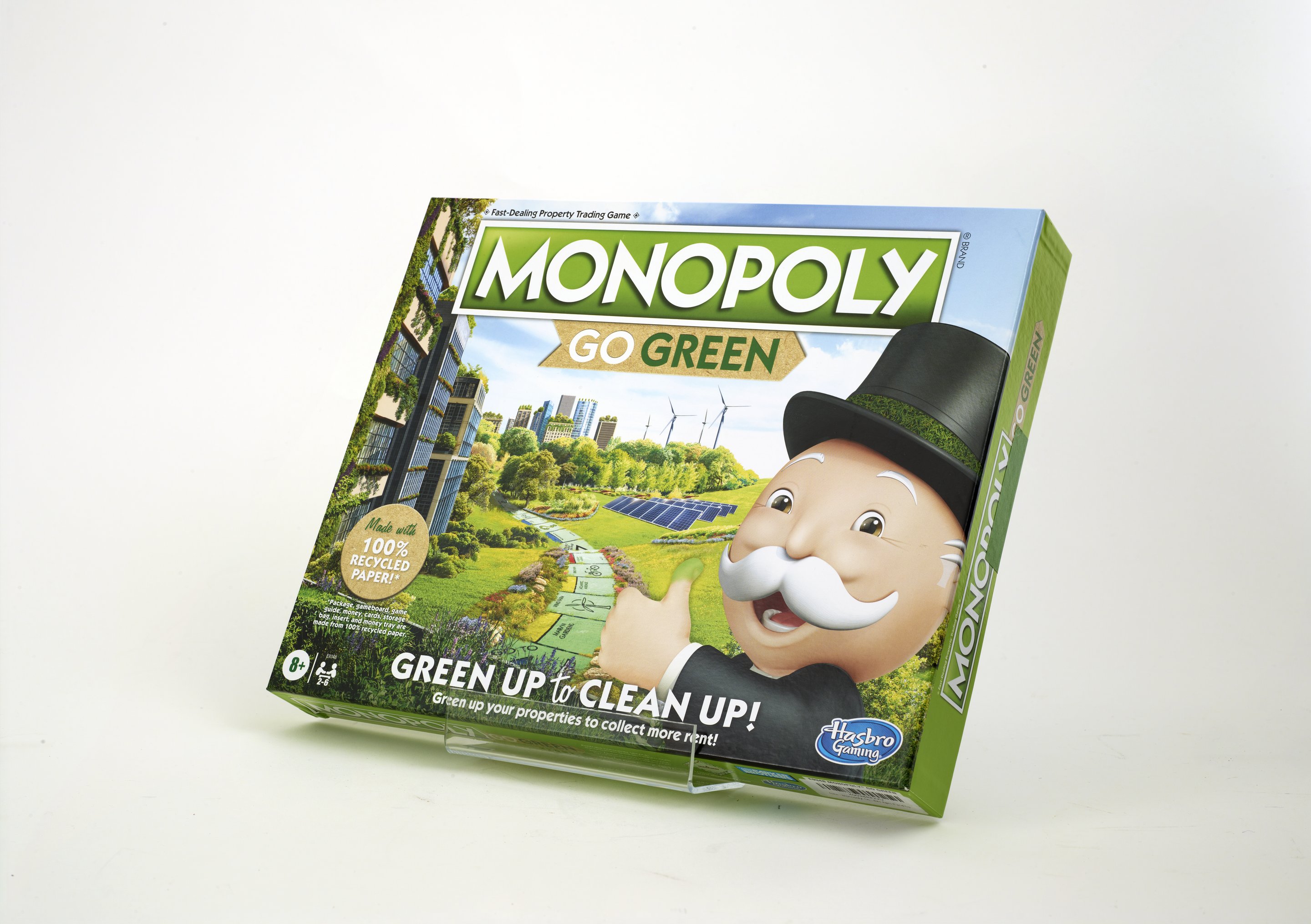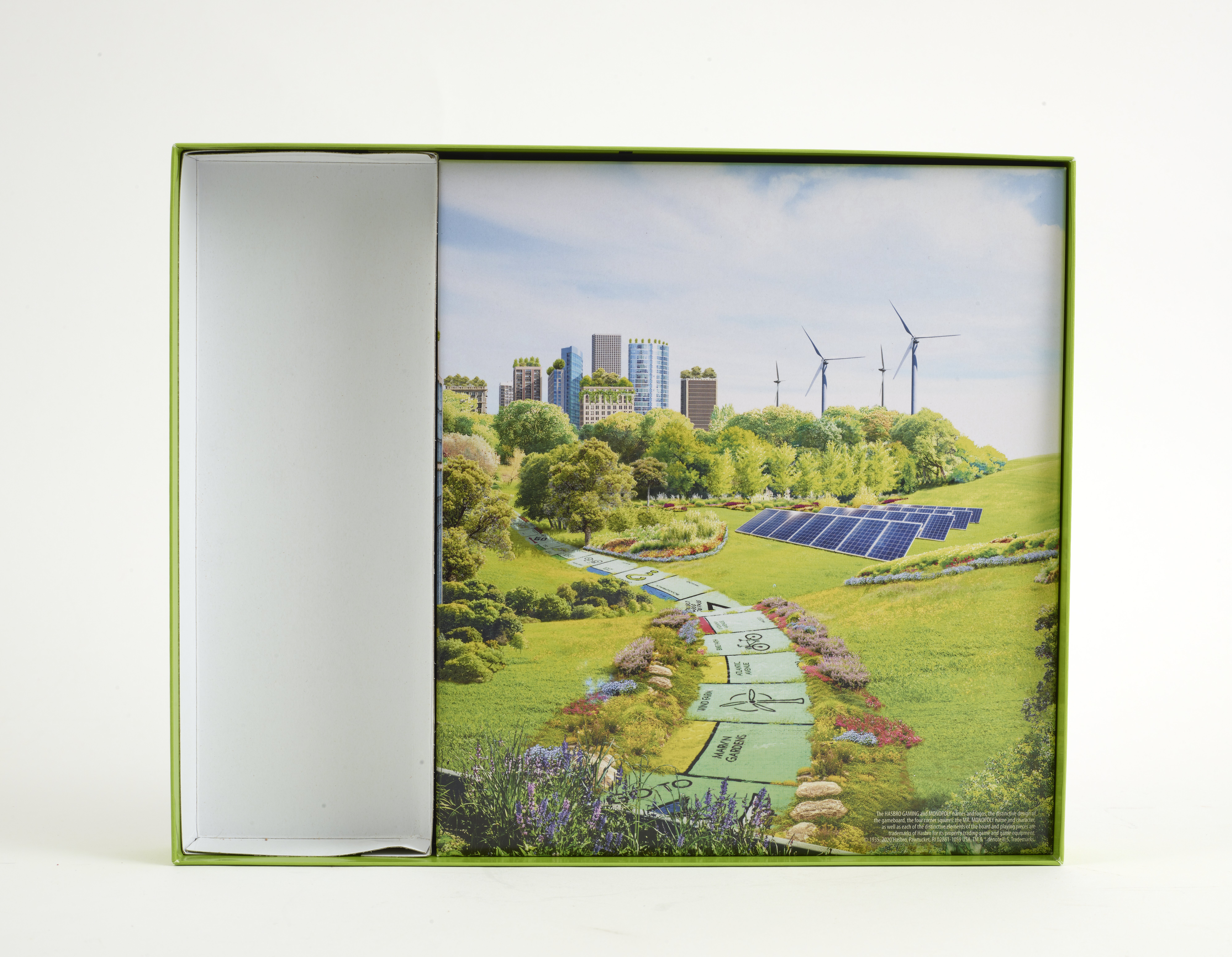 Small JPG1200 x 967px — 177 KBLarge JPG2880 x 2321px — 694 KBFull-sized JPG8377 x 6751px — 4.0 MBOriginal fileTIFF — 8377 x 6751px — 162 MBA rectangular box with an illustration of a city using multiple forms of renewable energy and the iconic Mr. Monopoly. Box contains 1 instruction booklet, 1 gameboard, 6 plastic tokens, 18 title deed cards, 16 chance cards, 16 community chest cards, 12 wooden greenhouses, 2 wooden dice, and 1 pack of play money.
