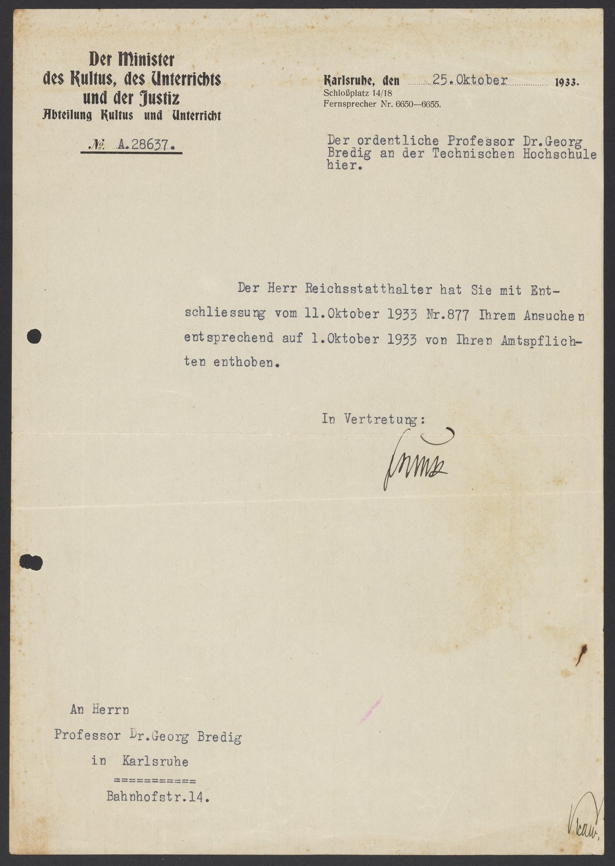 The Ministry of Education, Culture, and Justice notifies Georg Bredig (1868-1944) that he has been relieved of his teaching and research duties at the Karlsruhe Technical University. Although Georg Bredig retired on his own initiative, it came in the wake of increasing antisemitism towards Jewish academics in Germany under the Third Reich. In April 1933, the Third Reich had additionally passed The Law for the Restoration of the Professional Service, which prevented Jews and political opponents from working in university and government positions.