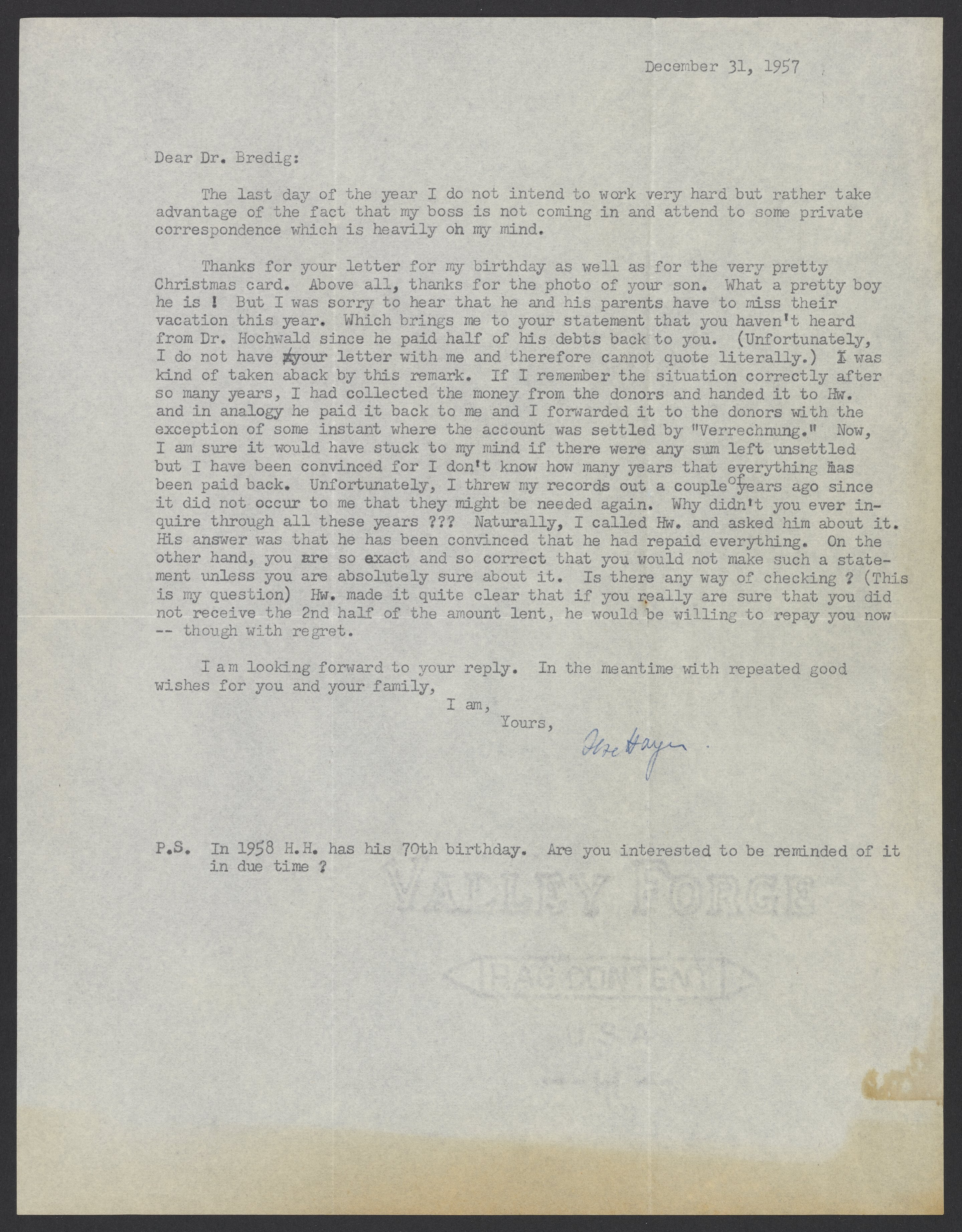 Letter from Elsa (Ilse) Hayn to Max Bredig, December 31, 1957