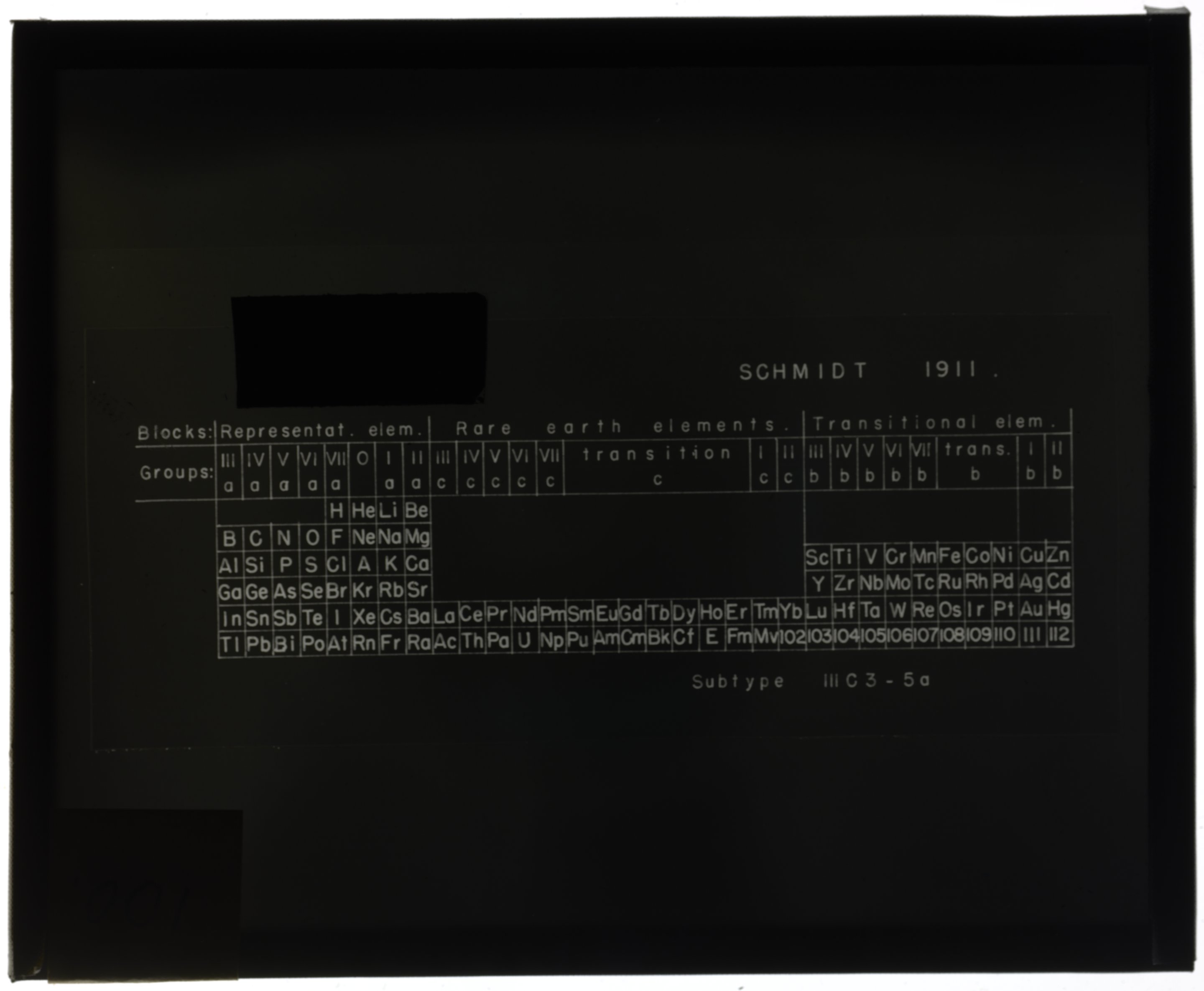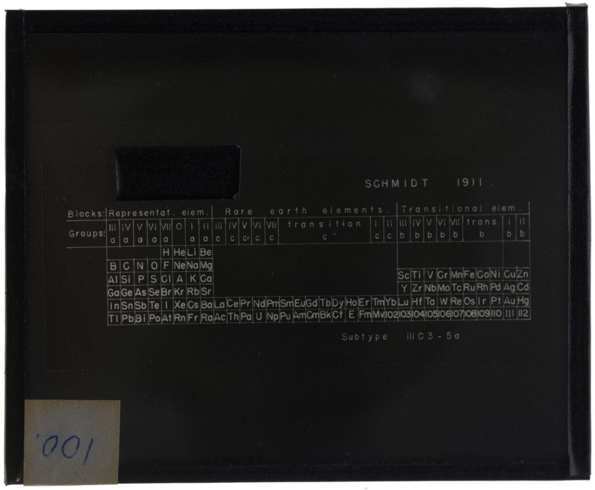 Schmidt, Curt, and Edward G. Mazurs. “Series Table Designed by Curt Schmidt (1911).” Glass (material), circa 1911–1957. Edward G. Mazurs Collection of Periodic Systems Images, Box 2. Science History Institute. Philadelphia. https://digital.sciencehistory.org/works/7h149q35x.