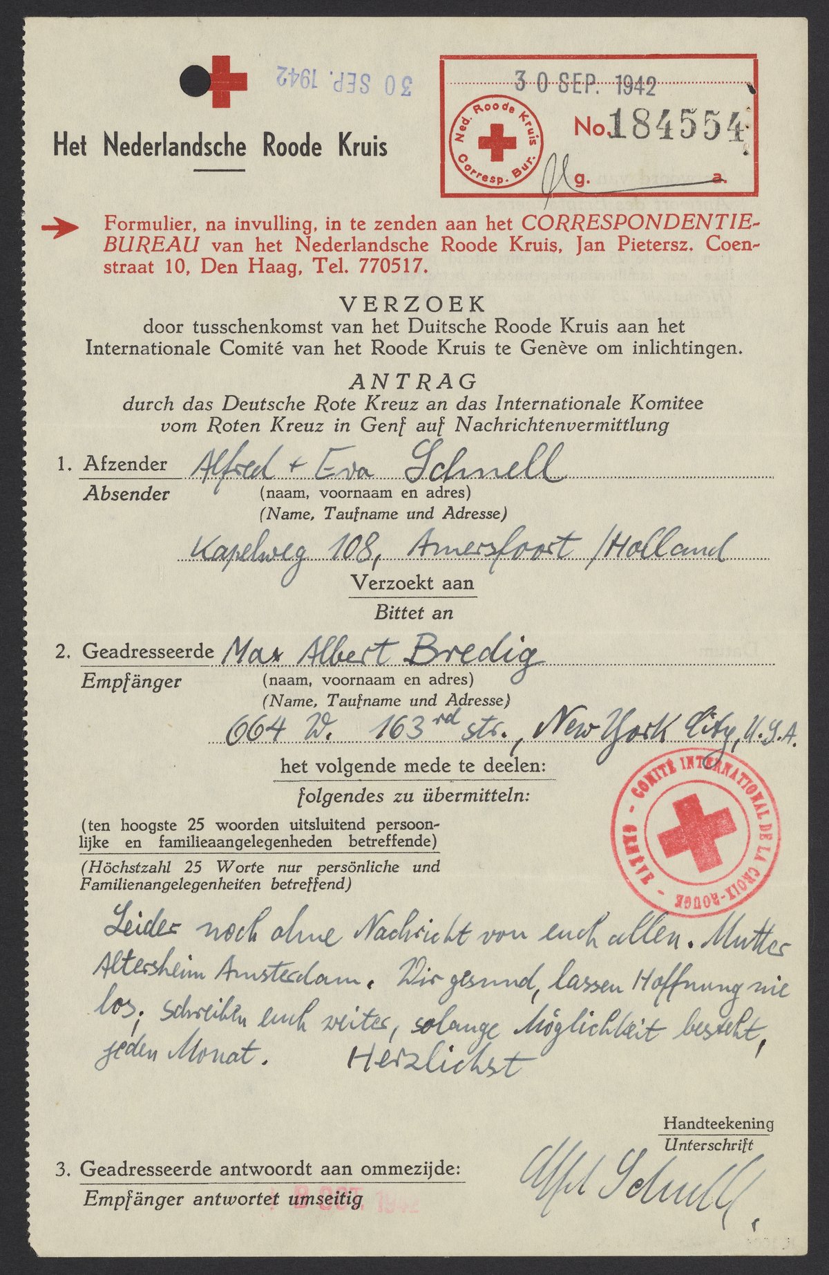 A message from Alfred Schnell (1900-1944) and Eva Schnell (1913-1944) to Max Albert Bredig (1902-1977). Alfred Schnell was a former colleague of Max Bredig. In the early 1940s, Alfred and his wife Eva fled to The Hauge to escape the persecution of the Jewish people in Germany. In 1943, German forces invaded the Netherlands and the Schnells went into hiding. In their messages to Max Bredig, they use aliases such as Arthur and Erna Dalem, Arthur and Ellen Escaper, and Alfred and Eva Kwik.