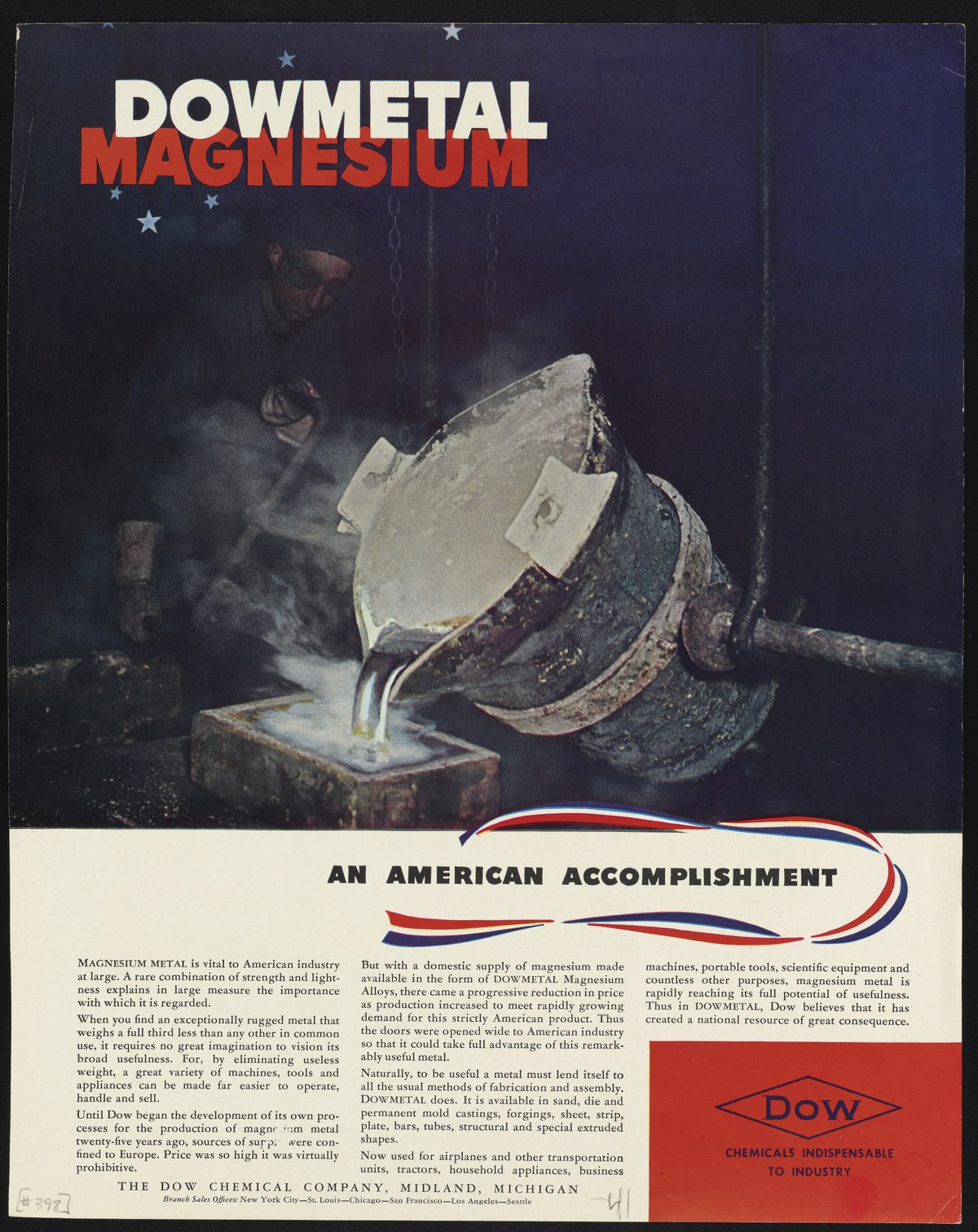 Dow Chemical Company. “Dowmetal Magnesium: An American Accomplishment,” 1941. Advertisements from the Dow Chemical Historical Collection, Box 8. Science History Institute. Philadelphia. https://digital.sciencehistory.org/works/7hotsiy.