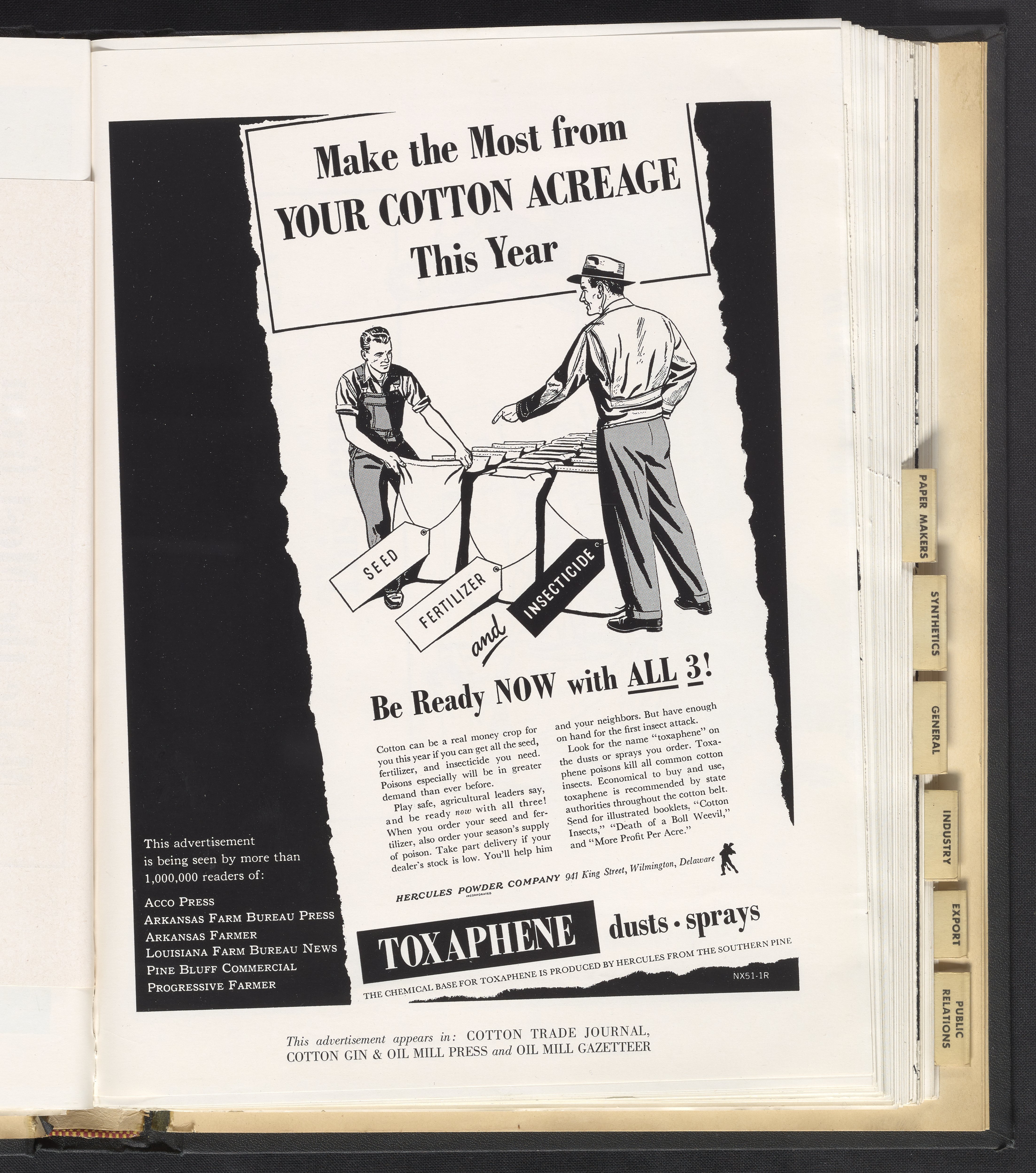 Hercules Incorporated. “Make the Most from Your Cotton Acreage This Year.” 1951 Hercules Advertisements, 1951. Records of Hercules Incorporated, Volume 1951. Science History Institute. Philadelphia. https://digital.sciencehistory.org/works/7m01bm533.
