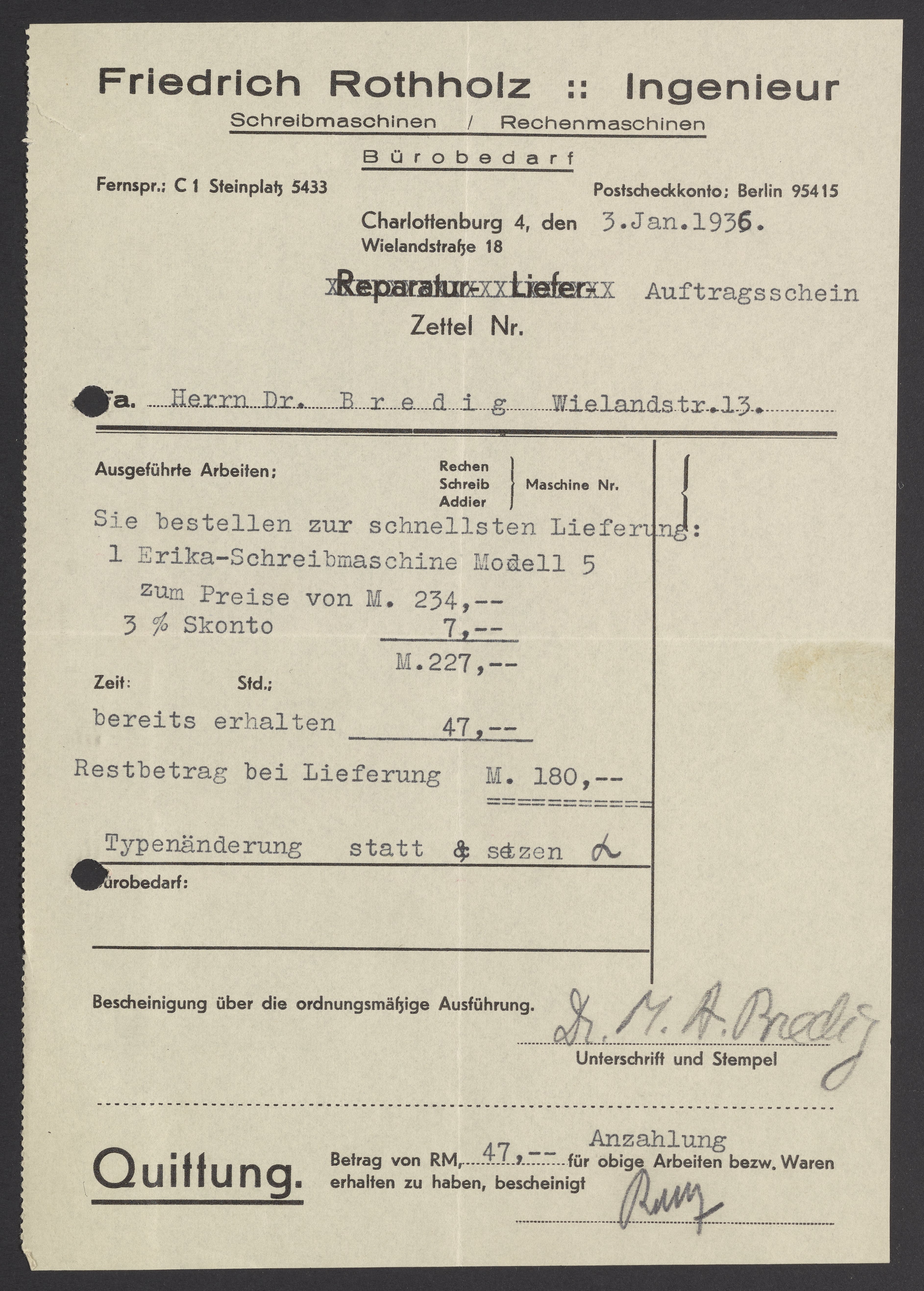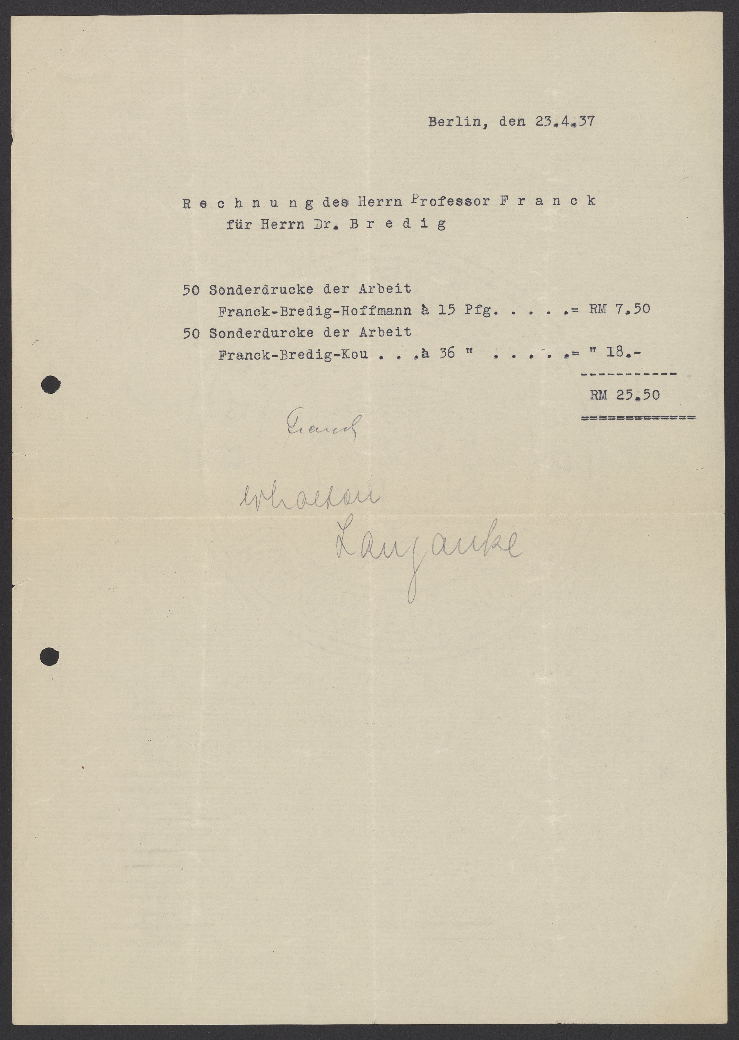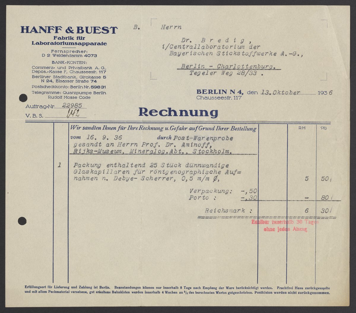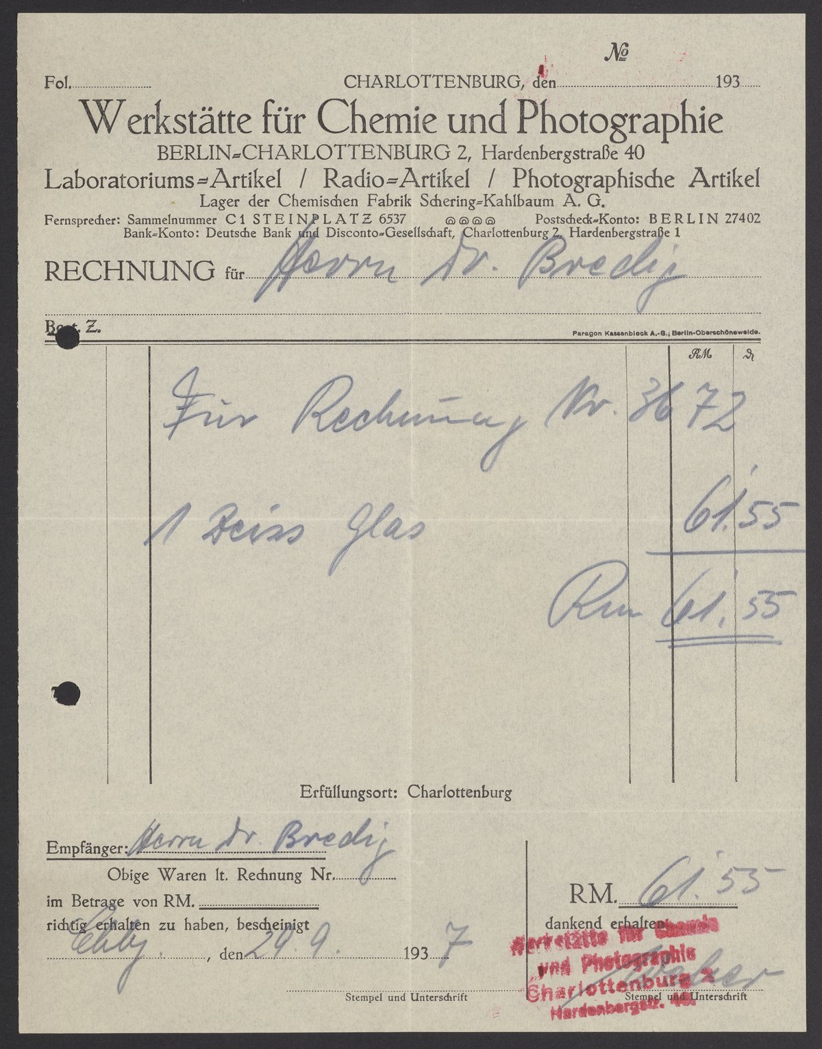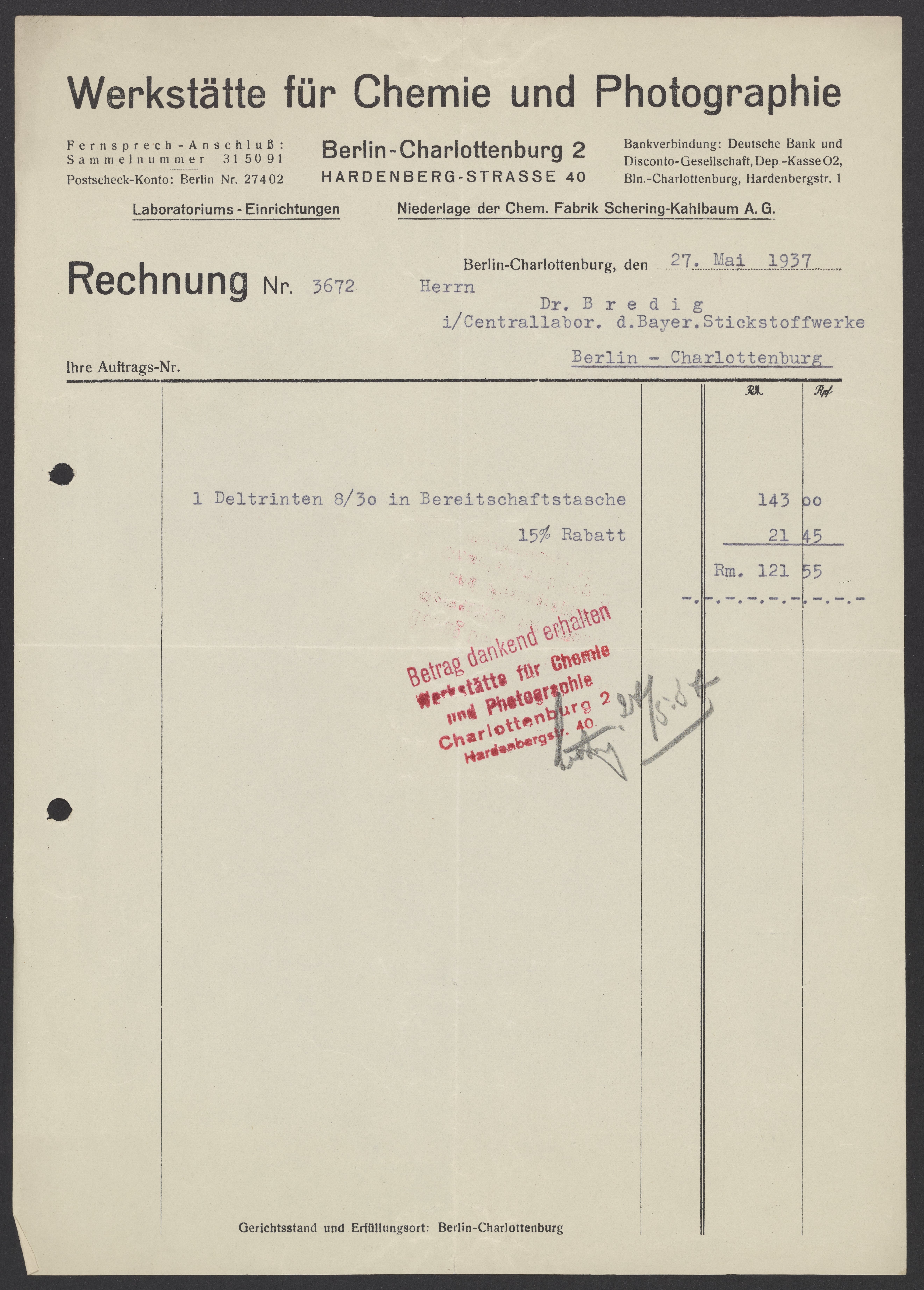 Invoices and receipts kept by Max Bredig, 1936-1937