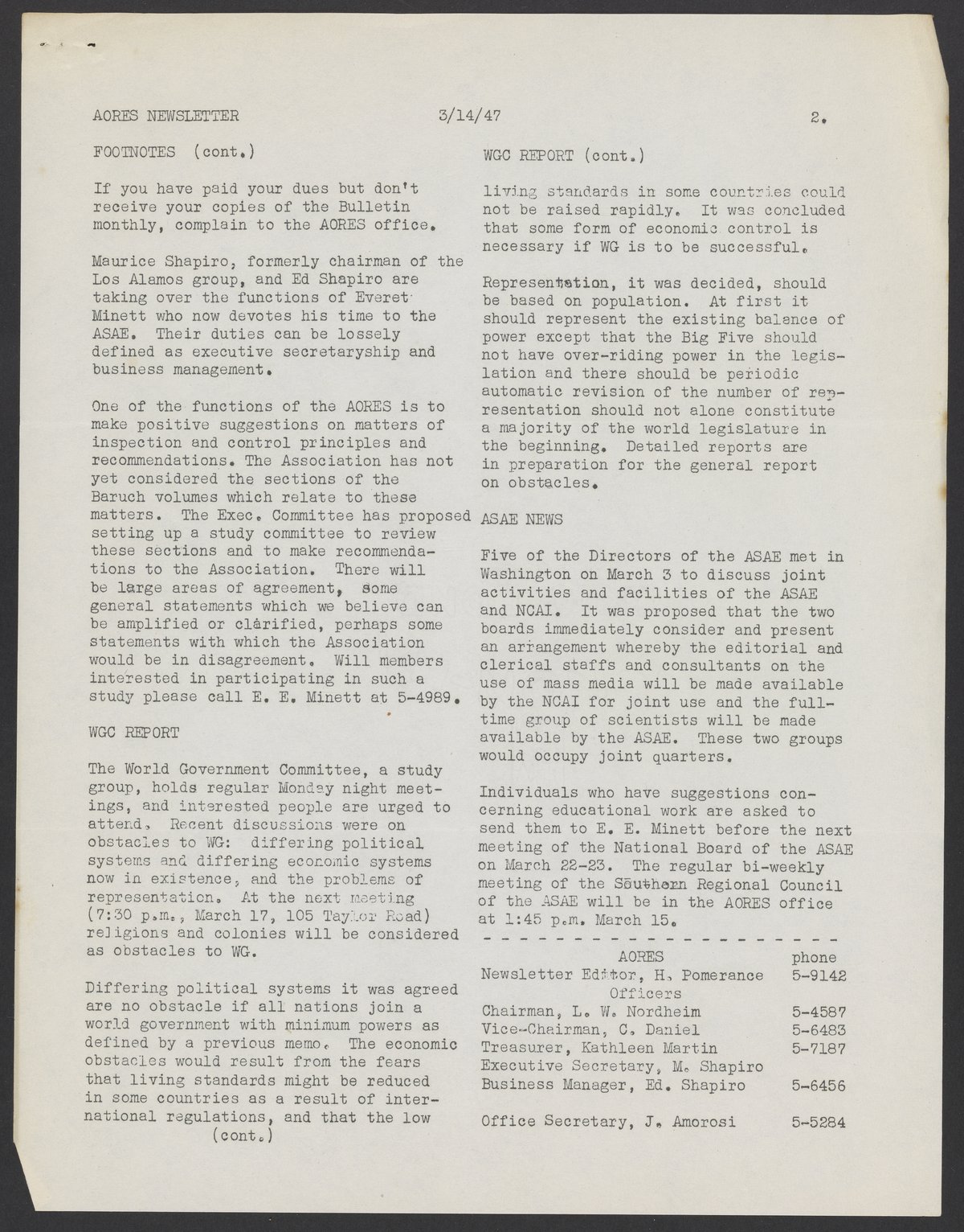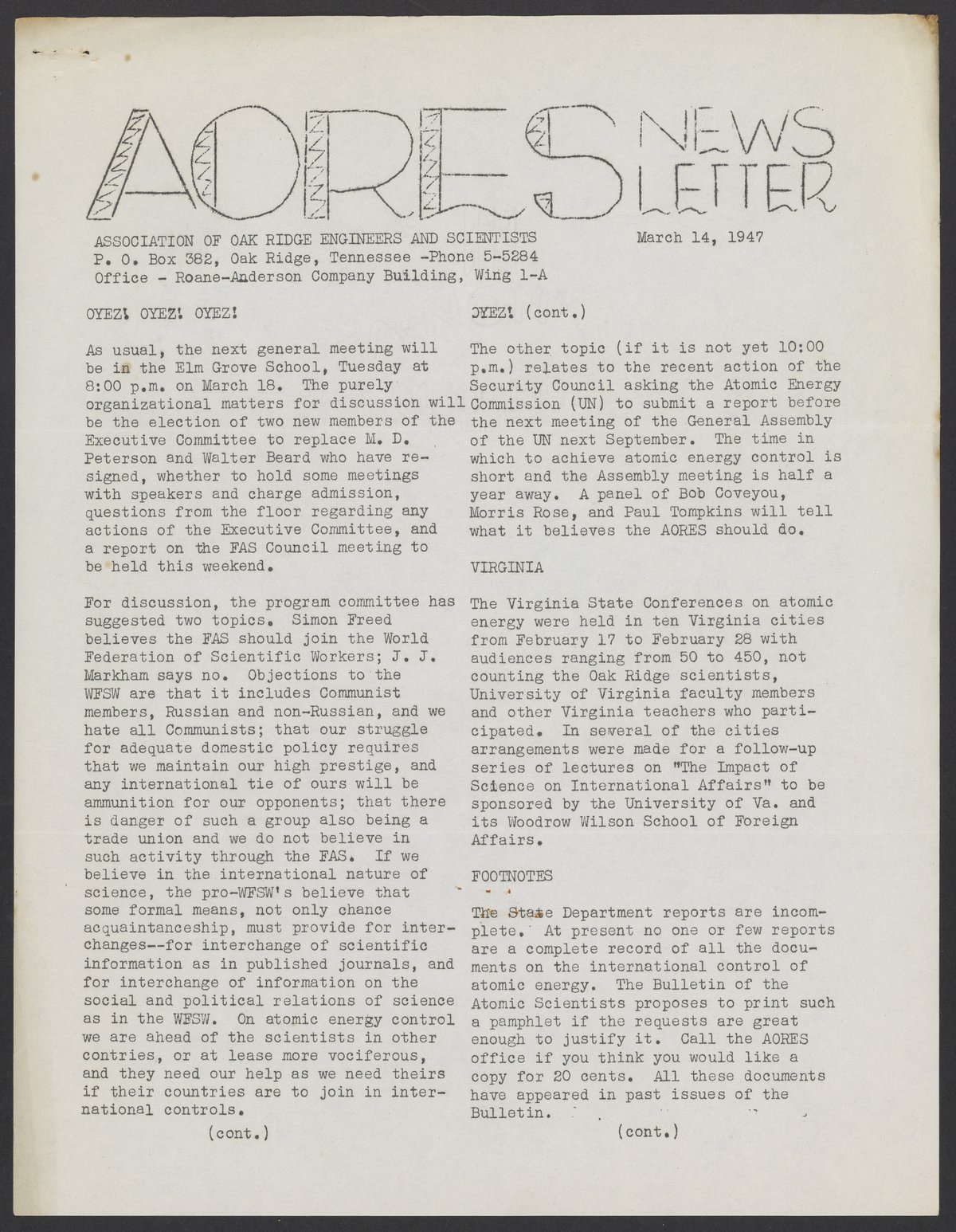 Newsletter for the Association of Oak Ridge Engineers and Scientists (AORES), March 14, 1947