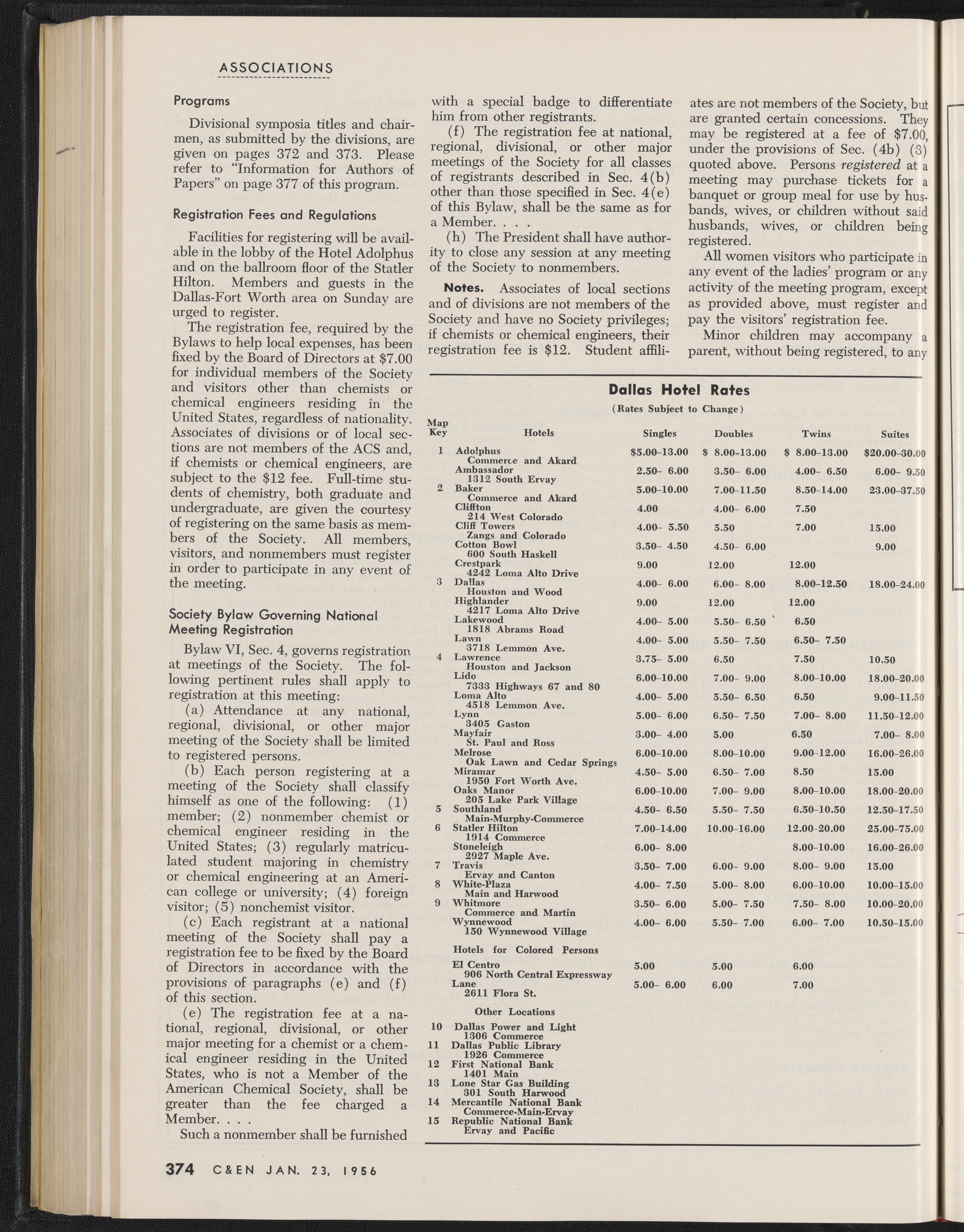Pages 374 and 375 of Chemical and Engineering News, Volume 34, Issue 4. These two pages features Dallas, Texas hotel rates and a map of the downtown area for the 1956 American Chemical Society convention.