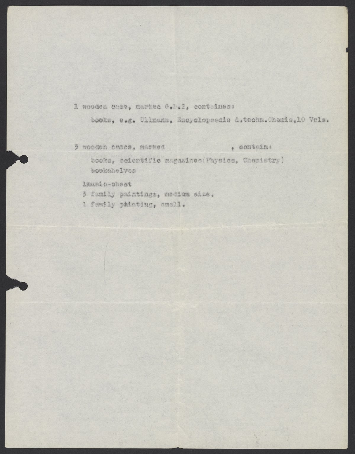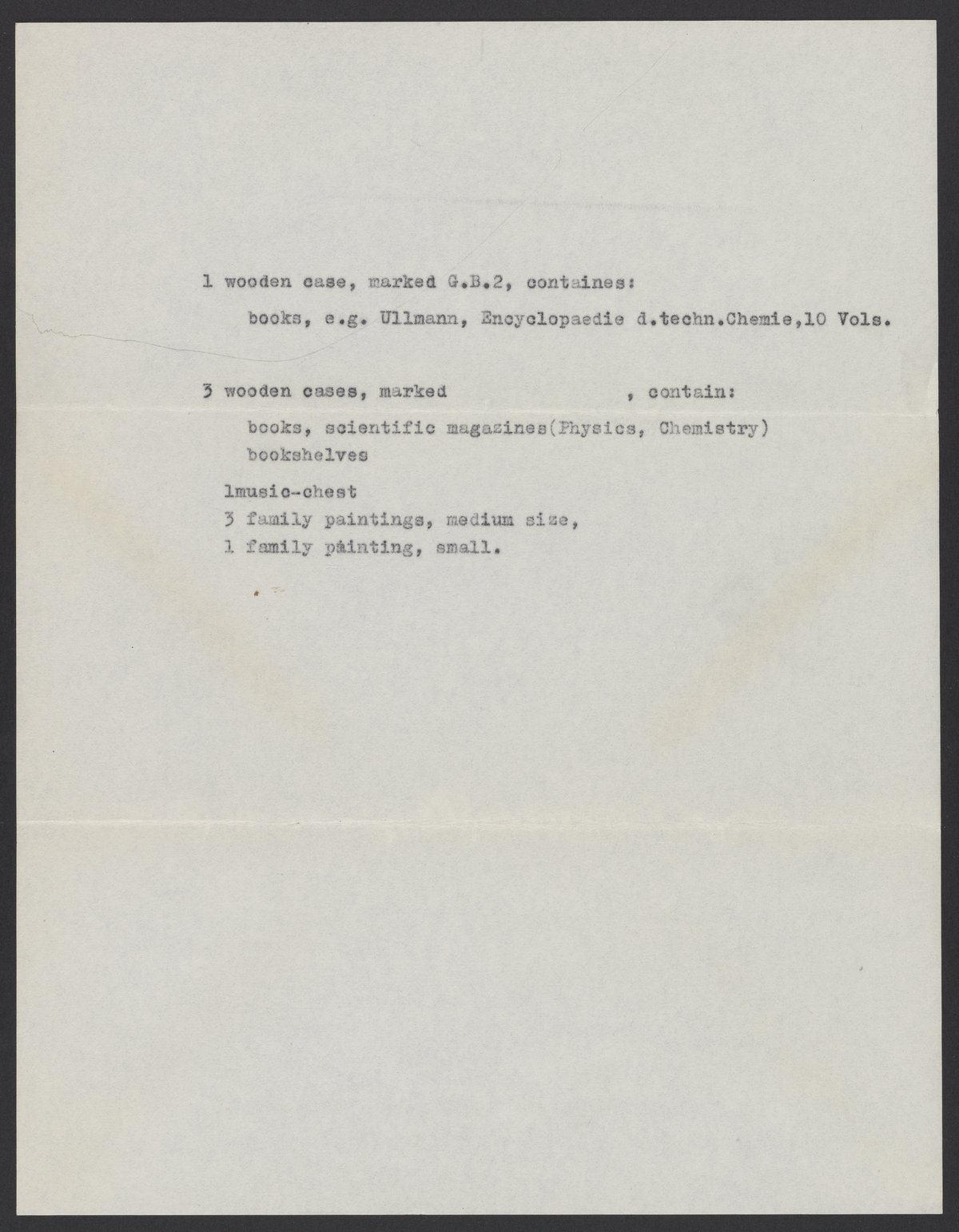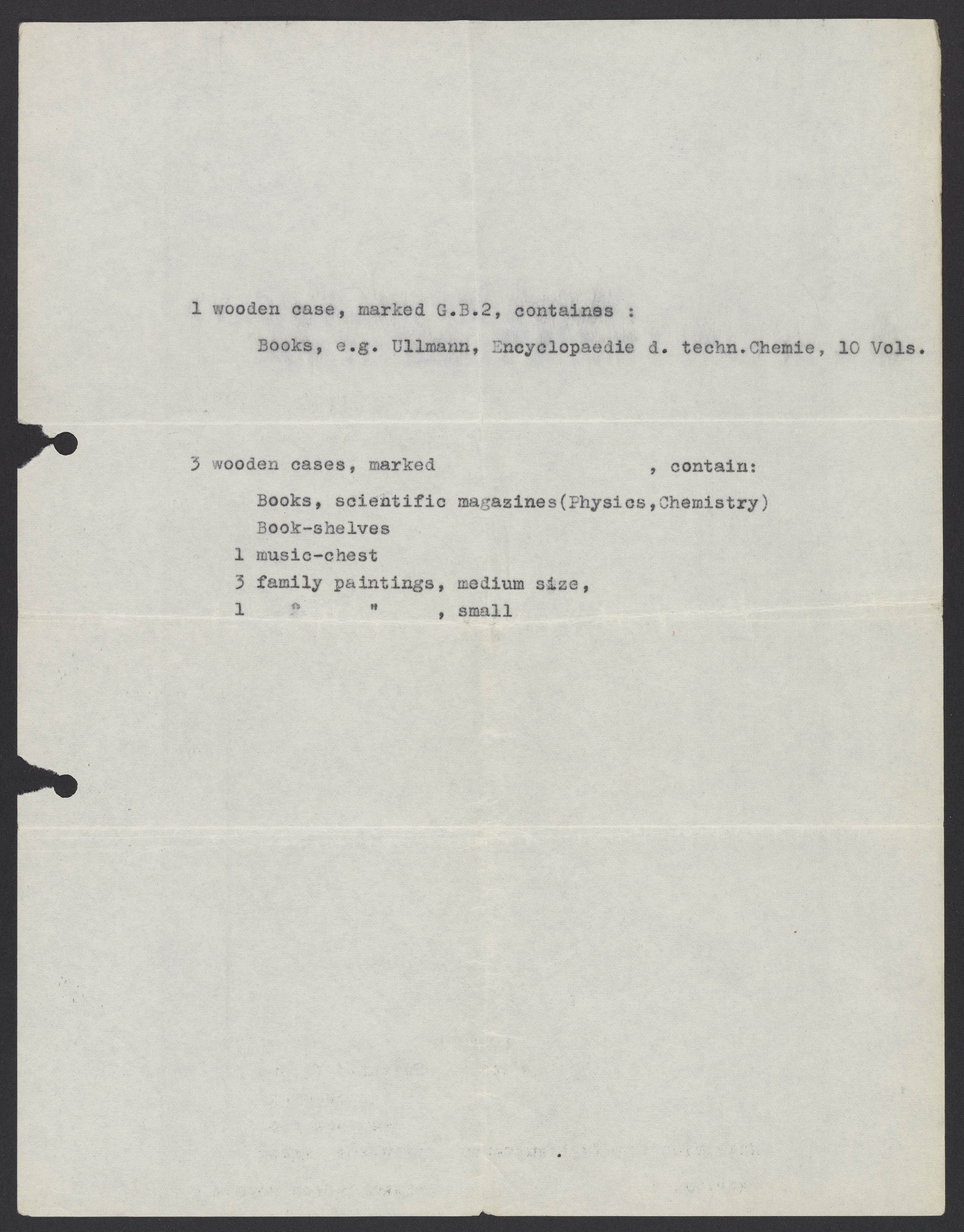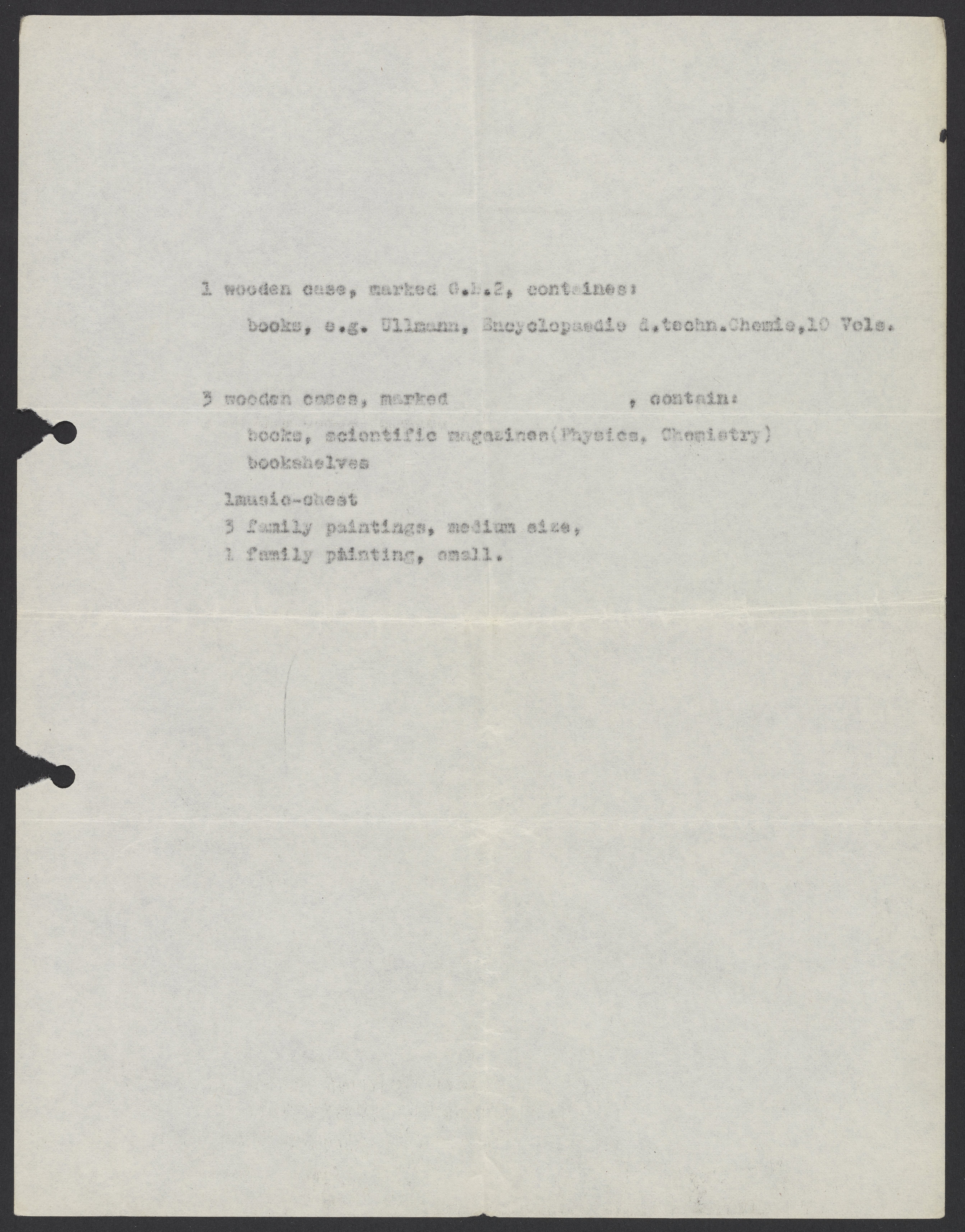 Small JPG1200 x 1533px — 200 KBLarge JPG2880 x 3678px — 1.5 MBFull-sized JPG5370 x 6858px — 5.5 MBOriginal fileTIFF — 5370 x 6858px — 105 MBList of objects belonging to the Bredig family. These items were possibly being shipped out of Germany to Max Bredig (1902-1977) in the United States or to the Netherlands where Georg Bredig (1868-1944) fled before joining Max in America.