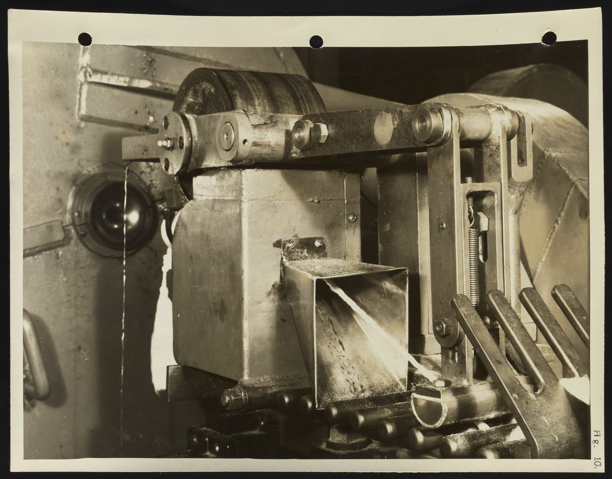 Close-up view of the modified feed brake assembly on a nylon staple cutter used at the DuPont plant in Seaford, Delaware during the early stages of nylon production and research.