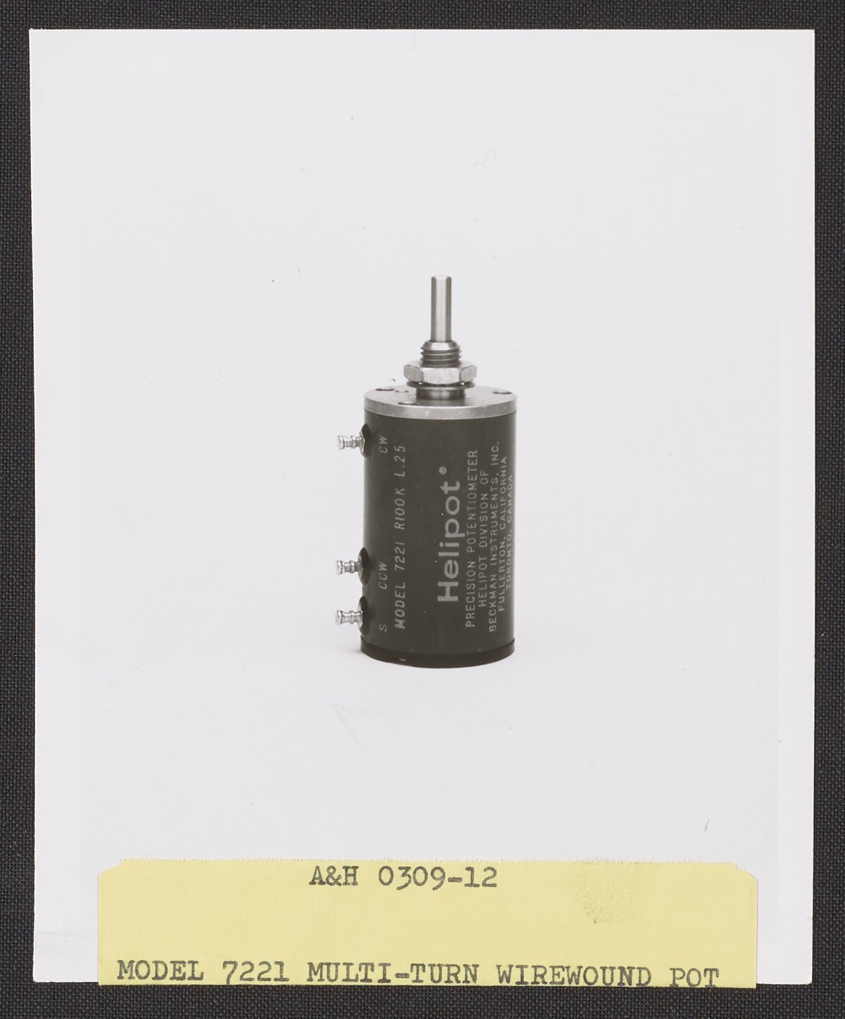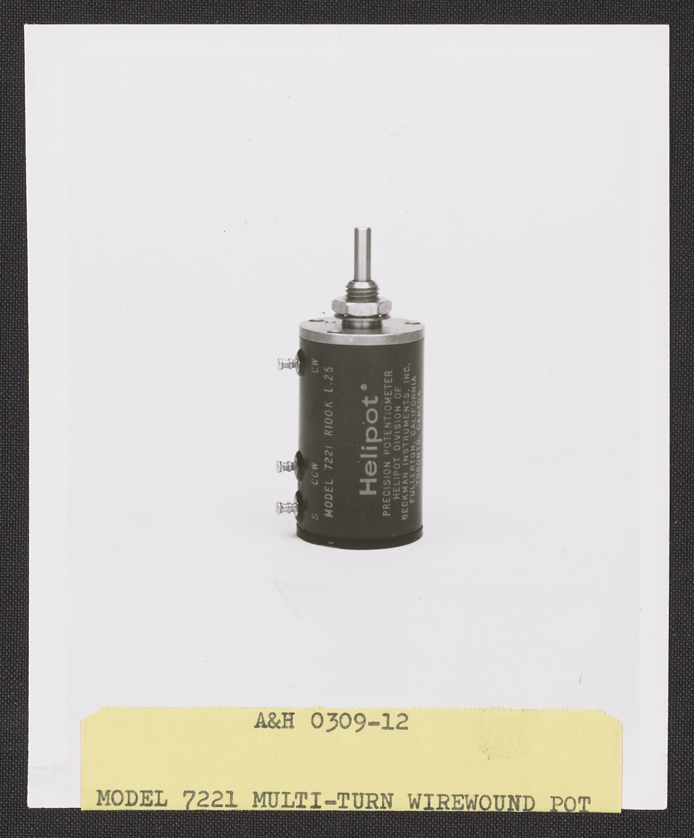 Armstrong & Hess. “Helipot Model 7221 Multi-Turn Wirewound Potentiometer,” 1950–1969. Beckman Historical Collection, Box 85. Science History Institute. Philadelphia. https://digital.sciencehistory.org/works/7s75dc75n.