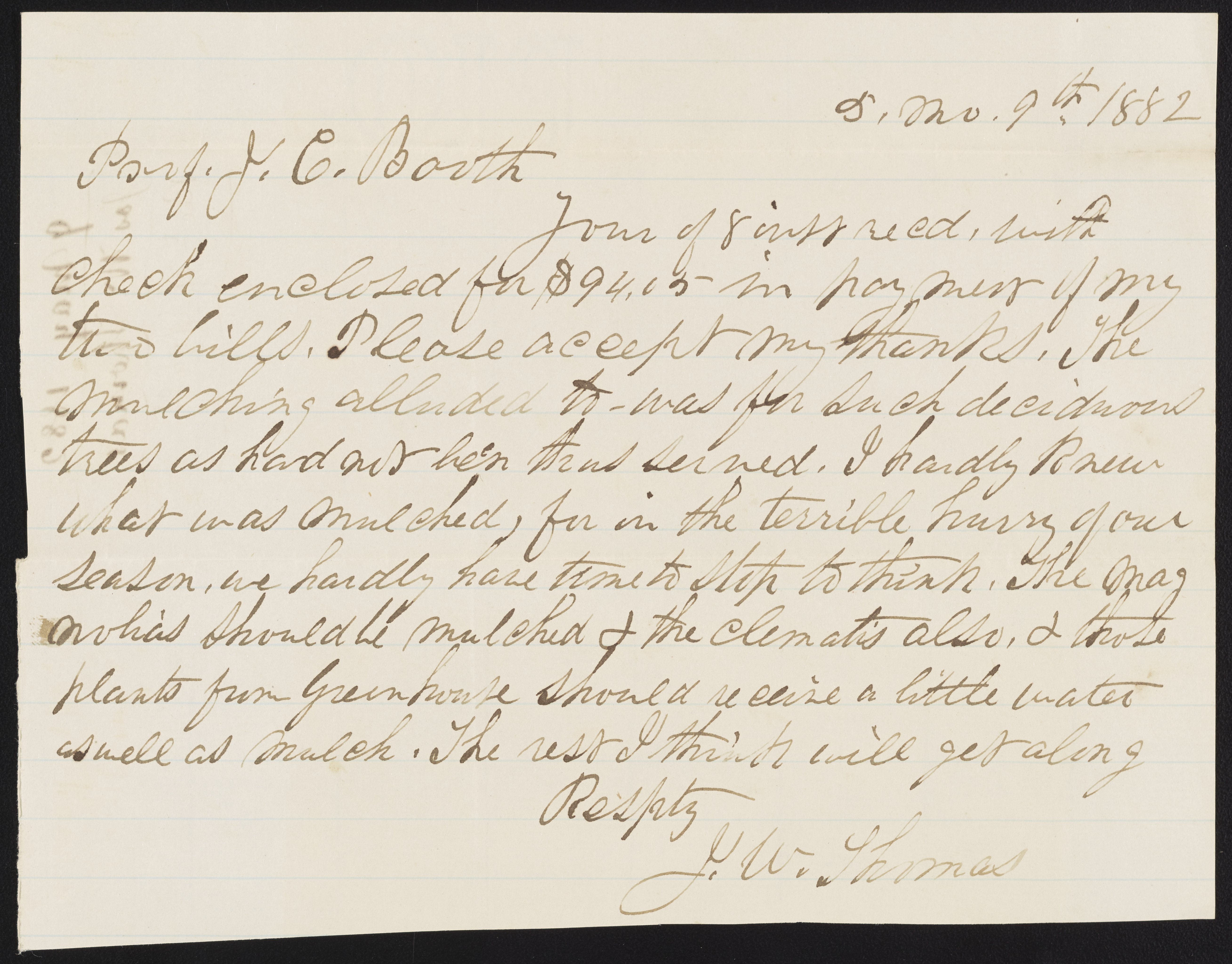 Letter from J.W. Thomas to James Curtis Booth, May 9, 1882