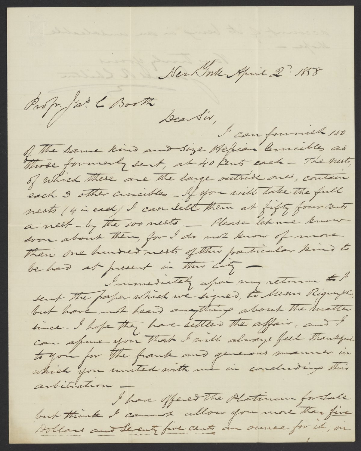Letter from Dr. J.R. Chilton to James Curtis Booth, April 2, 1858