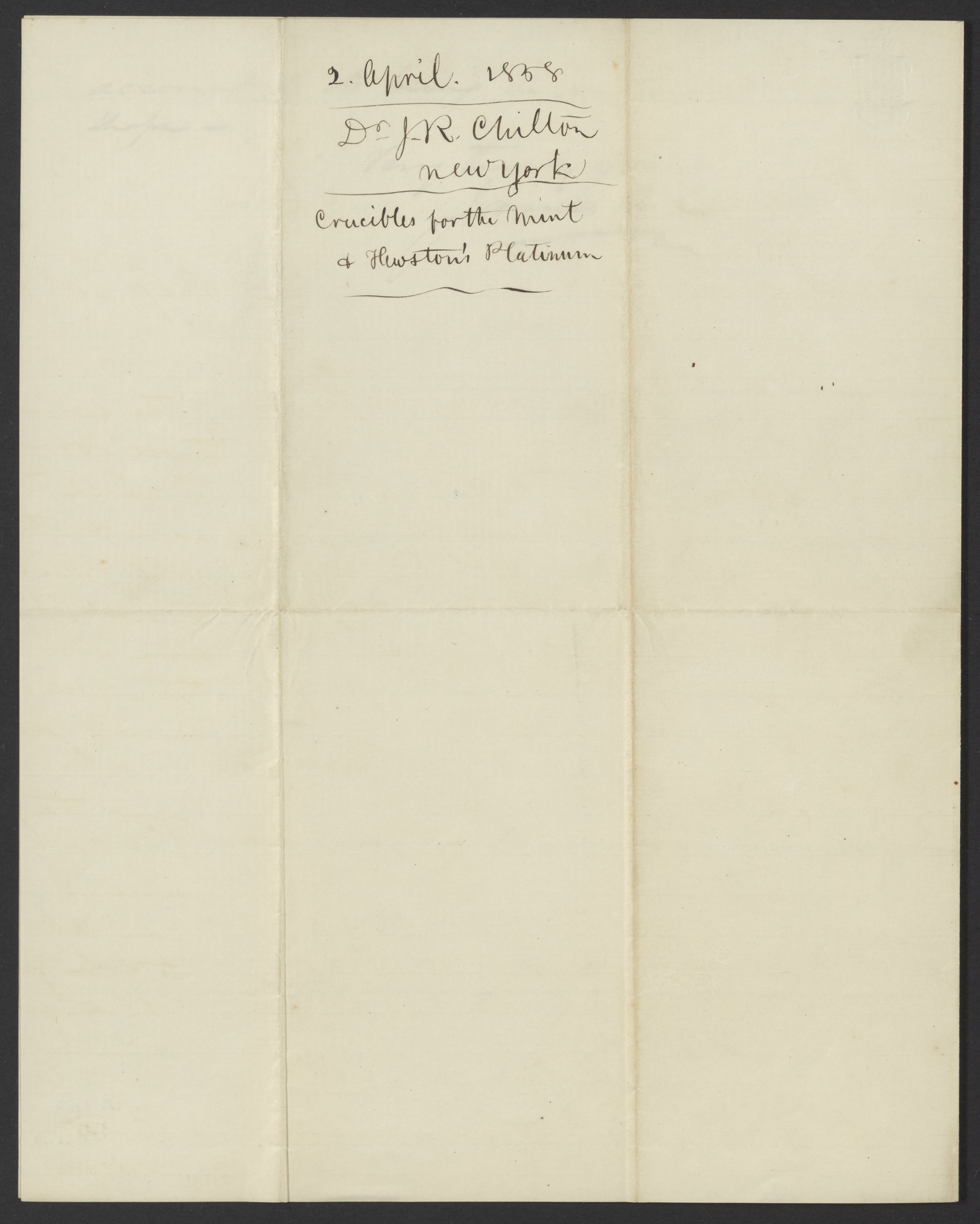 Chilton, James R., Dr. “Letter from Dr. J.R. Chilton to James Curtis Booth, April 2, 1858,” April 2, 1858. Papers of James Curtis Booth, Box 1, Folder 7. Science History Institute. Philadelphia. https://digital.sciencehistory.org/works/7t0113f.