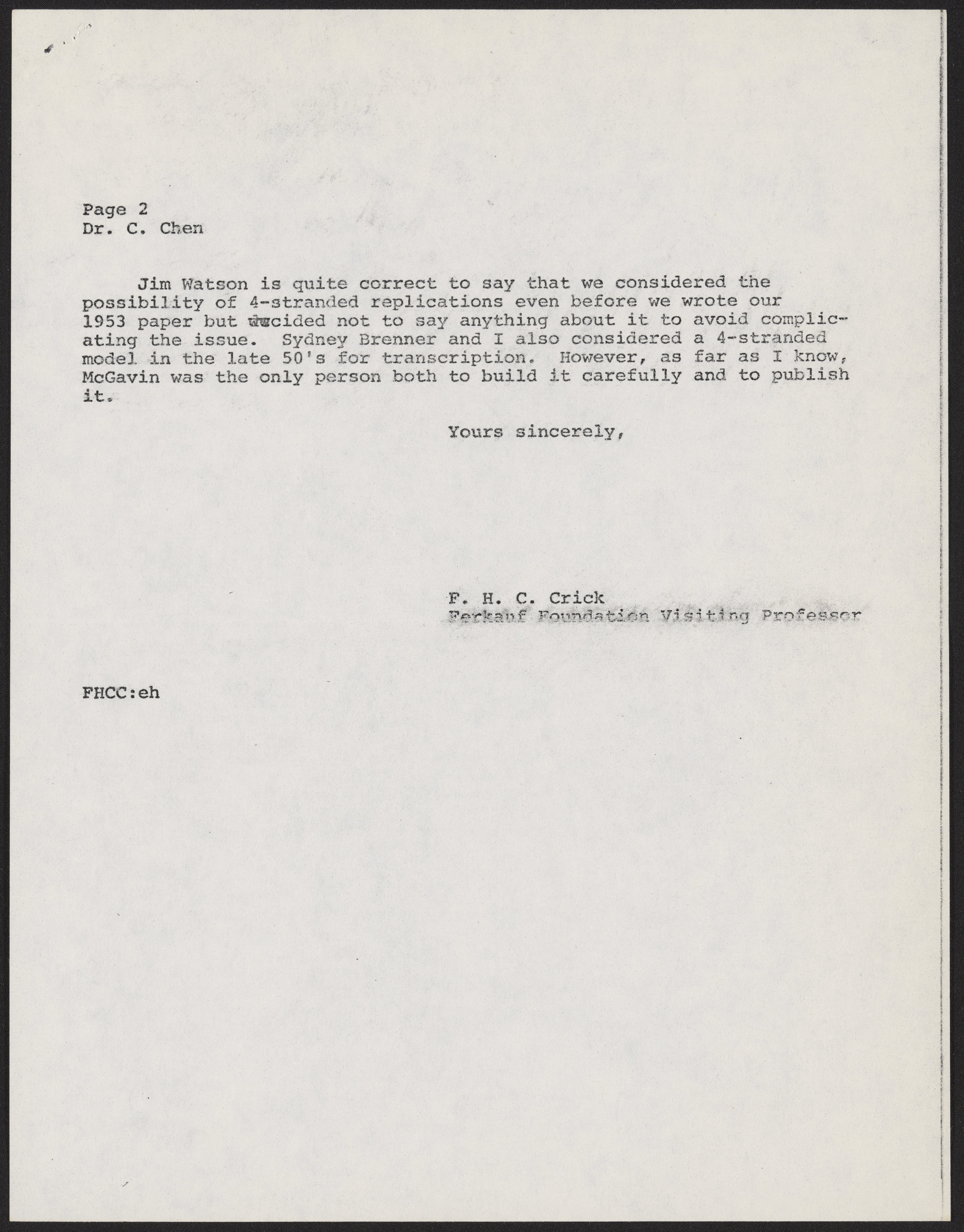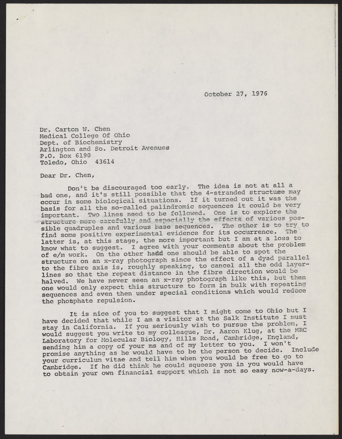 Crick, Francis. “Letter from Francis Crick to Carton W. Chen, October 27, 1976,” October 27, 1976. History of Molecular Biology Collection, Box 19, Folder 25. Science History Institute. Philadelphia. https://digital.sciencehistory.org/works/7t1bae0.