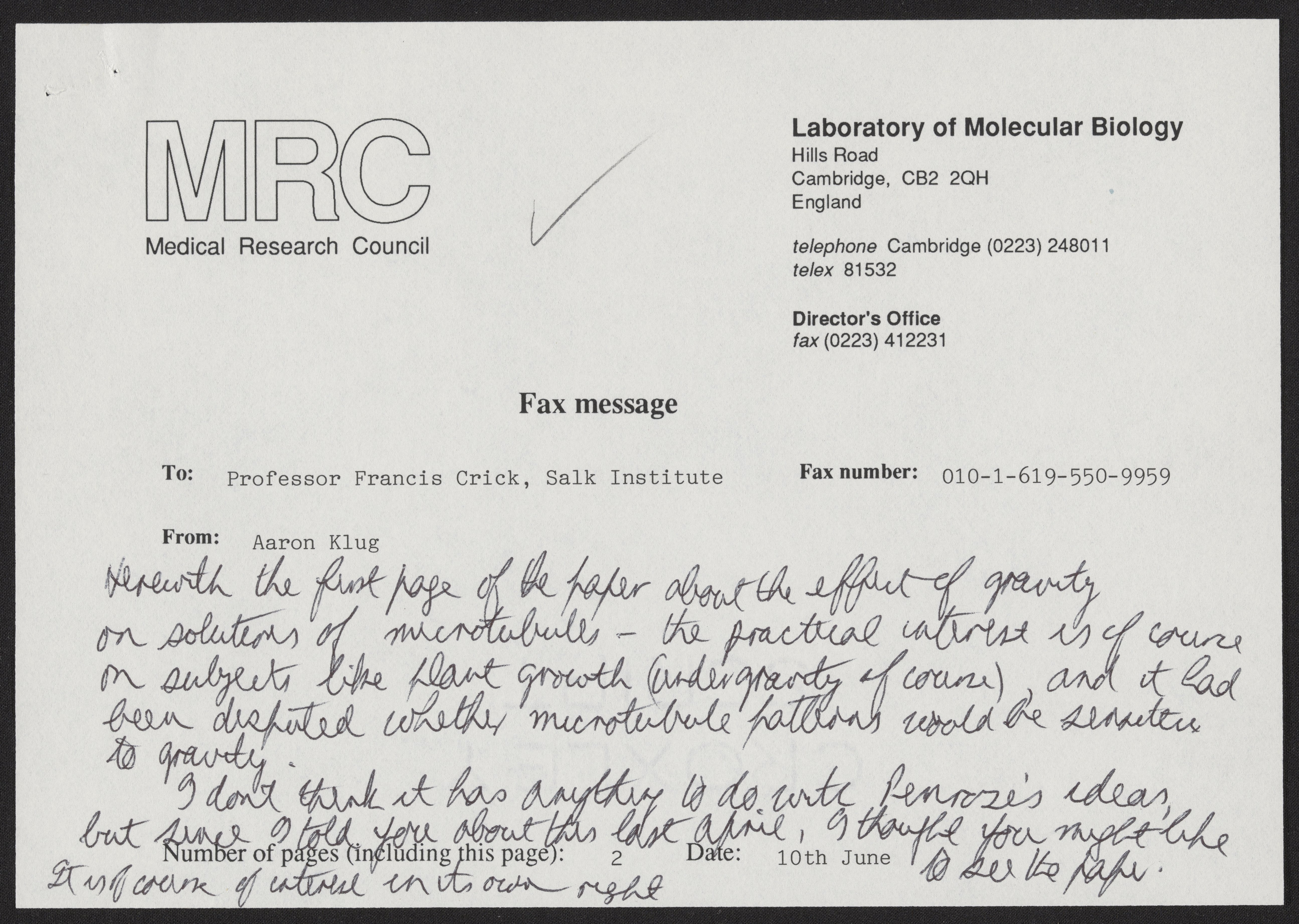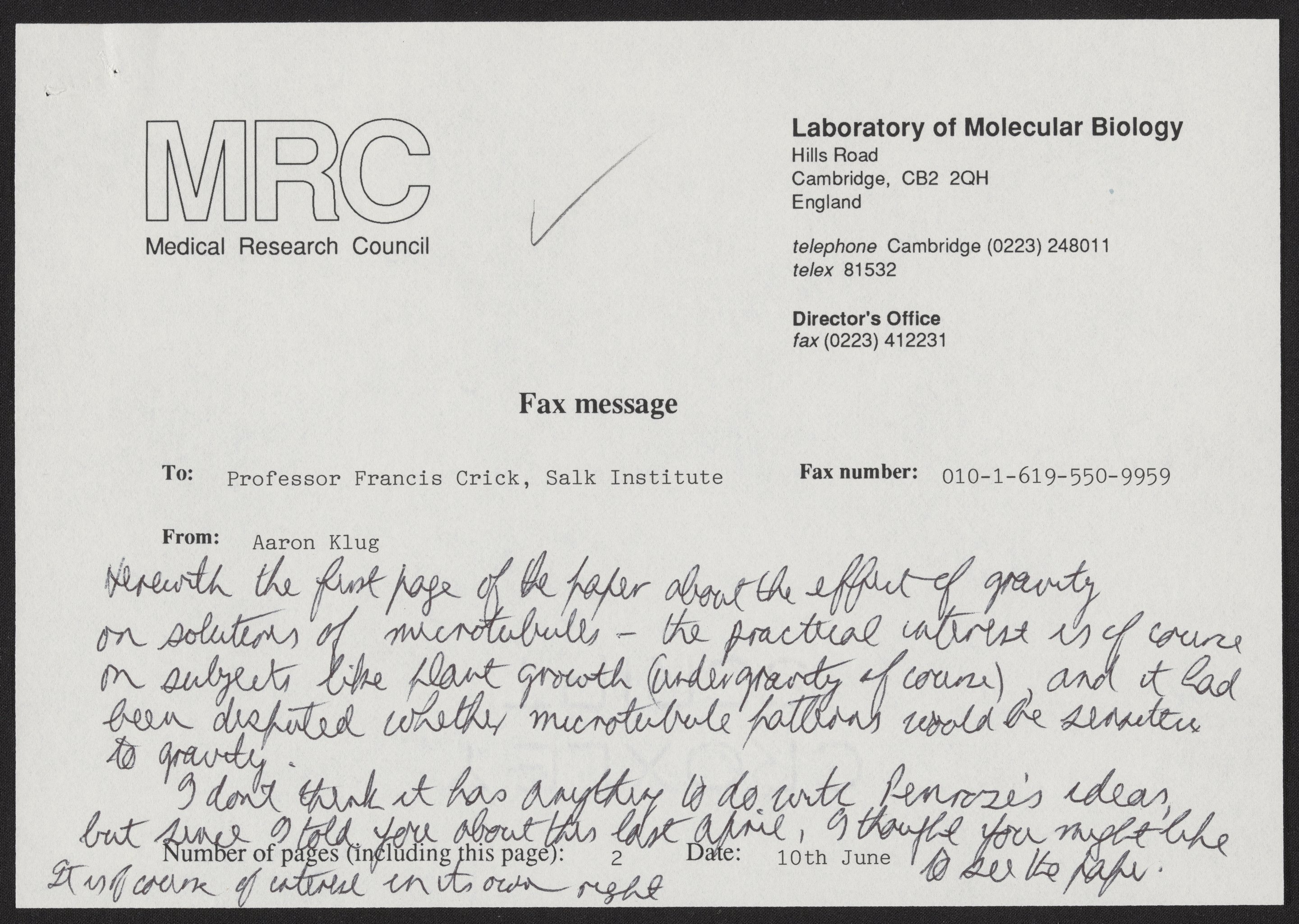 Klug, A. (Aaron), Sir. “Fax from Aaron Klug to Francis Crick, June 10, 1992,” circa 1992. History of Molecular Biology Collection, Box 20, Folder 5. Science History Institute. Philadelphia. https://digital.sciencehistory.org/works/7t6j4a5.
