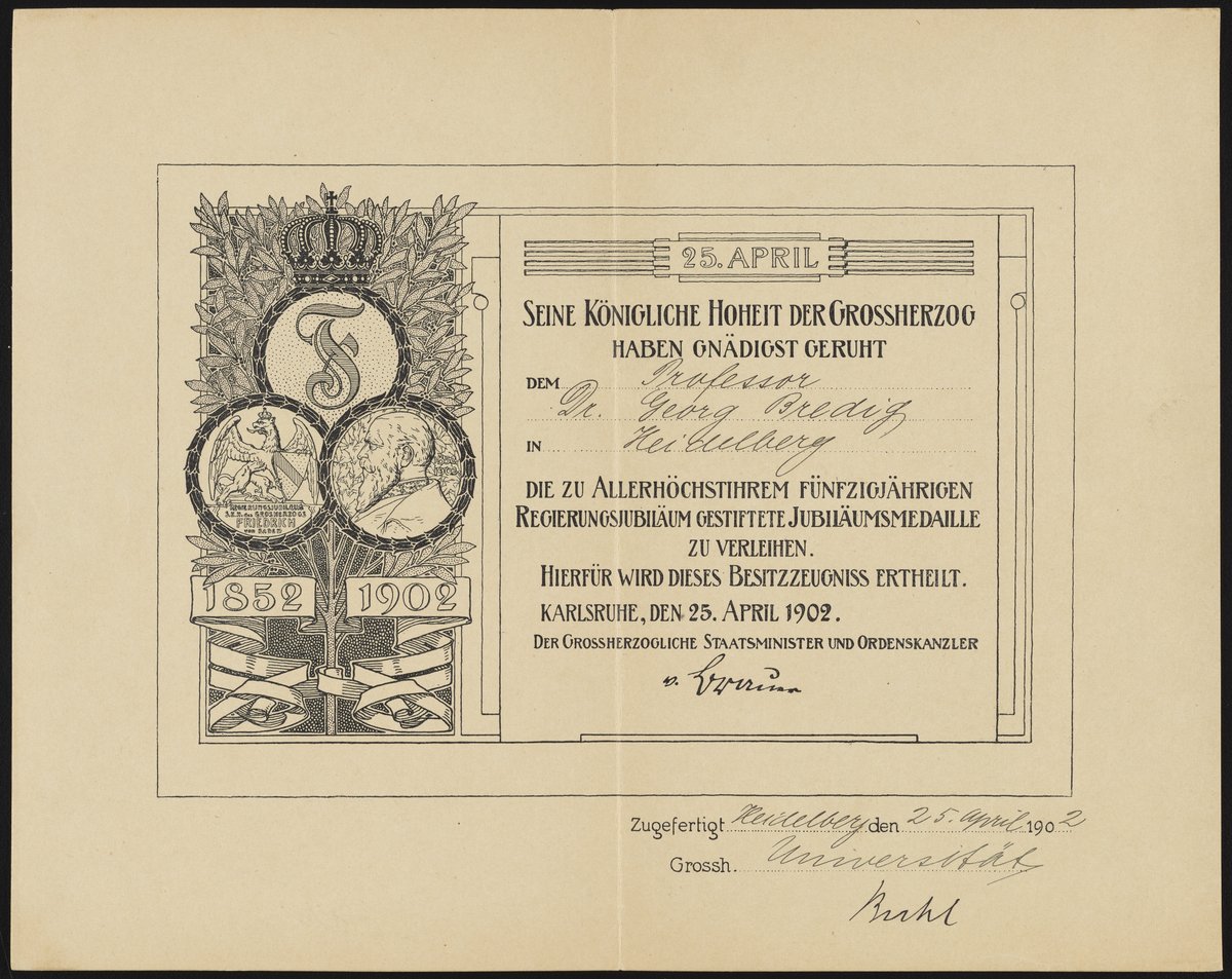 Official diploma granting Georg Bredig (1868-1944) the Jubilee Medal awarded on April 25, 1902, the occasion of the 50th anniversary (the golden jubilee) of Grand Duke Friedrich I (1826-1907) assuming the throne of Baden. The diploma originally would have been accompanied by the medal itself.