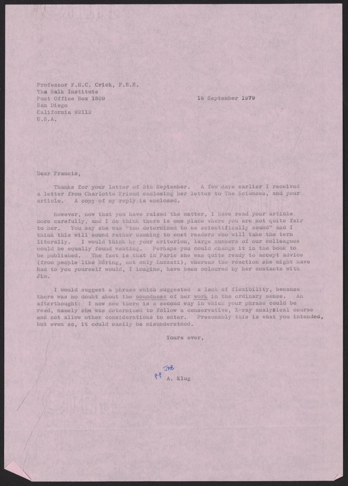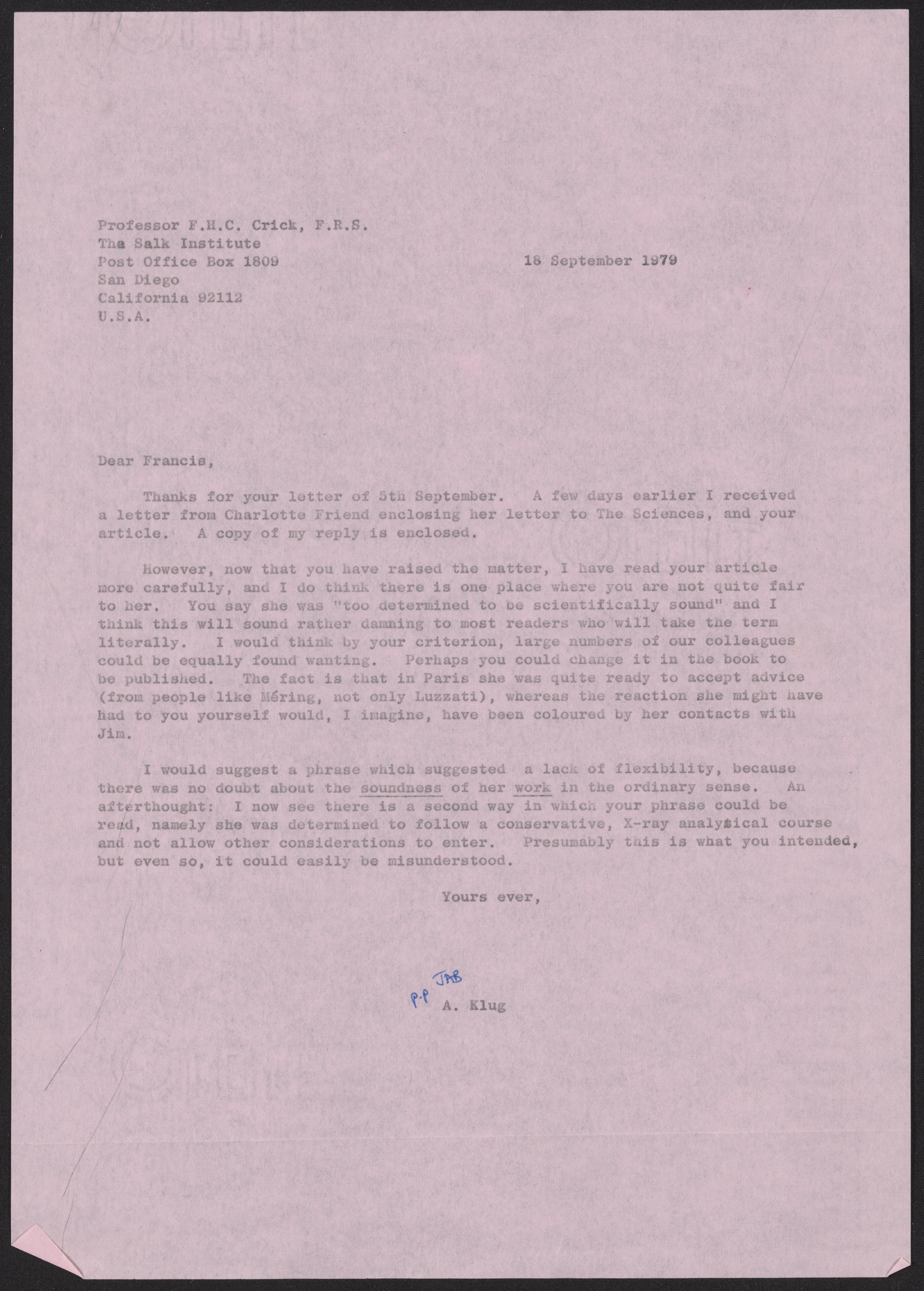 “Letter from Aaron Klug to Francis Crick, September 18, 1979,” September 18, 1979. History of Molecular Biology Collection, Box 20, Folder 3. Science History Institute. Philadelphia. https://digital.sciencehistory.org/works/7vrts24.