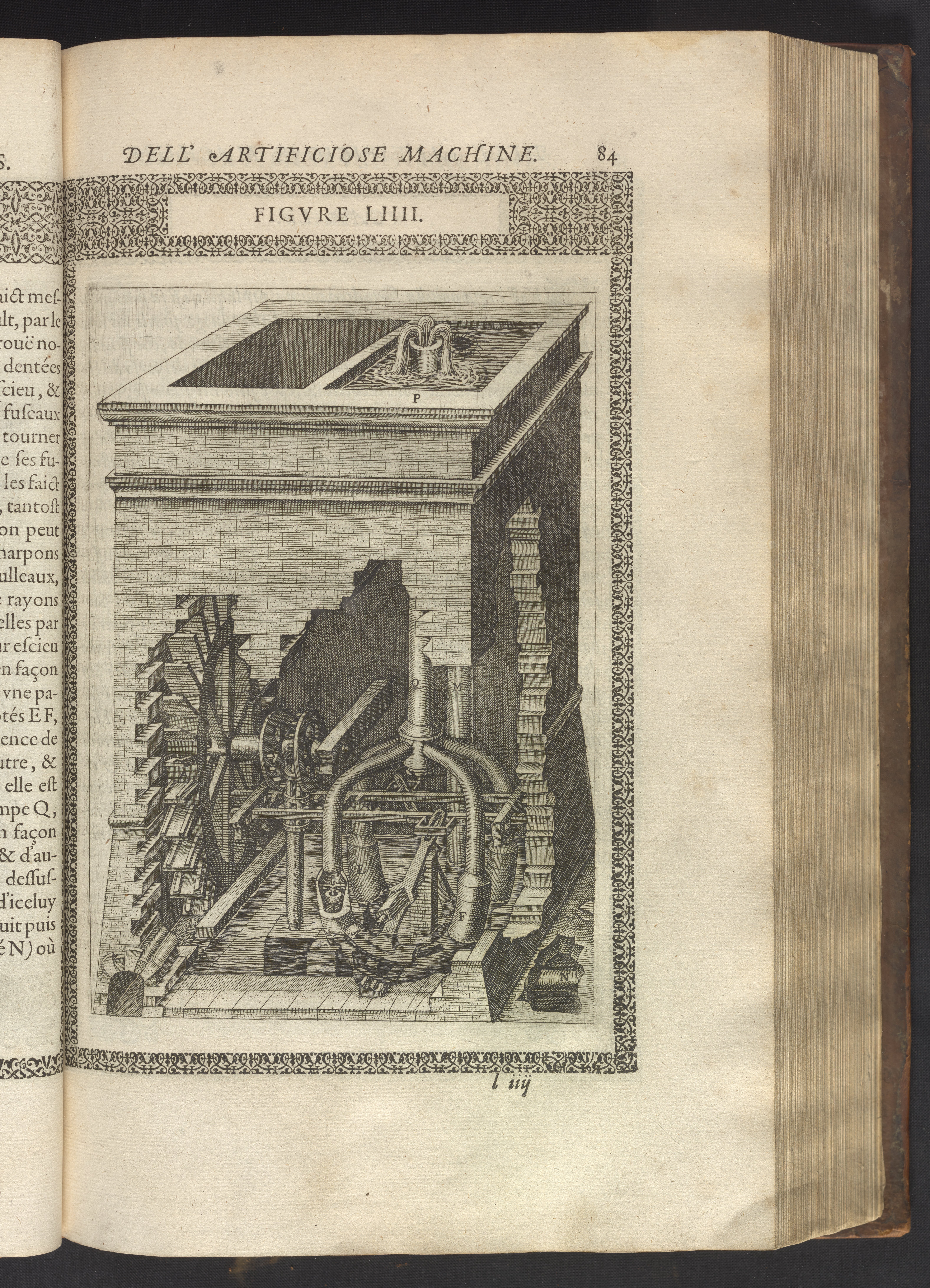 Mechanics: undershot waterwheel; toroidal force pump; conical valve; double interrupted crown gears and lantern gear; lantern and rack; horizontal working beam; roller guides.