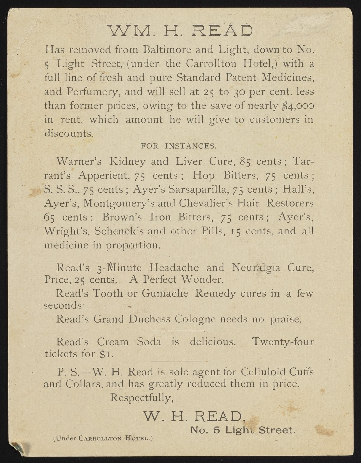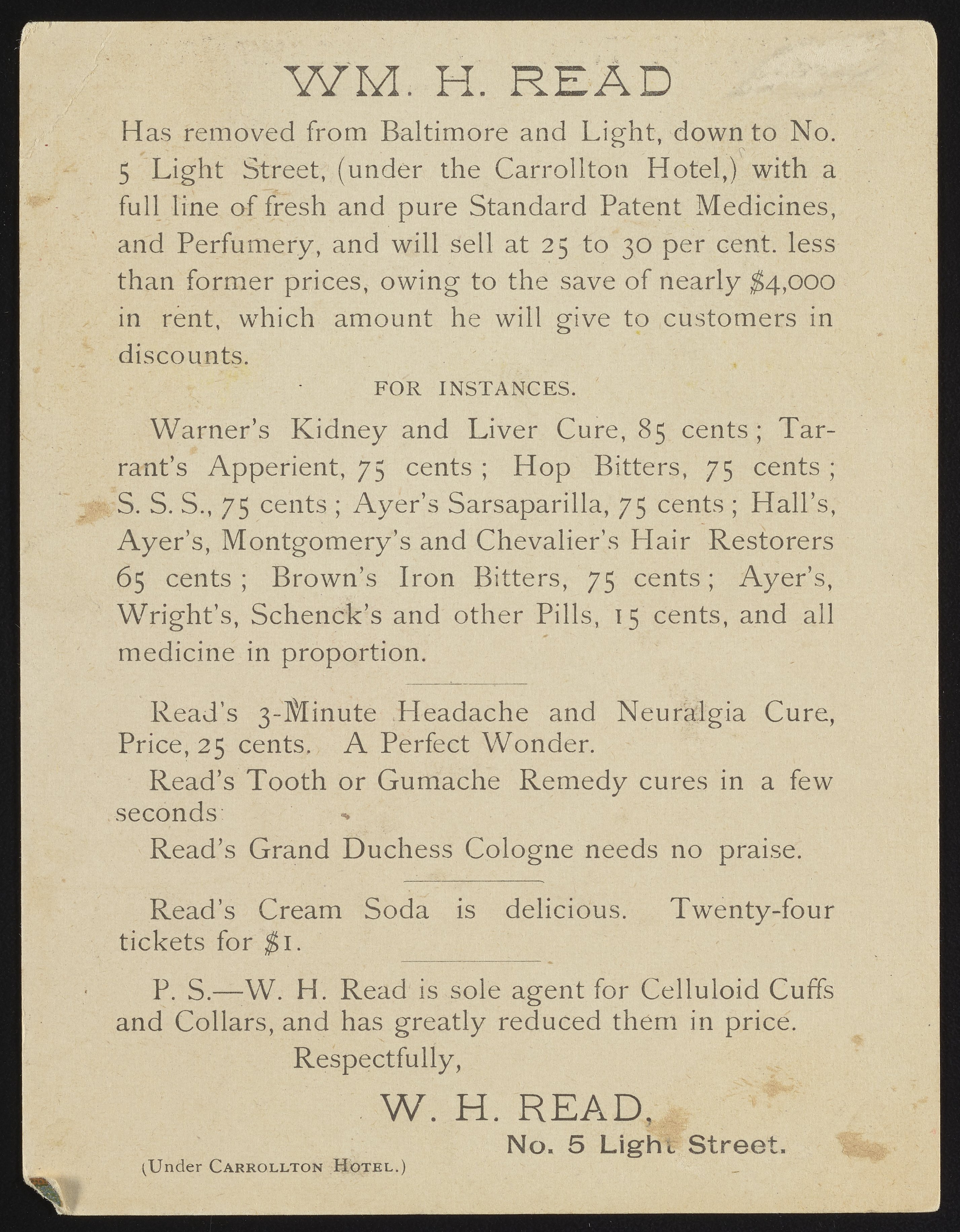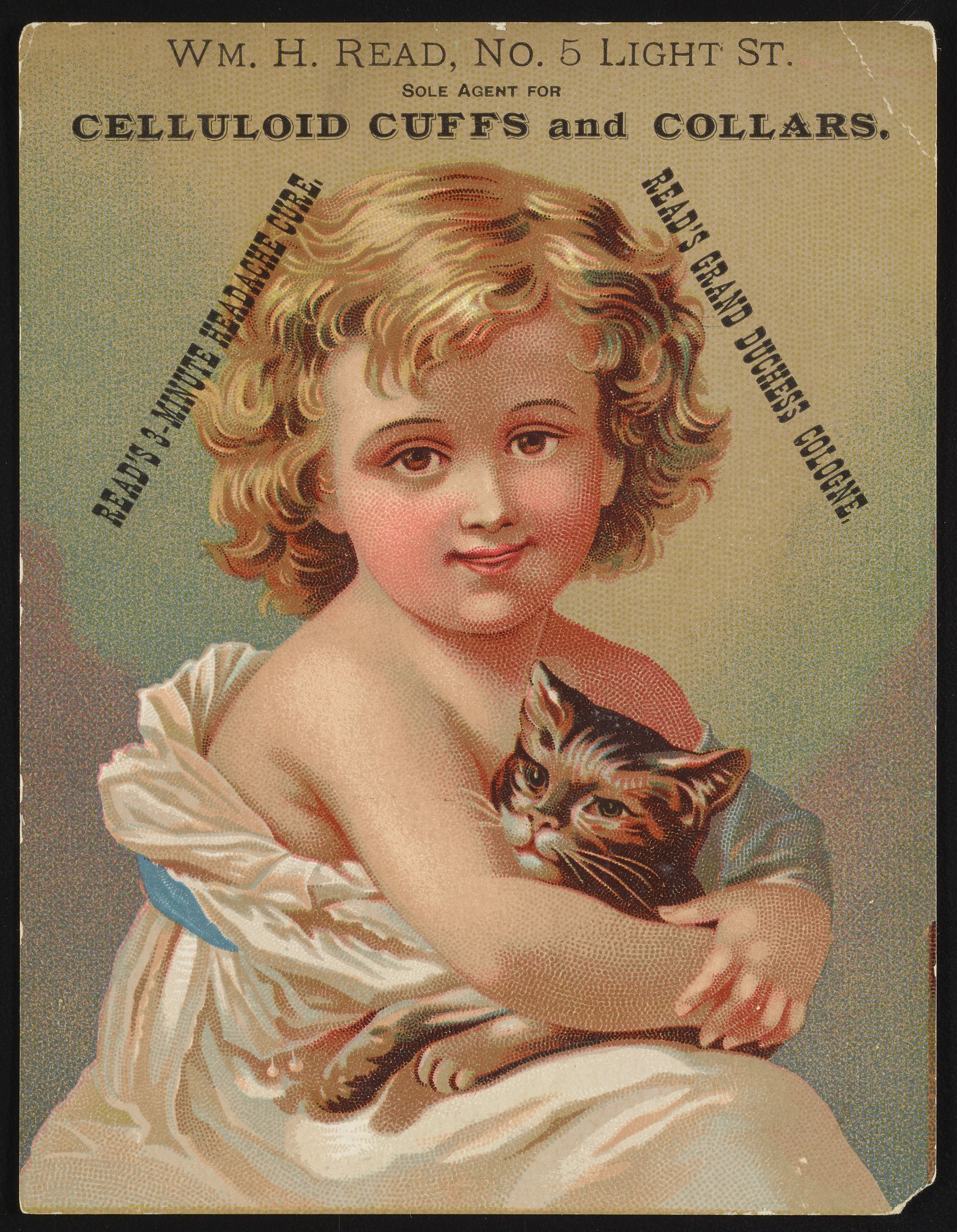 Trade card for William H. Read, sole agent for celluloid cuffs and collars, depicts a young girl holding a cat. Card is also stamped "Read's 3-minute headache cure" and "Read's grand duchess cologne." Verso is an ad for William H. Read with a list of remedies, cures and assorted wares for sale.