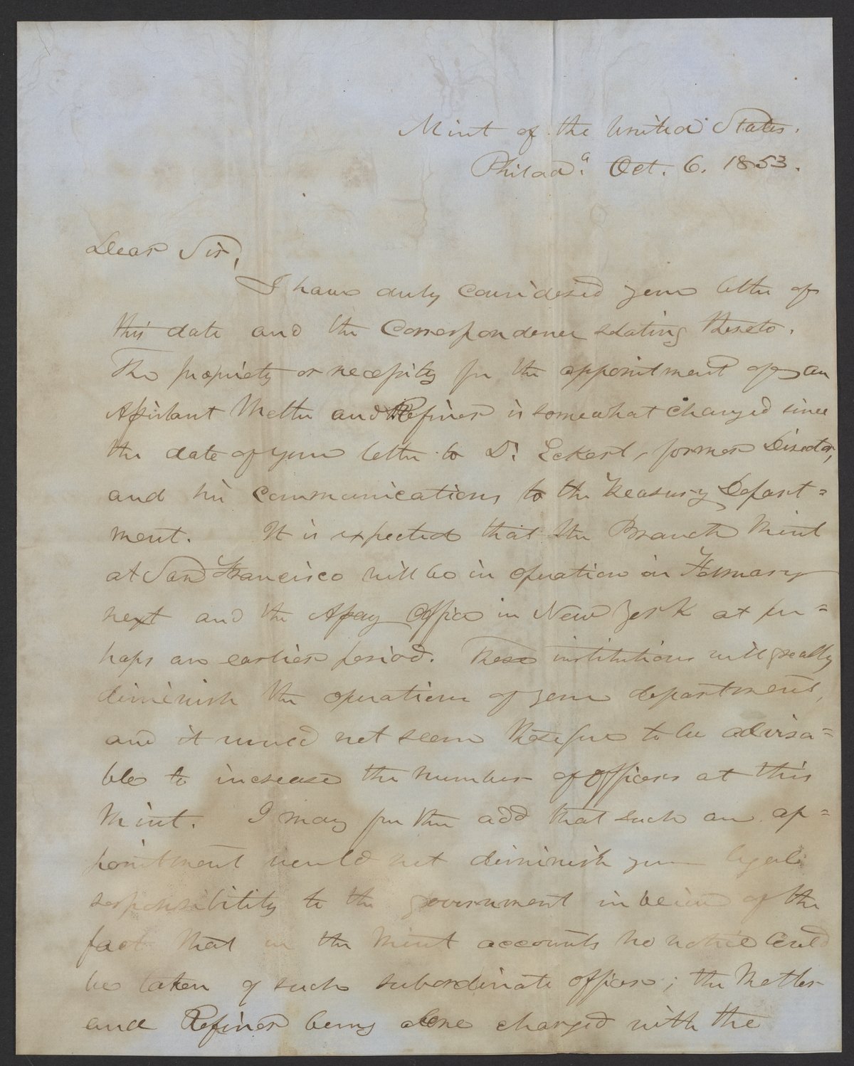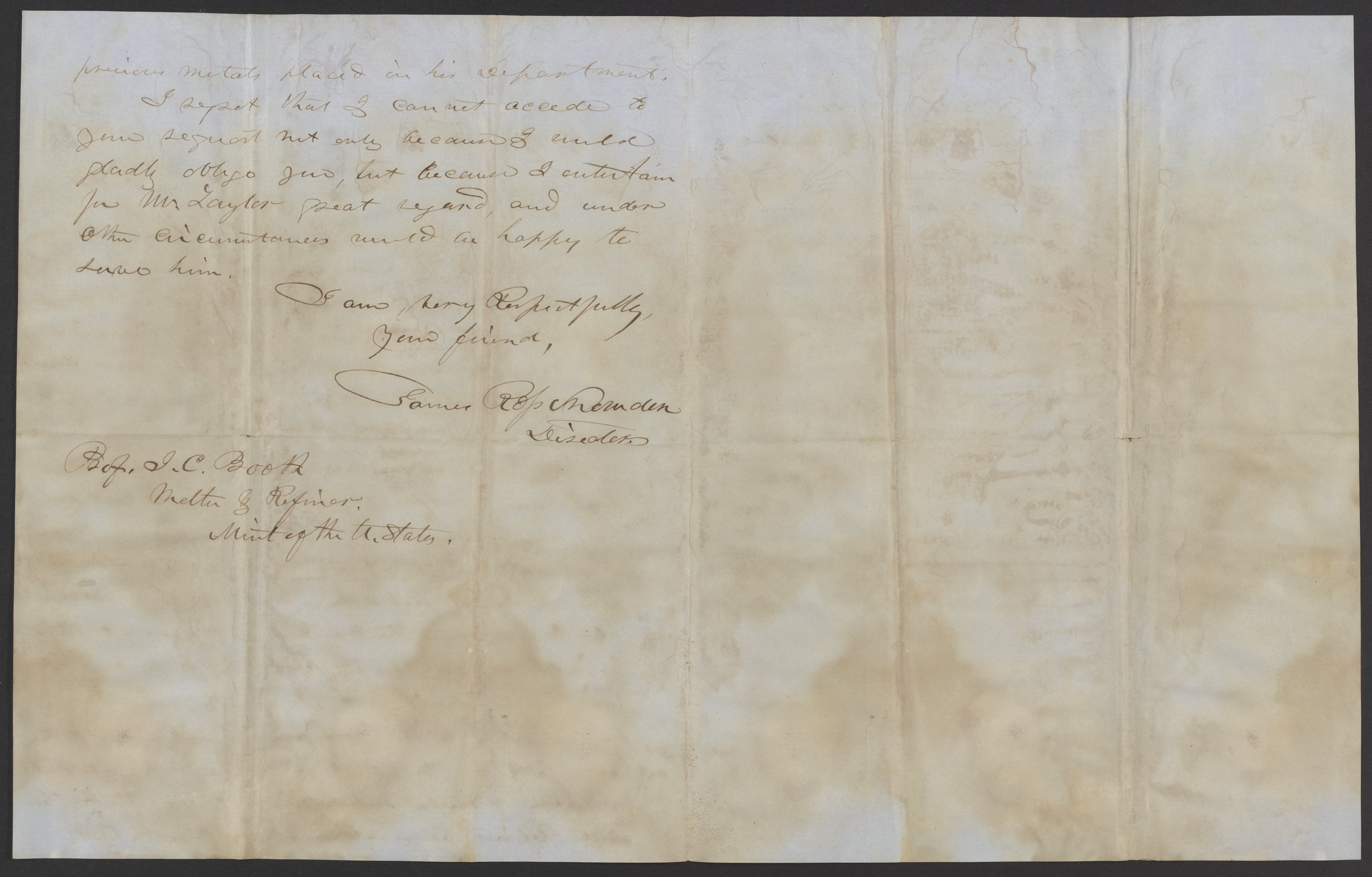 Small JPG1200 x 1498px — 254 KBLarge JPG2880 x 3595px — 1.3 MBFull-sized JPG3246 x 4052px — 1.6 MBOriginal fileTIFF — 3246 x 4052px — 37.7 MBJames Ross Snowden (1809-1878) informs James Curtis Booth (1810-1888) that the new United States Mint operations in New York and San Francisco will result in a diminished number of positions at the Philadelphia Mint.