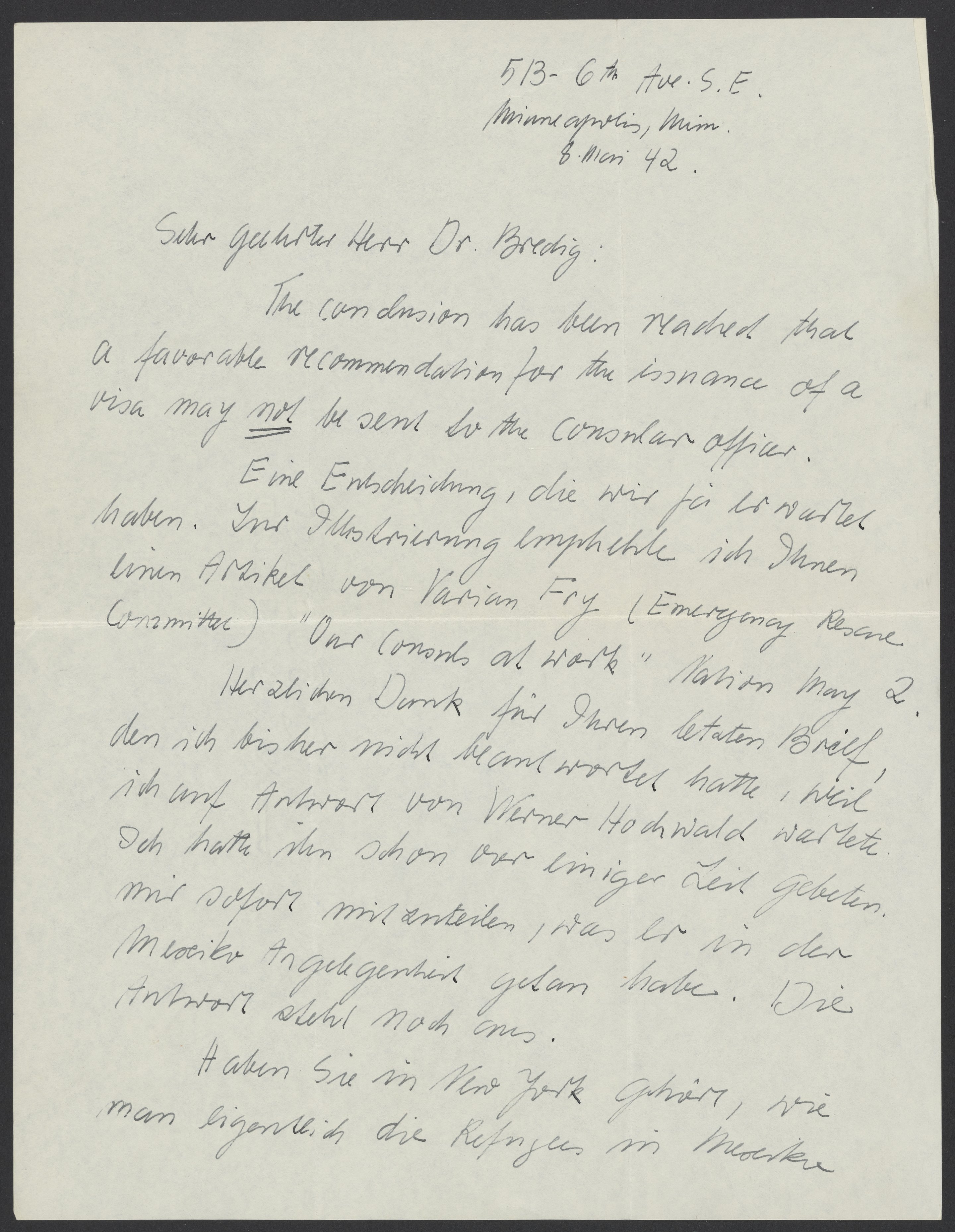 Letter from Ilse Wolfsberg to Max Bredig, May 8, 1942