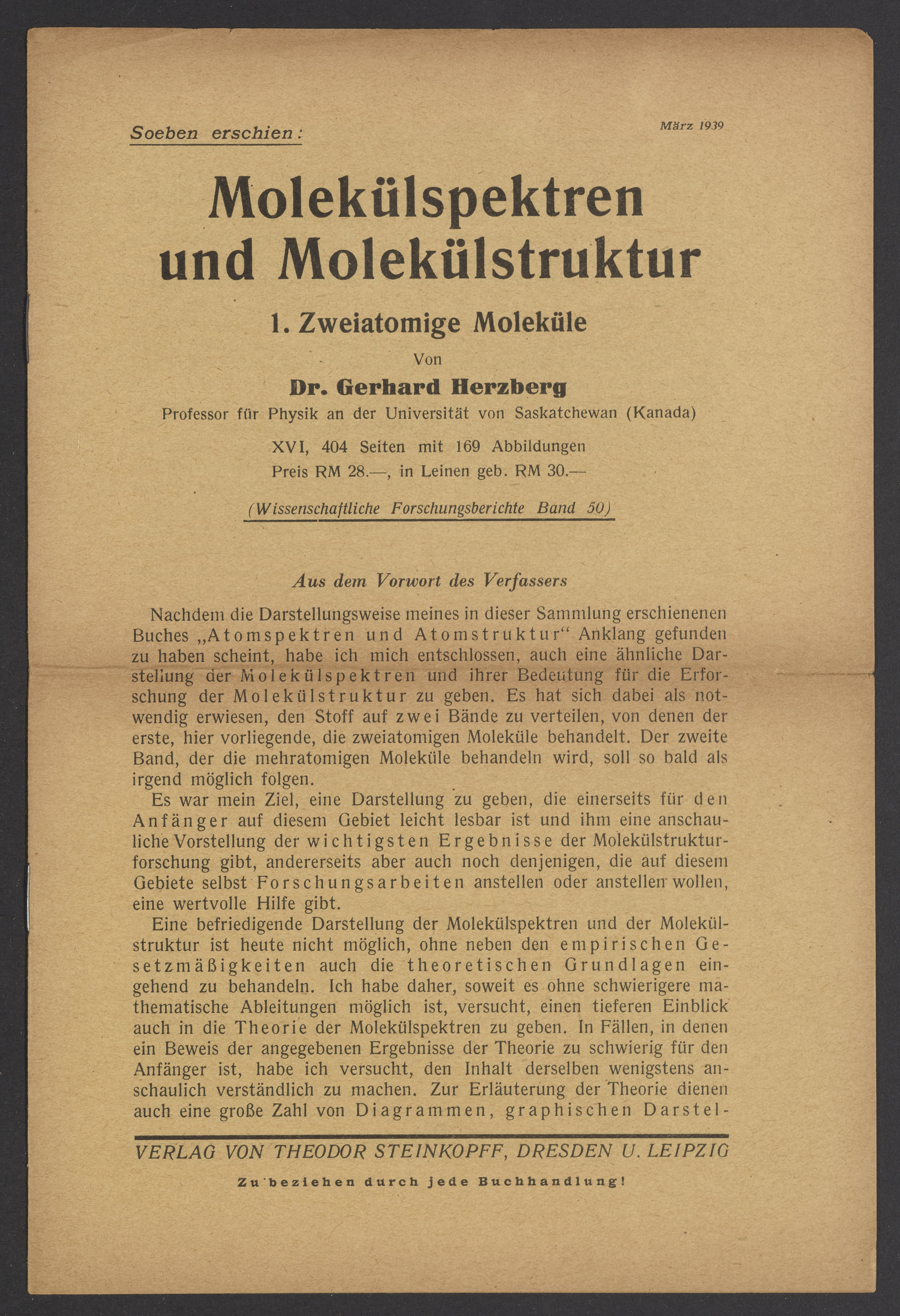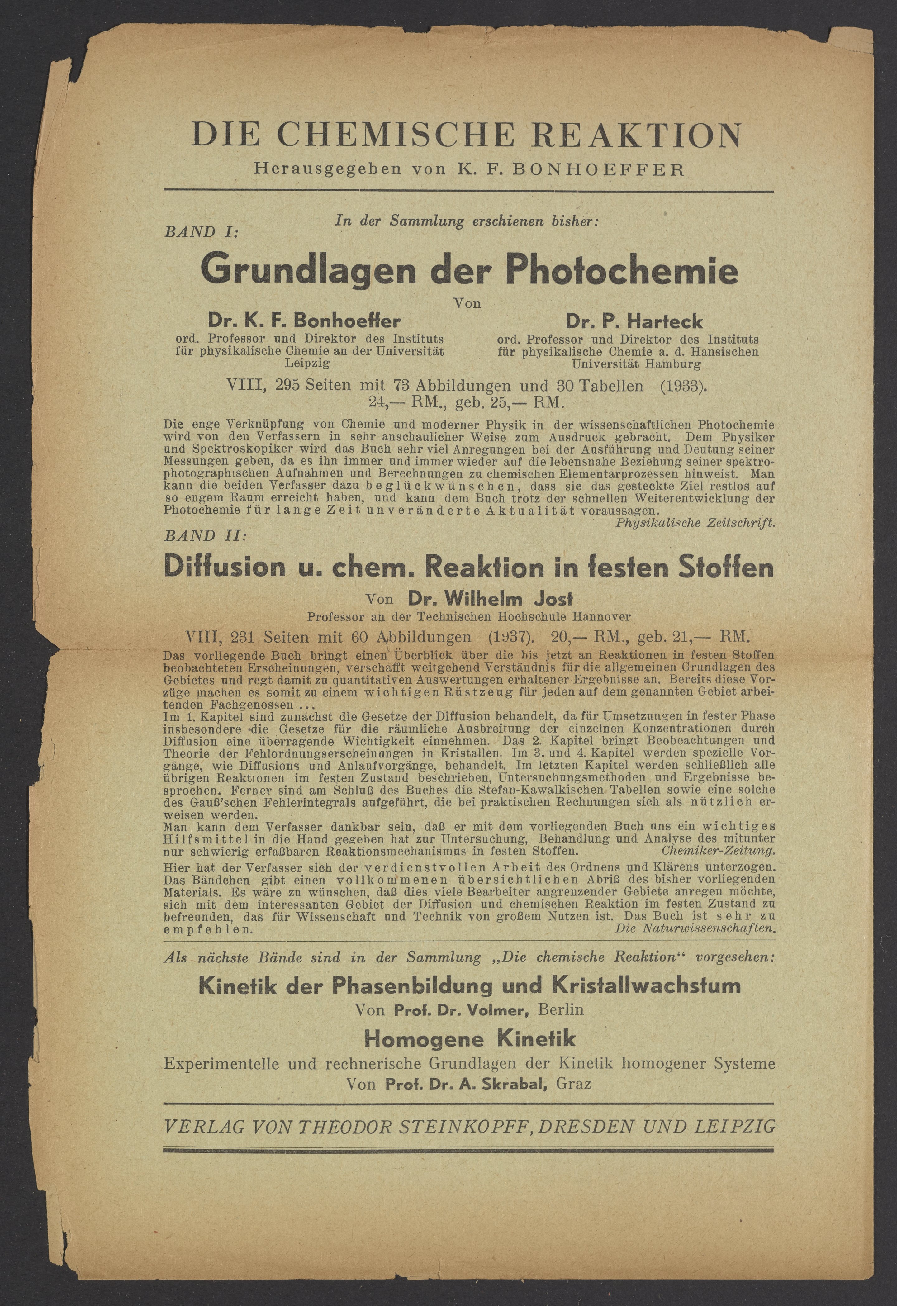 Titles mentioned are Der Disperse Bau Der Festen Systeme by D. Bararew, Chemische Gasreaktionen by H. -J. Schumacher, Molekulspektren und Molekulstruktur by Gerbard Herzberg (1904-1999), Kinetik der Phasenbildung by Max Volmer (1885-1965), Diffision und chemische Reaktion in festen Stoffen by Wilhelm Jost (1903-1988), Die Boden-Kolloide by E. Ehrenberg.