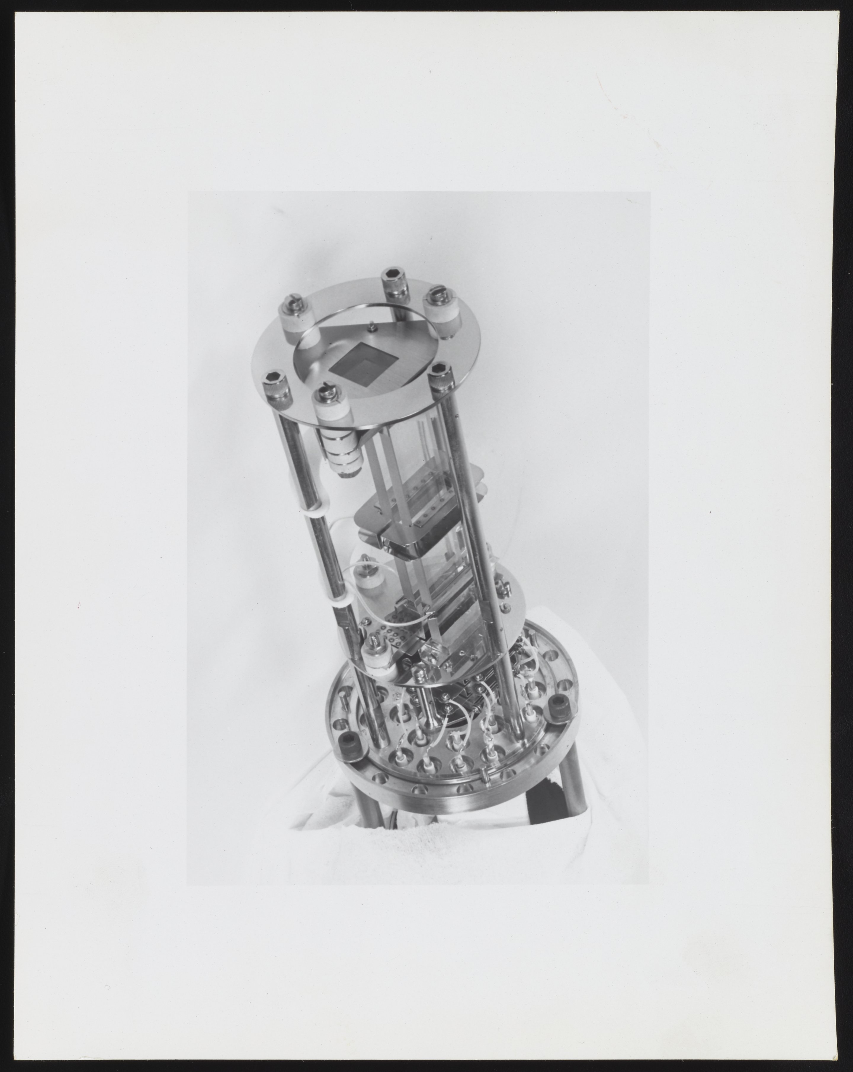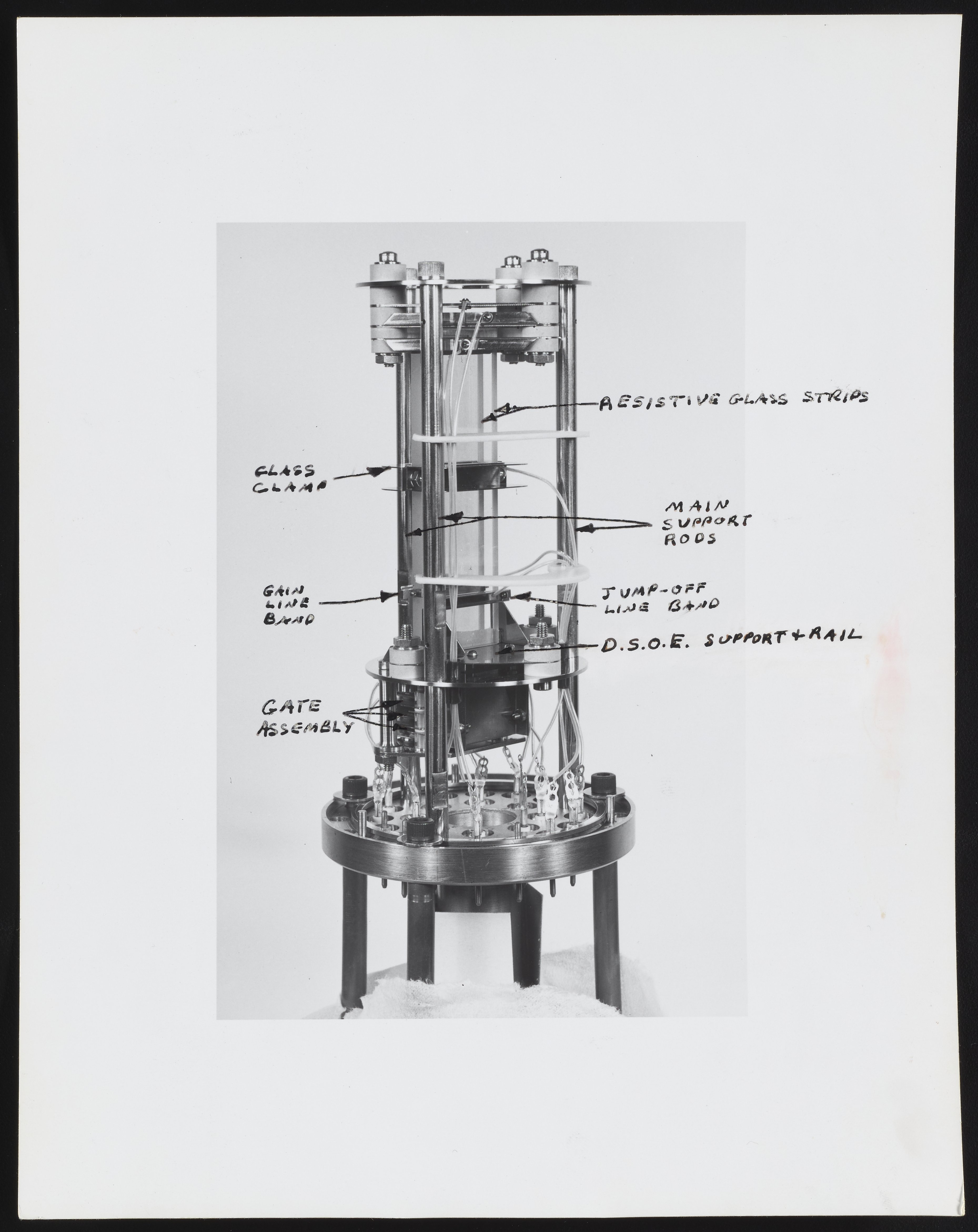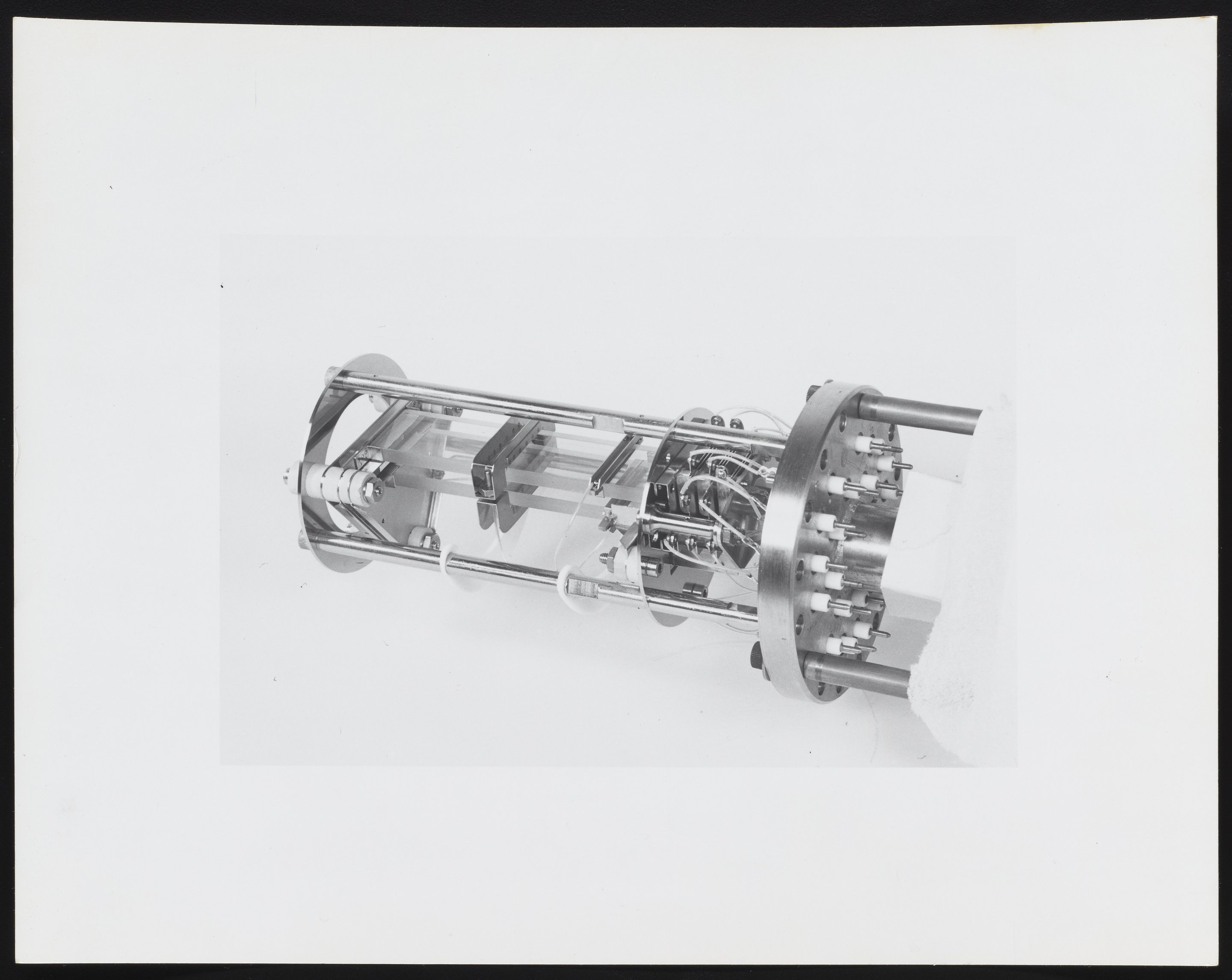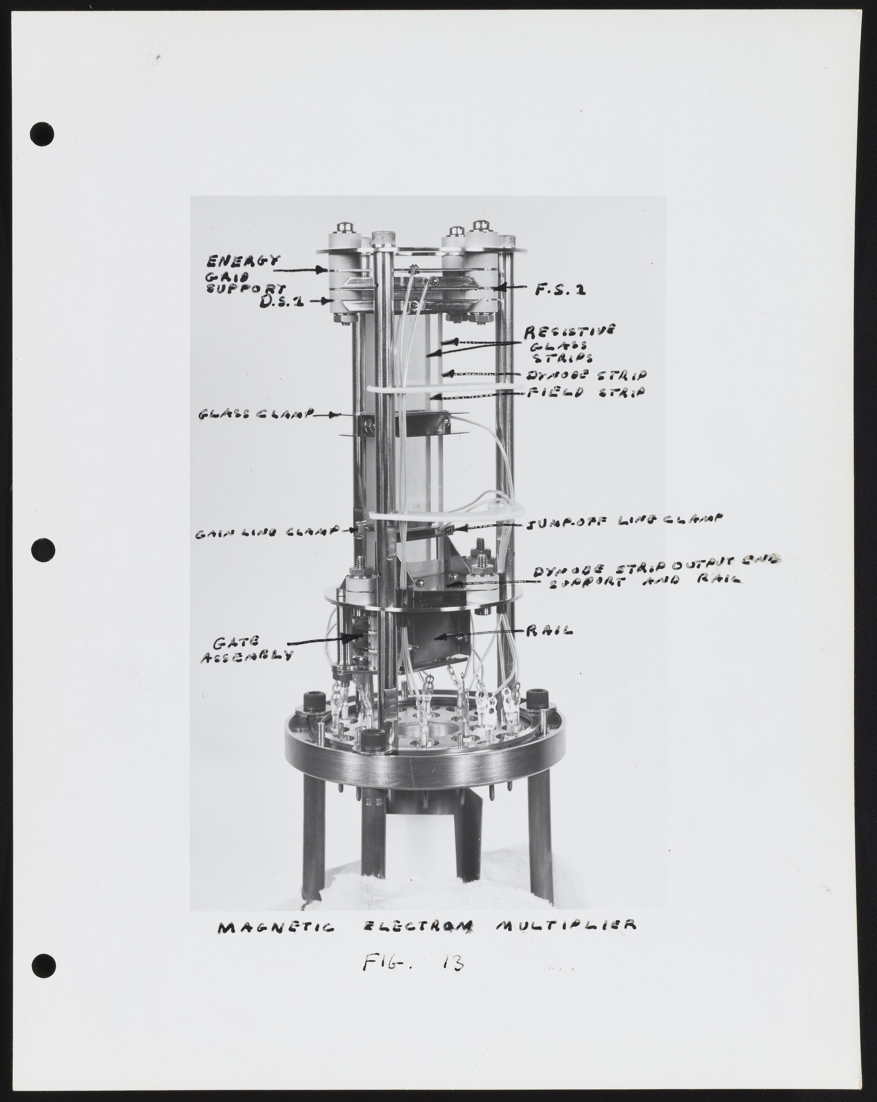Small JPG1200 x 955px — 79.0 KBLarge JPG2880 x 2292px — 349 KBFull-sized JPG4672 x 3718px — 852 KBOriginal fileTIFF — 4672 x 3718px — 49.7 MBSeries of photographs depicting an ion source and Model 202-G2 Magnetic Electron Multiplier designed for use with the Bendix Corporation Time-of-Flight Mass Spectrometer. Several of the photographs are annotated with identifications for various component parts, including the dynode and field strips, gate assembly, and glass clamp.