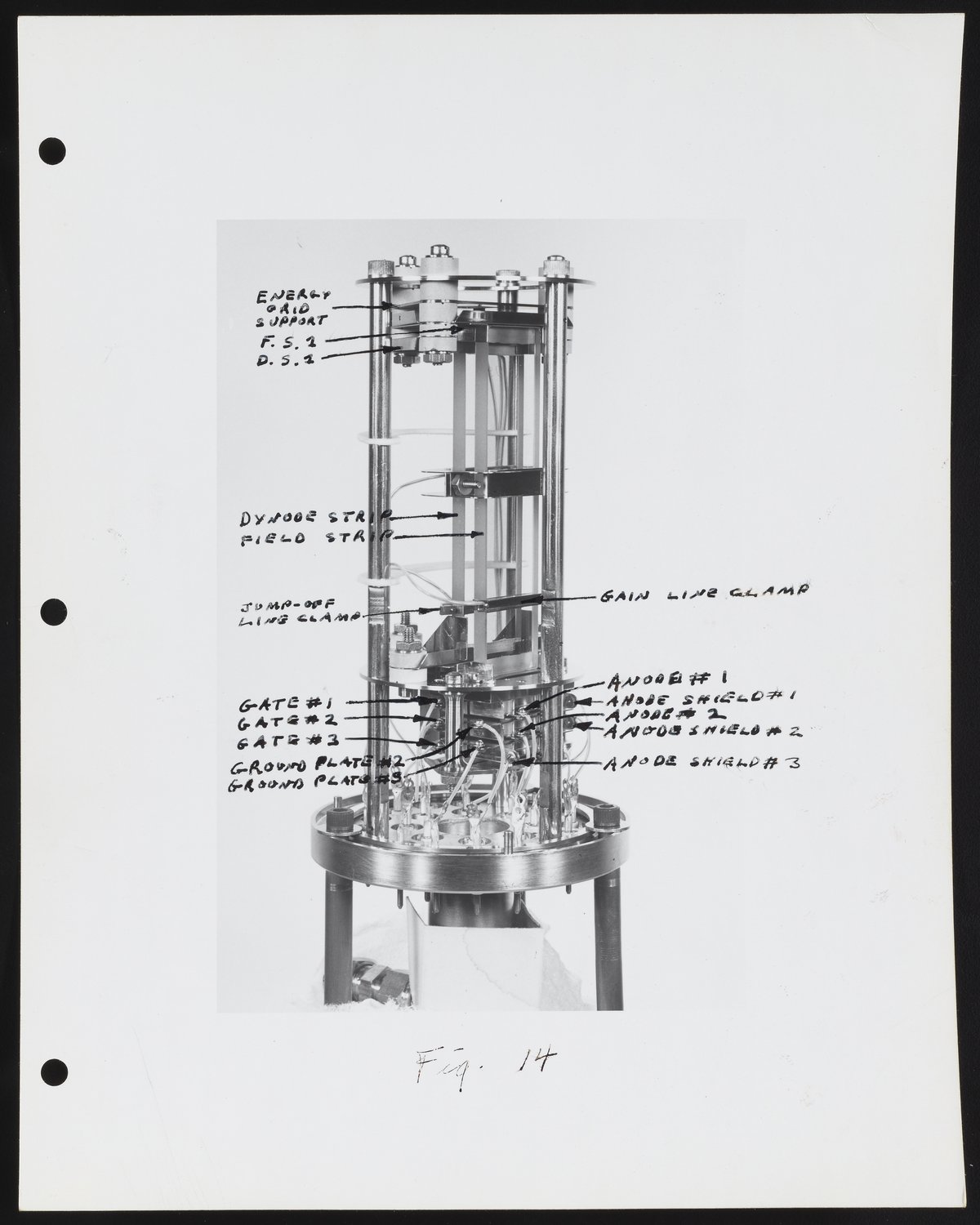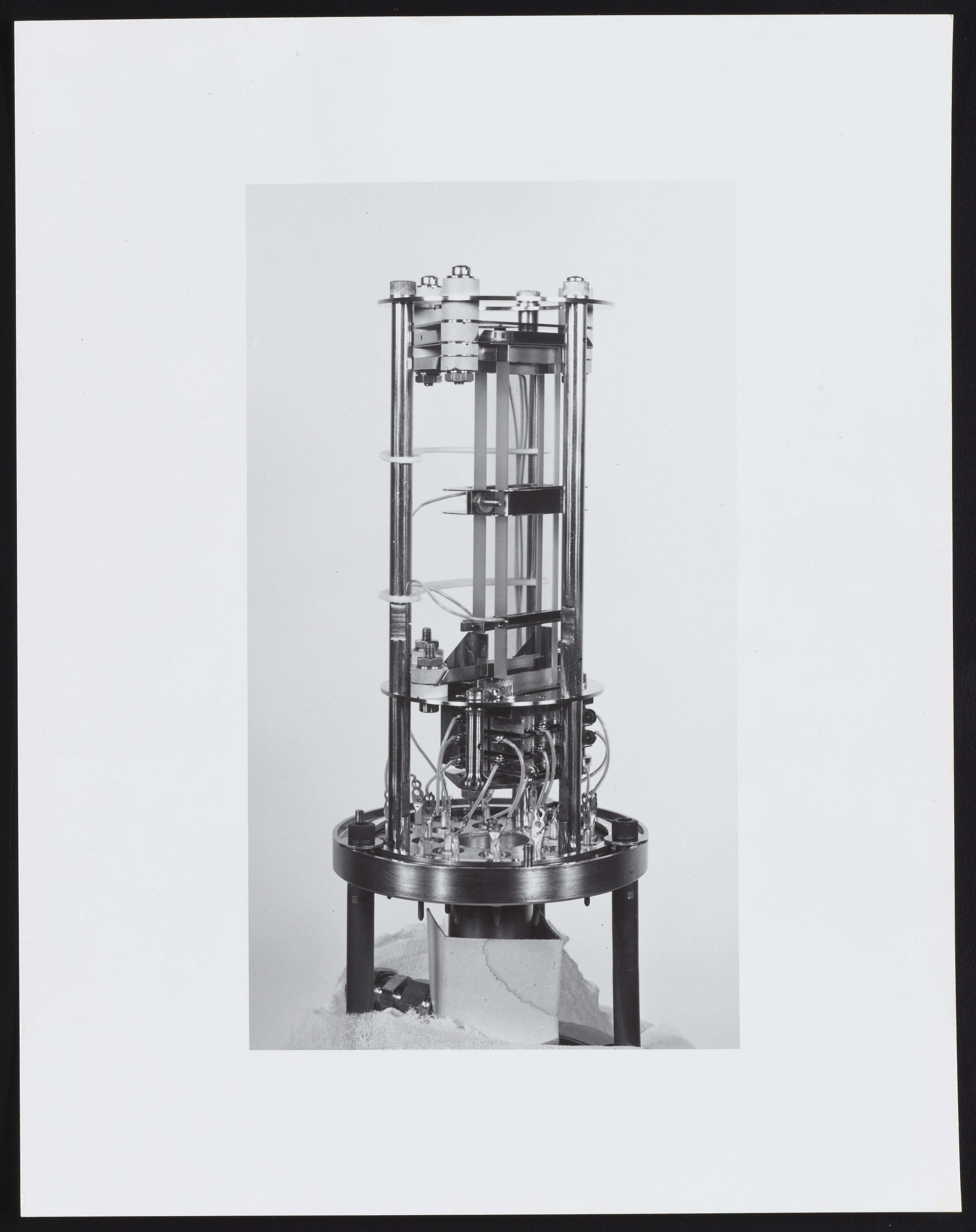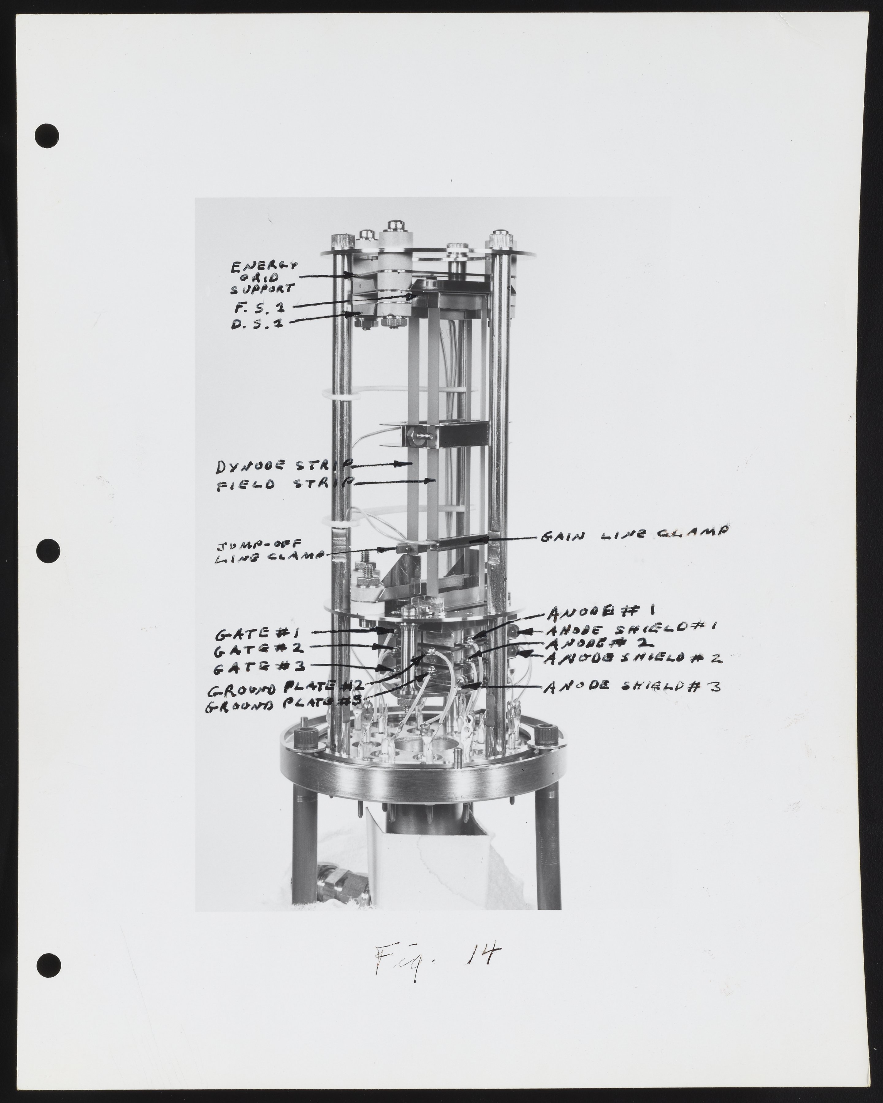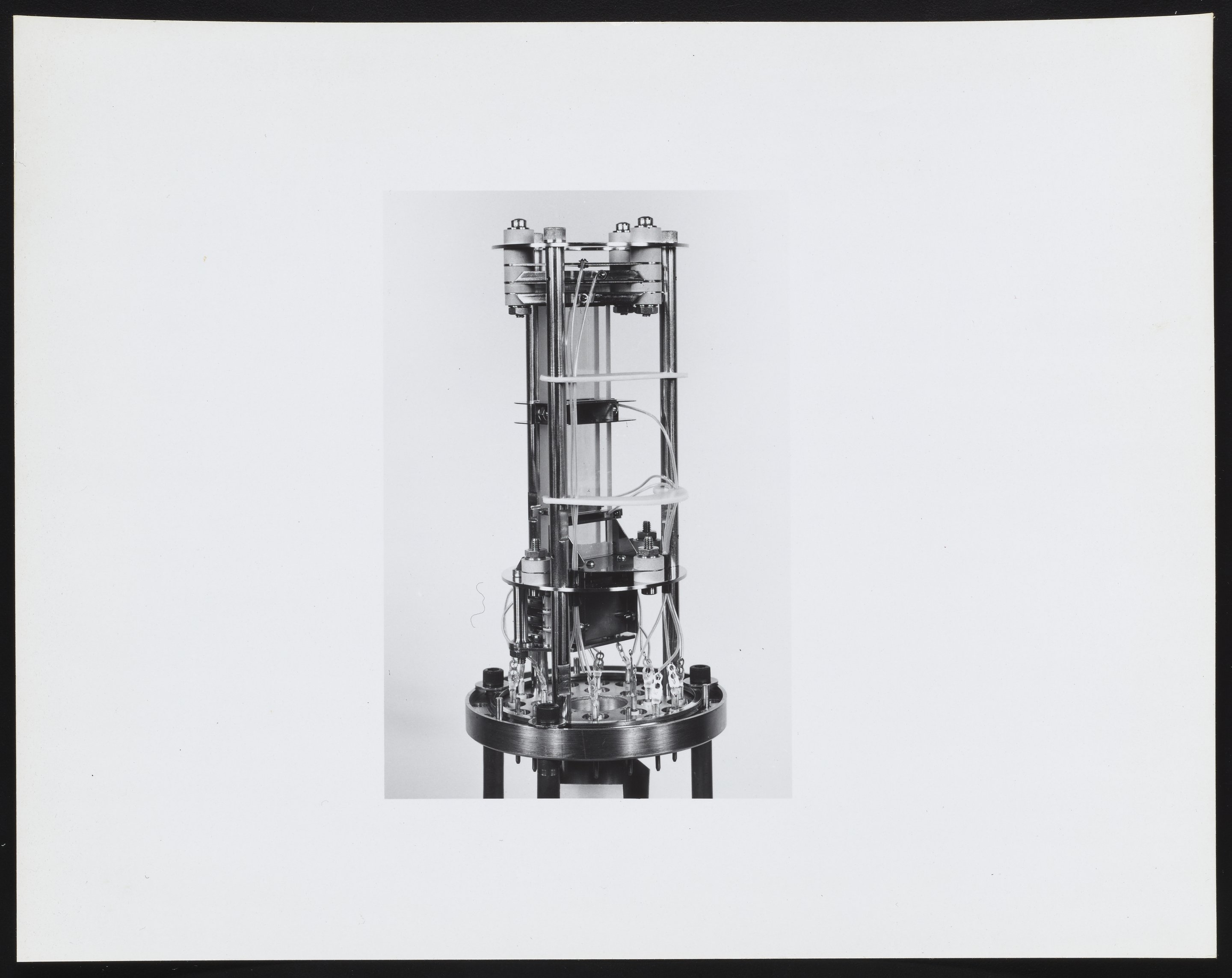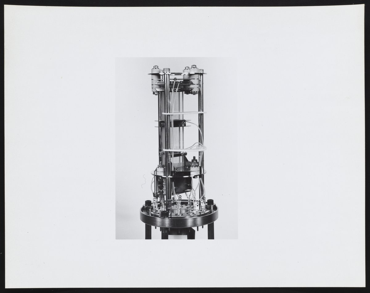 Small JPG1200 x 955px — 79.0 KBLarge JPG2880 x 2292px — 349 KBFull-sized JPG4672 x 3718px — 852 KBOriginal fileTIFF — 4672 x 3718px — 49.7 MBSeries of photographs depicting an ion source and Model 202-G2 Magnetic Electron Multiplier designed for use with the Bendix Corporation Time-of-Flight Mass Spectrometer. Several of the photographs are annotated with identifications for various component parts, including the dynode and field strips, gate assembly, and glass clamp.