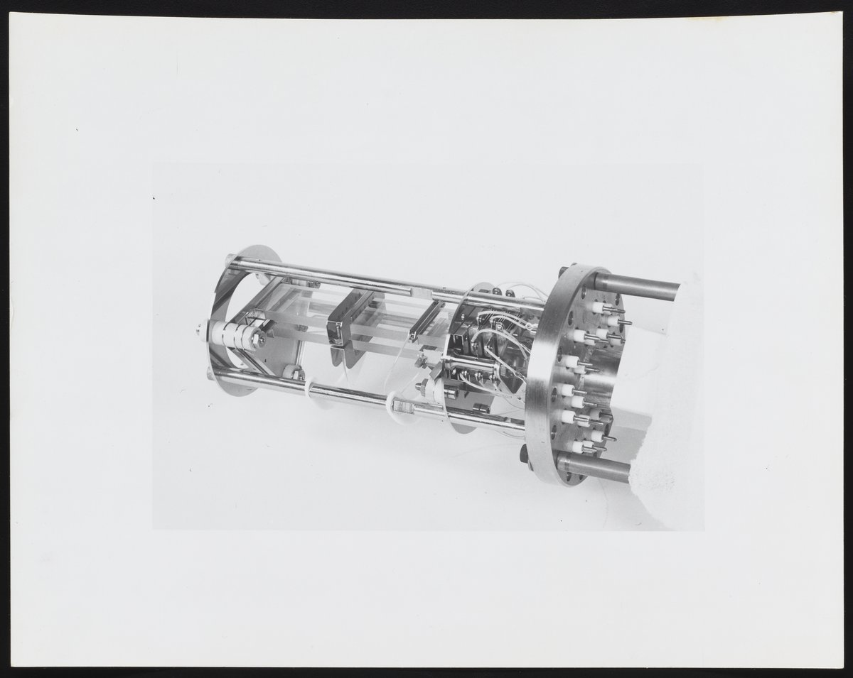 One of four component parts of a mass spectrometer, the ion source produces a beam of particles characteristic of the sample material for qualitative and quantitative analysis, while the magnetic electron multiplier is used to detect and amplify ion bunches or peaks. According to notations accompanying the photograph, the Model 202-G2 Multiplier was part of the Rocket-borne and Satellite series.