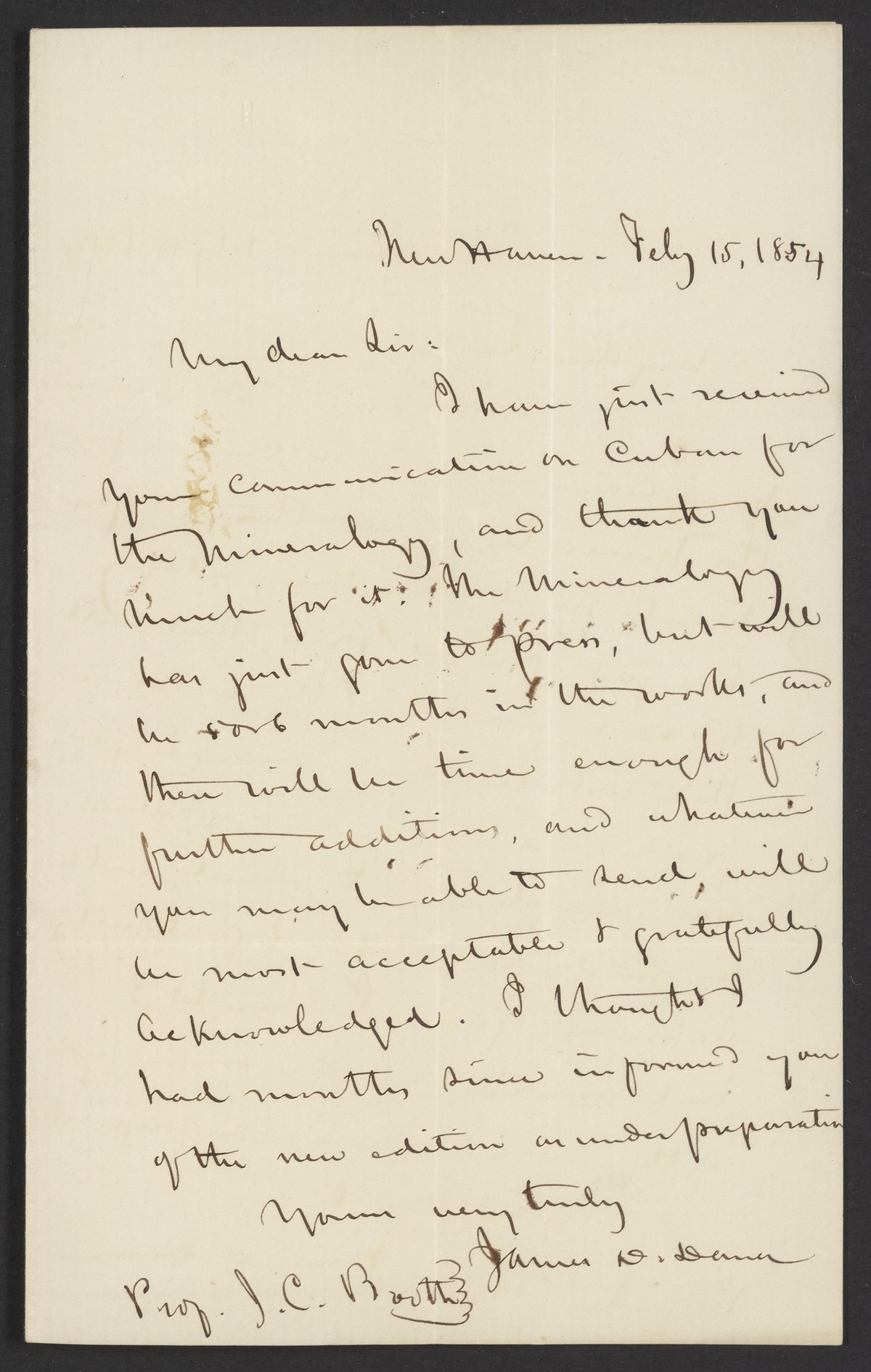 Letter from James Dwight Dana to James Curtis Booth, February 15, 1854