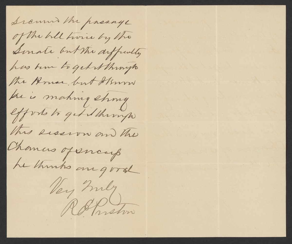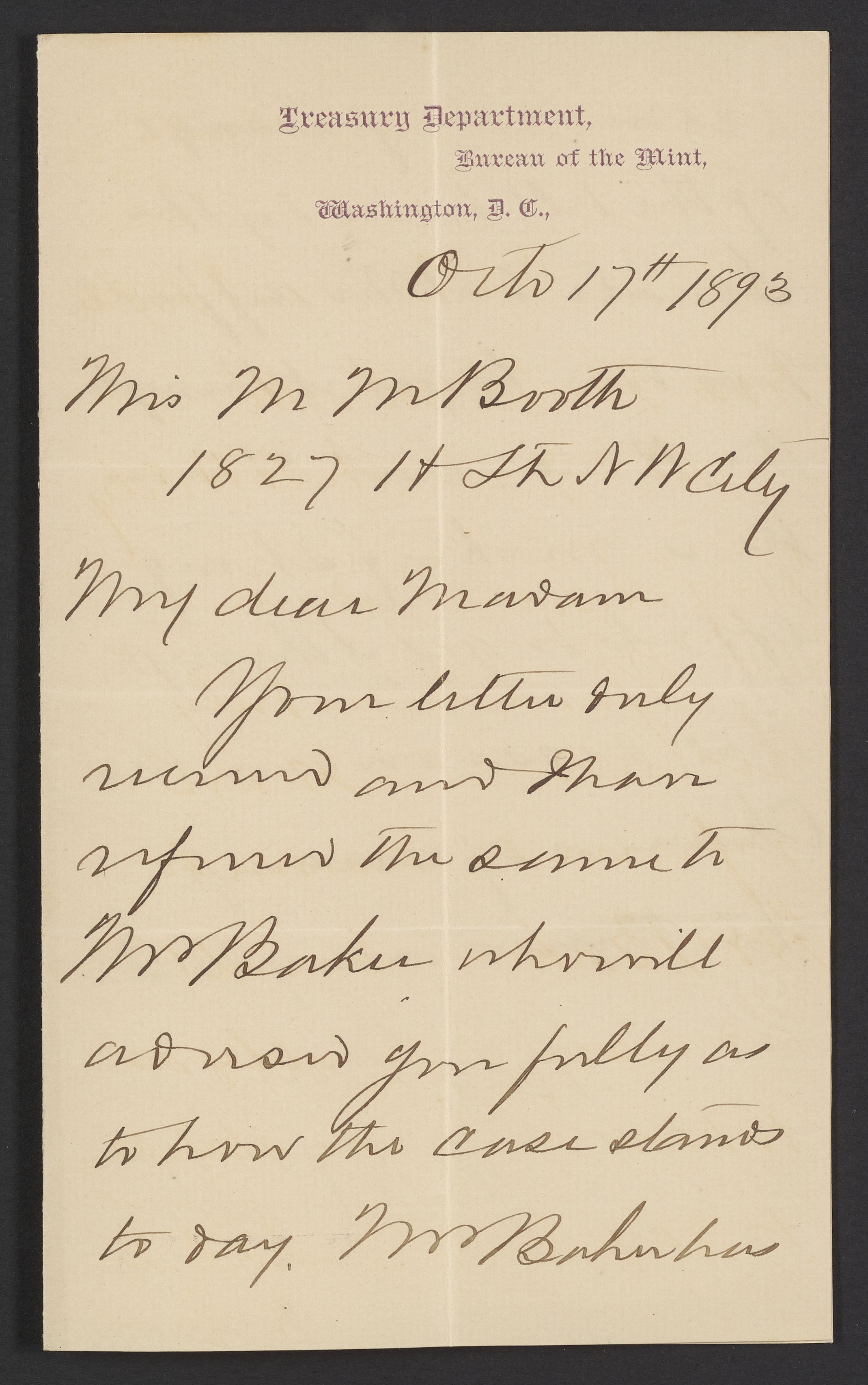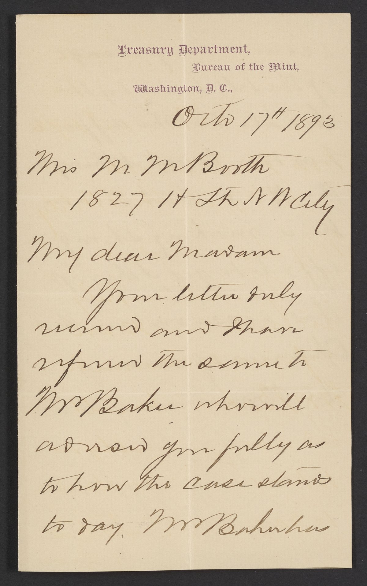 Small JPG1200 x 1915px — 290 KBFull-sized JPG2139 x 3413px — 864 KBOriginal fileTIFF — 2139 x 3413px — 20.9 MBLetter from Robert E. Preston (1836-1911) of the United States Mint Bureau informs Margaret M. Booth née Cardeza that her lawyer, Mr. Baker, was successful in getting her relief bill approved by the Senate.