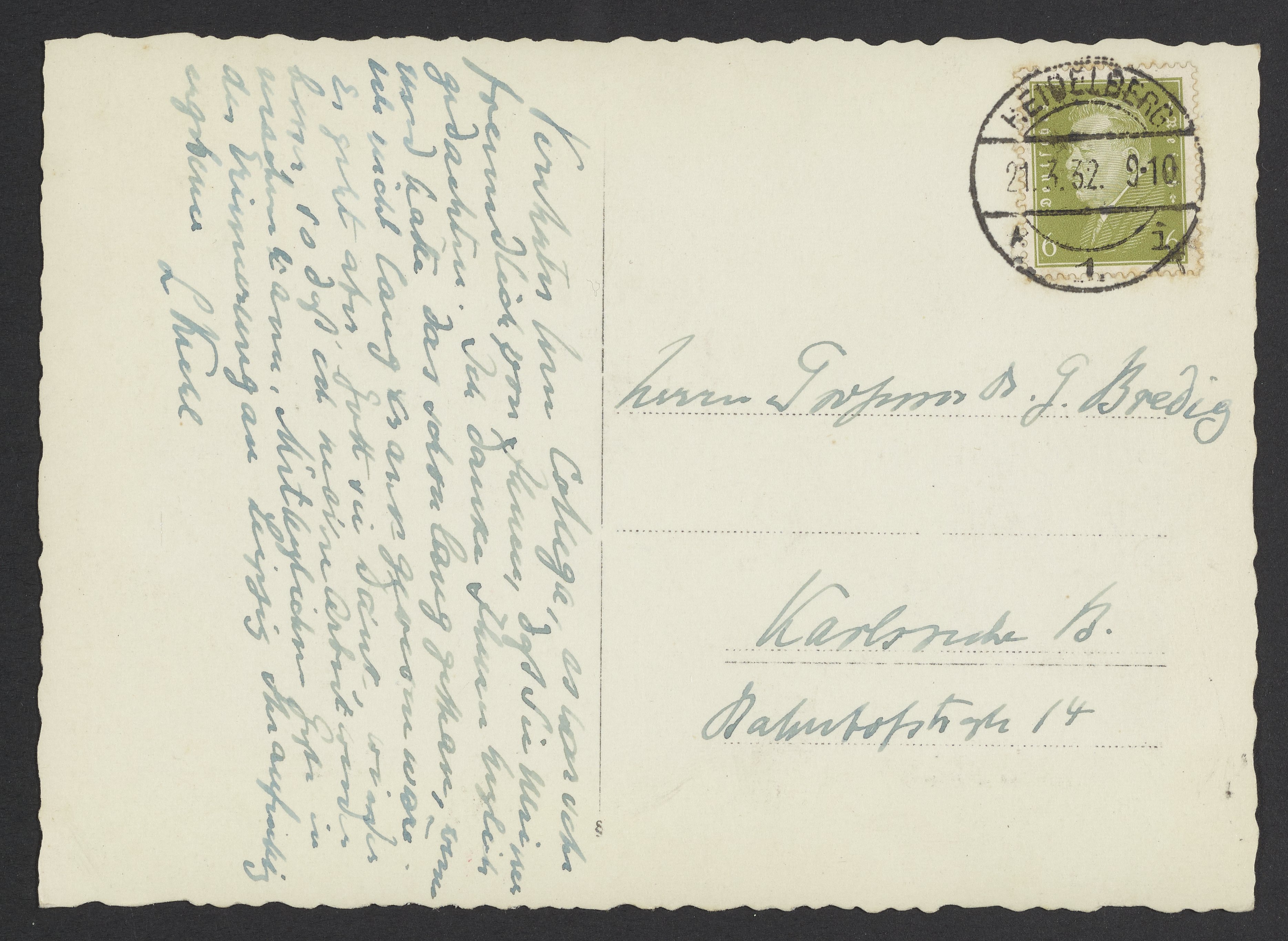 Krehl, Ludolf von. “Postcard from Ludolf Von Krehl to Georg Bredig,” March 20, 1932. Papers of Georg and Max Bredig, Box 22. Science History Institute. Philadelphia. https://digital.sciencehistory.org/works/82oslik.