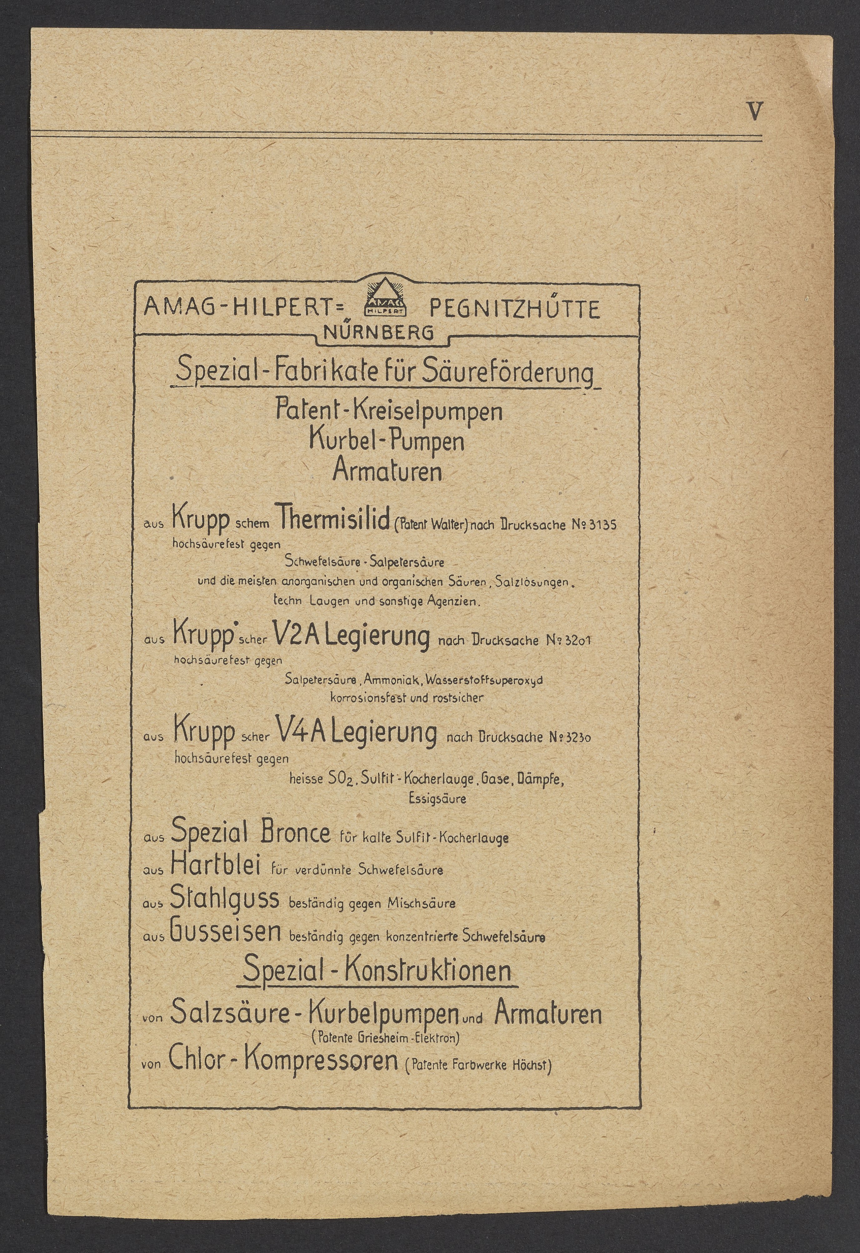 Amag-Hilpert-Pegnitzhütte AG. “Spezial-Fabrikate Für Säureförderung,” n.d. Papers of Georg and Max Bredig, Box 4, Folder 13. Science History Institute. Philadelphia. https://digital.sciencehistory.org/works/8356773.