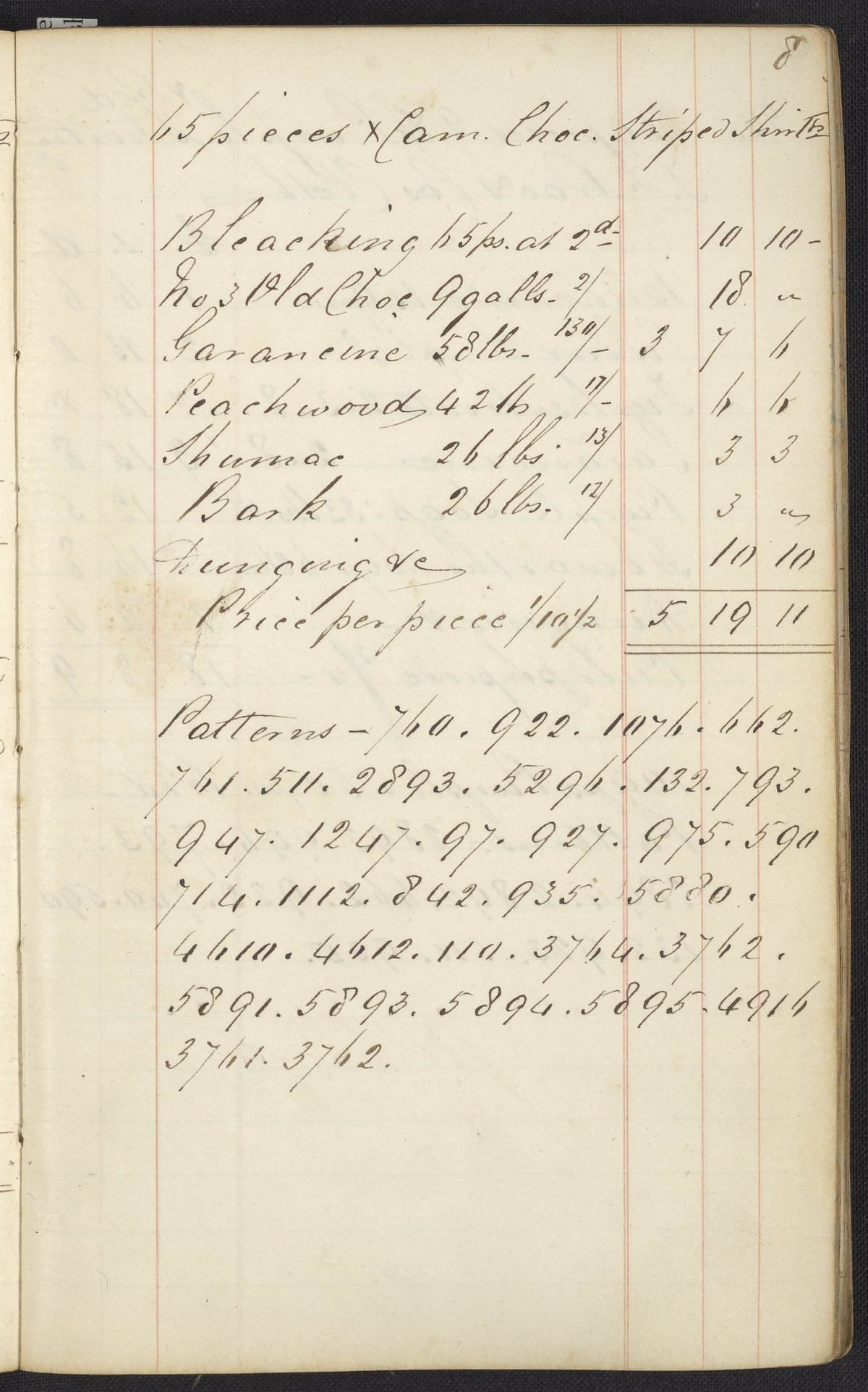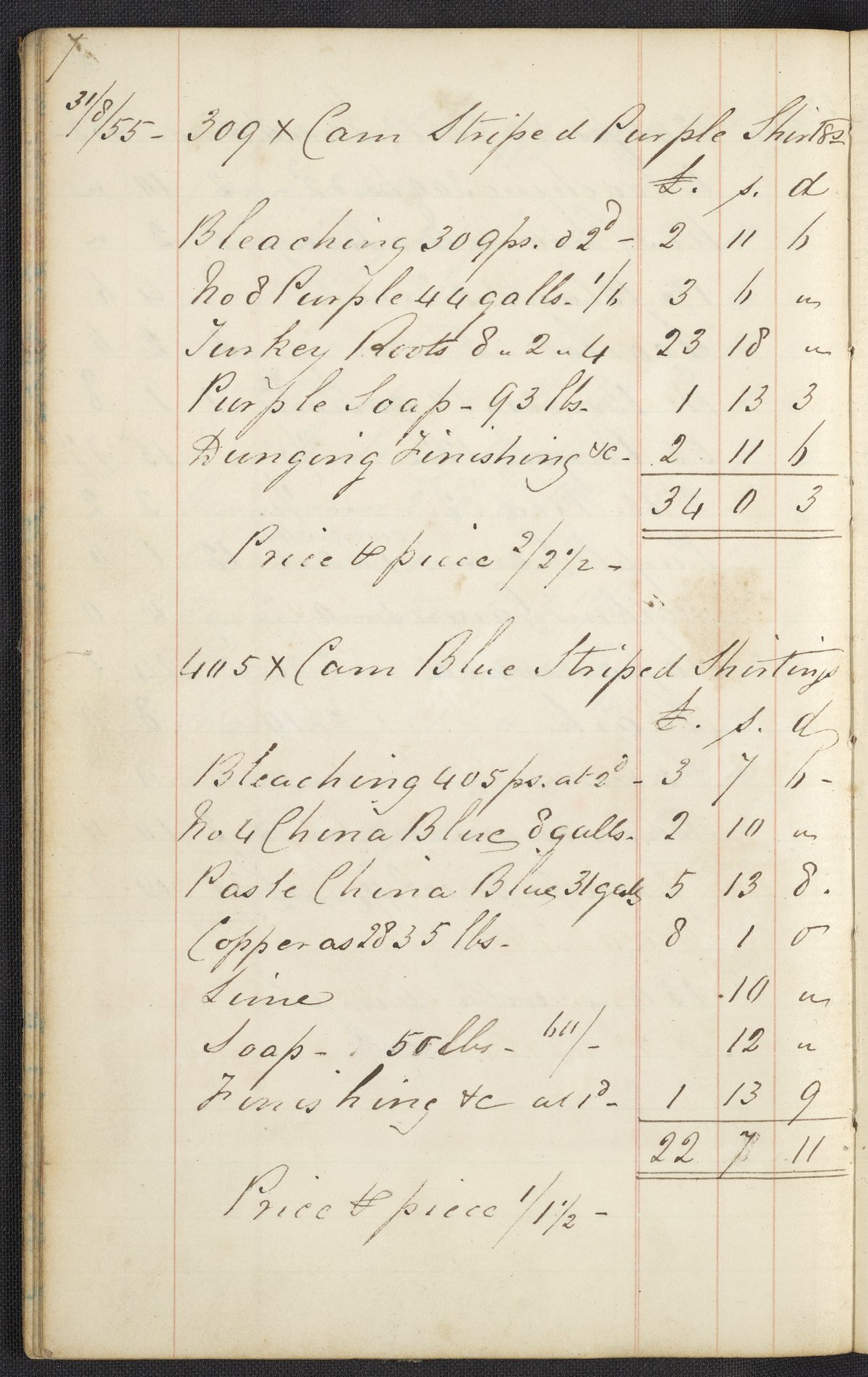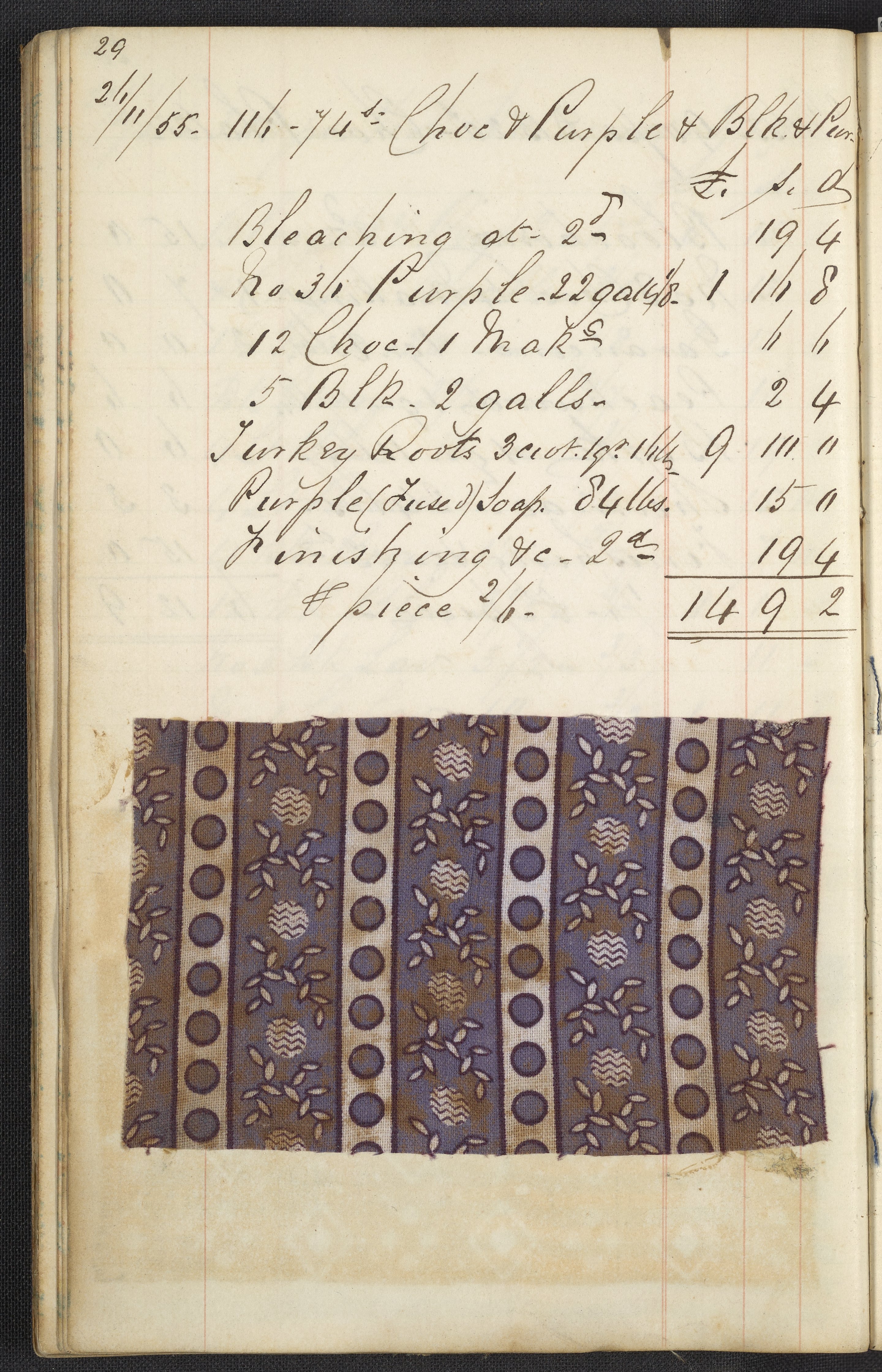 Small JPG1200 x 1858px — 606 KBLarge JPG2880 x 4460px — 2.8 MBFull-sized JPG2927 x 4533px — 2.9 MBOriginal fileTIFF — 2927 x 4533px — 38.0 MBThe first of two highly legible British dyer's account journals. The journal lists recipes and the costs for materials used in the process of dyeing many kinds of cloth, "gum china blue," "sumac," "peachwood," etc. These works were compiled before and during the introduction of aniline dye; most of the recipes only include dyestuffs originating from vegetable or insect matter, however, select recipes from volume two include mauve, the first synthetic dye.