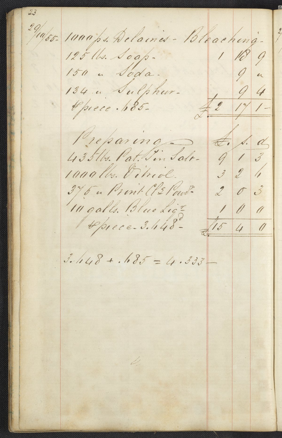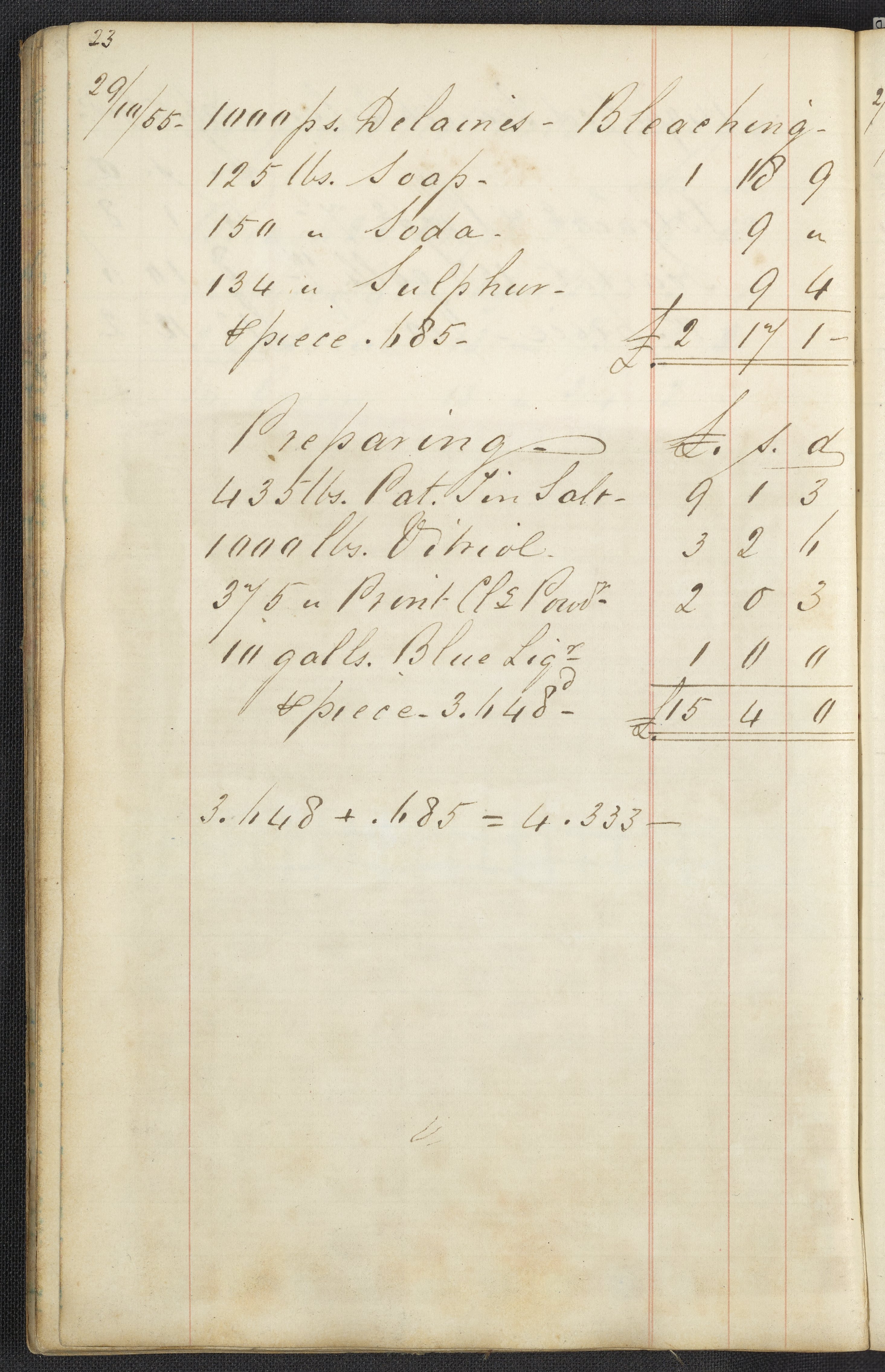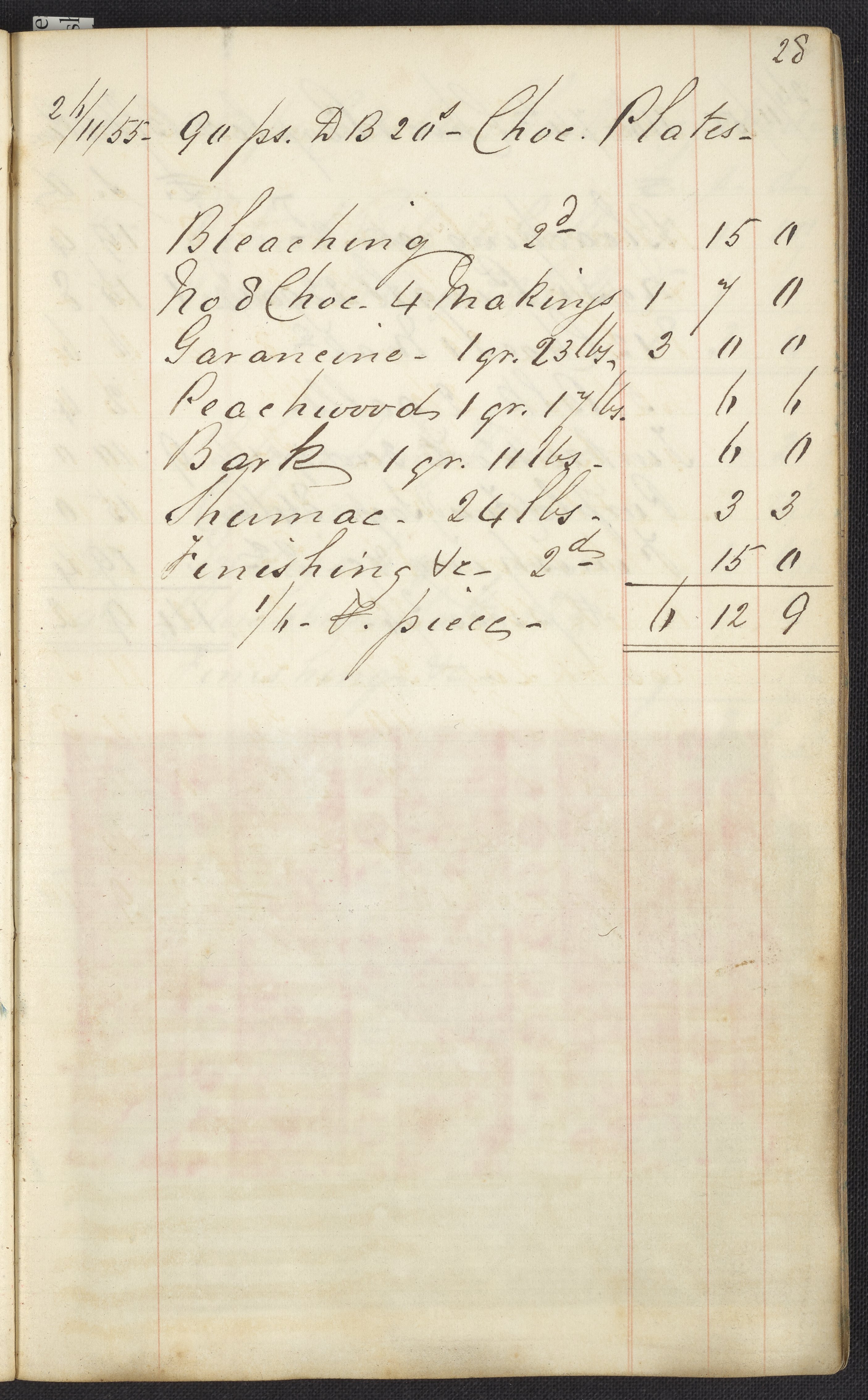 Small JPG1200 x 1858px — 606 KBLarge JPG2880 x 4460px — 2.8 MBFull-sized JPG2927 x 4533px — 2.9 MBOriginal fileTIFF — 2927 x 4533px — 38.0 MBThe first of two highly legible British dyer's account journals. The journal lists recipes and the costs for materials used in the process of dyeing many kinds of cloth, "gum china blue," "sumac," "peachwood," etc. These works were compiled before and during the introduction of aniline dye; most of the recipes only include dyestuffs originating from vegetable or insect matter, however, select recipes from volume two include mauve, the first synthetic dye.