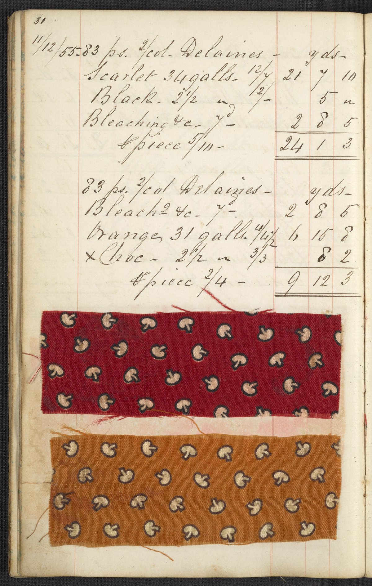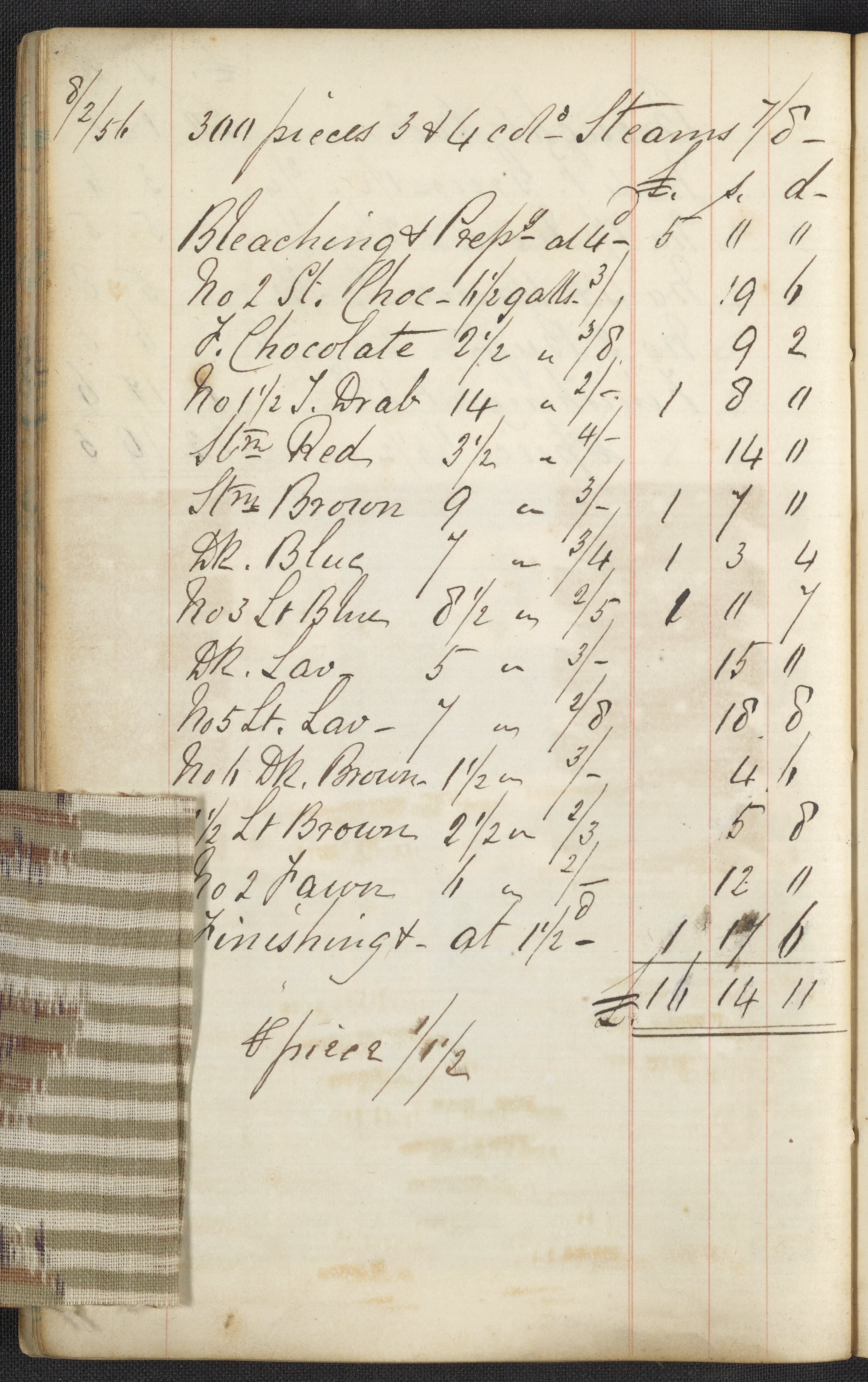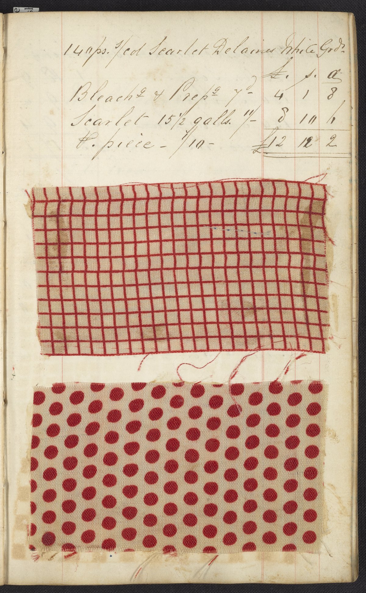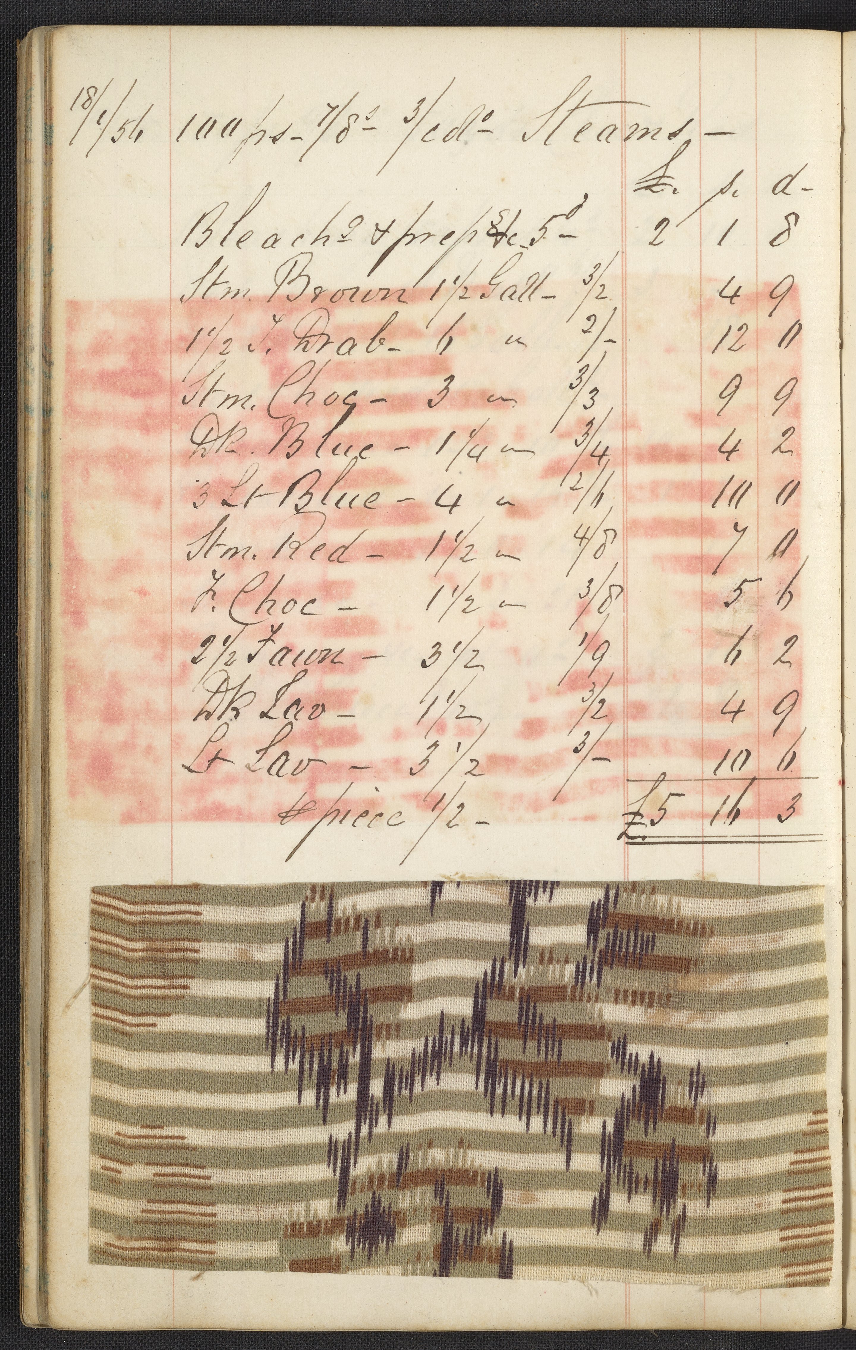 The two journals contain a total of 164 pasted or tipped-in cloth samples. Many of these fabric samples are listed as “Delaine,” a mix of cotton and wool typically used for blouses and dresses. This combination of materials produces a unique appearance when dyed, as wool absorbs dye color better than cotton. For each sample, a recipe listing all the materials used along with prices and quantities for each is provided. Laid into the works are a number of loose pieces of paper with calculations.