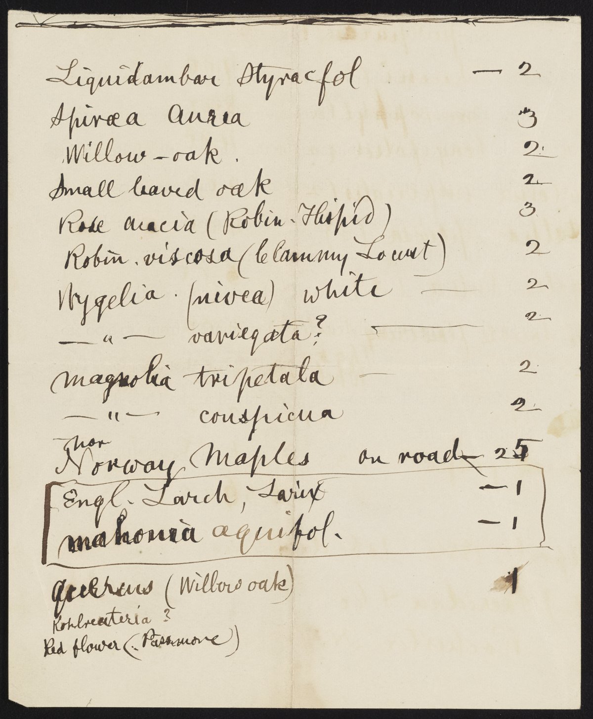 Booth, James Curtis. “List of Trees and Prices,” circa 1884. Papers of James Curtis Booth, Box 2, Folder 10. Science History Institute. Philadelphia. https://digital.sciencehistory.org/works/84d6eef.