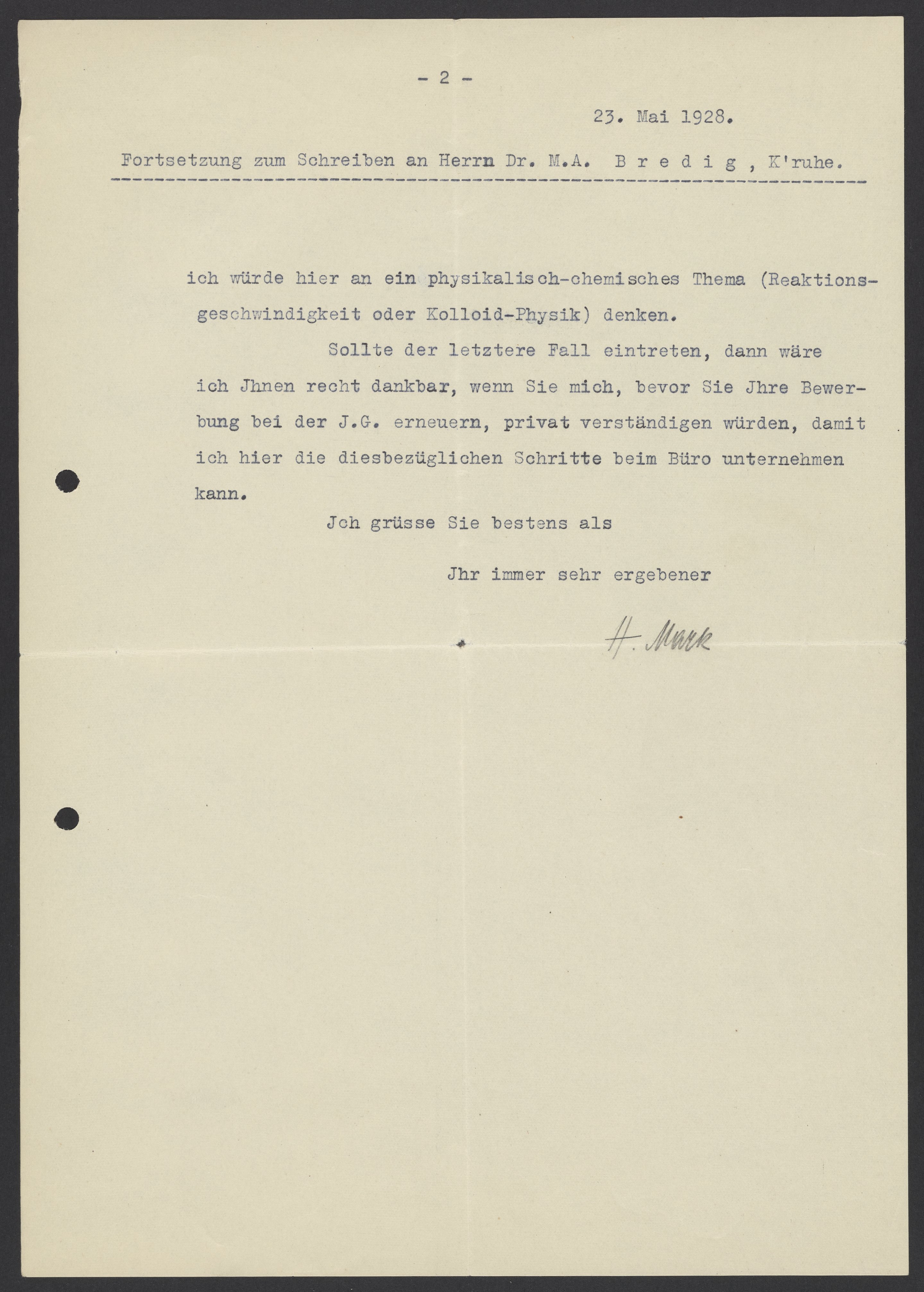 Letter from Herman Mark to Max Bredig, May 23, 1928