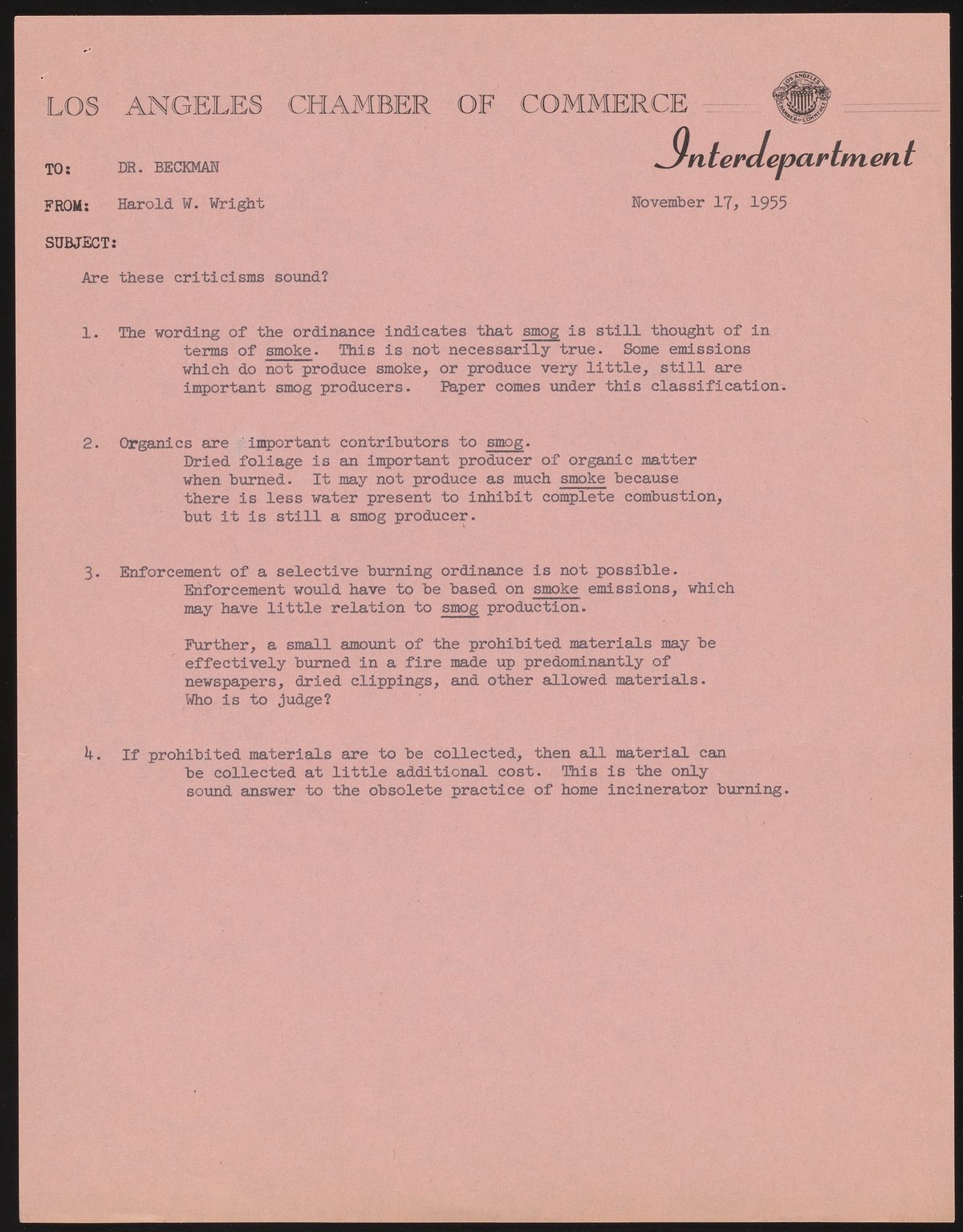Memo regarding criticisms of Regulation VII, an ordinance proposed by the Los Angeles Chamber of Commerce's Air Pollution Committee to control Los Angeles smog. Among the criticisms: the difference between smoke and smog, the difficulty of enforcing burning regulations, and the cost of collecting prohibited burning materials.