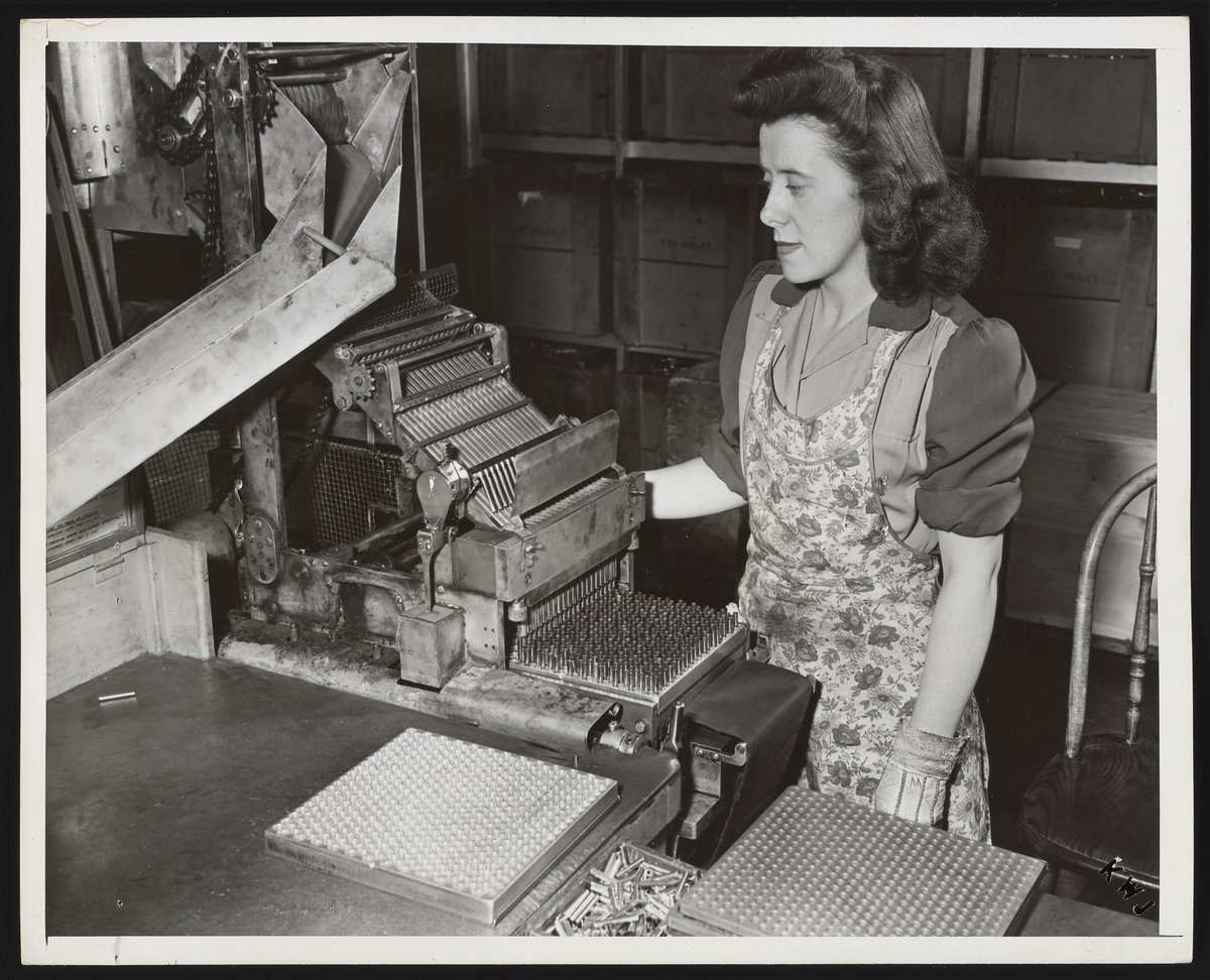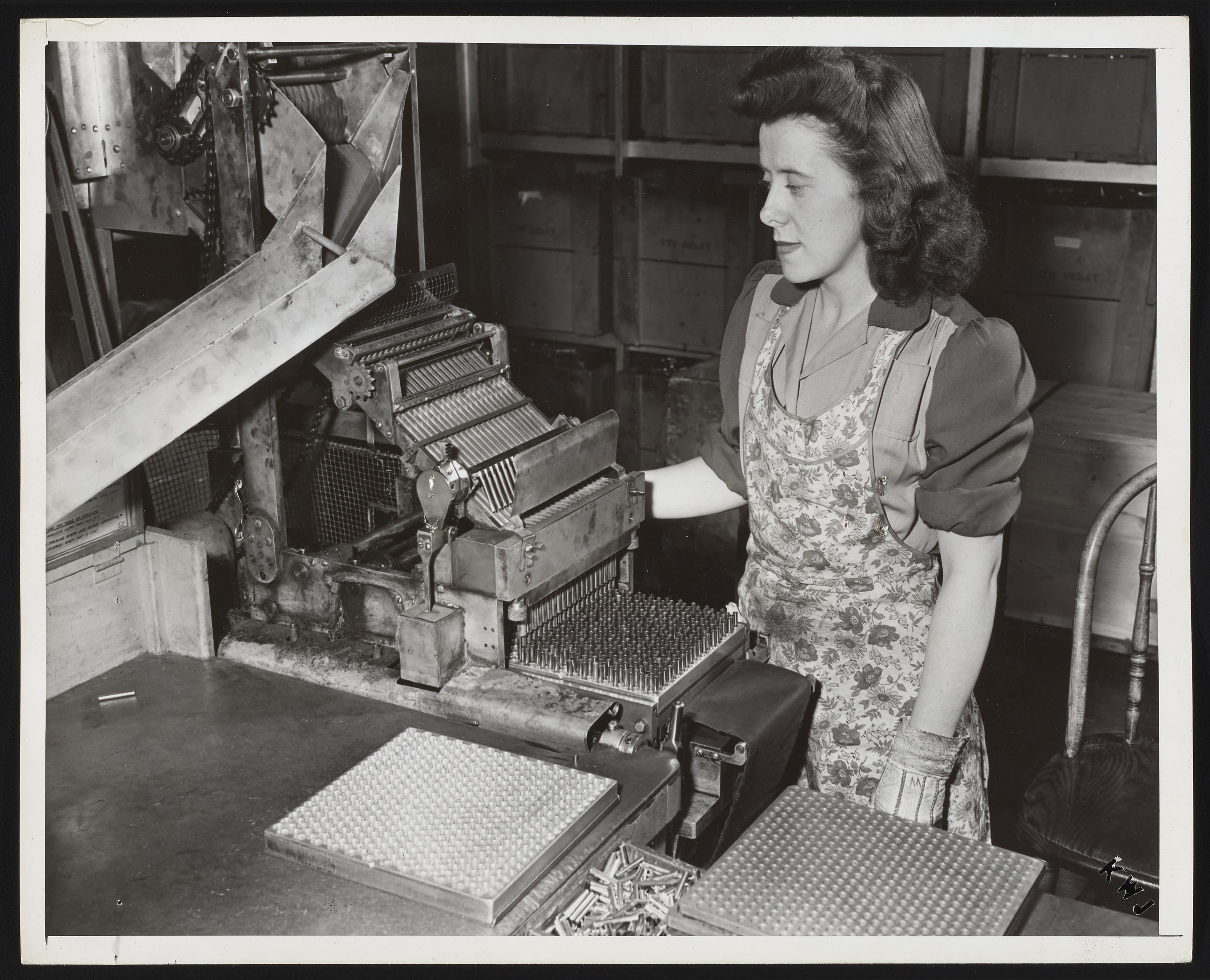 Employee inspecting blasting cap shells at Hercules Port Ewen plant