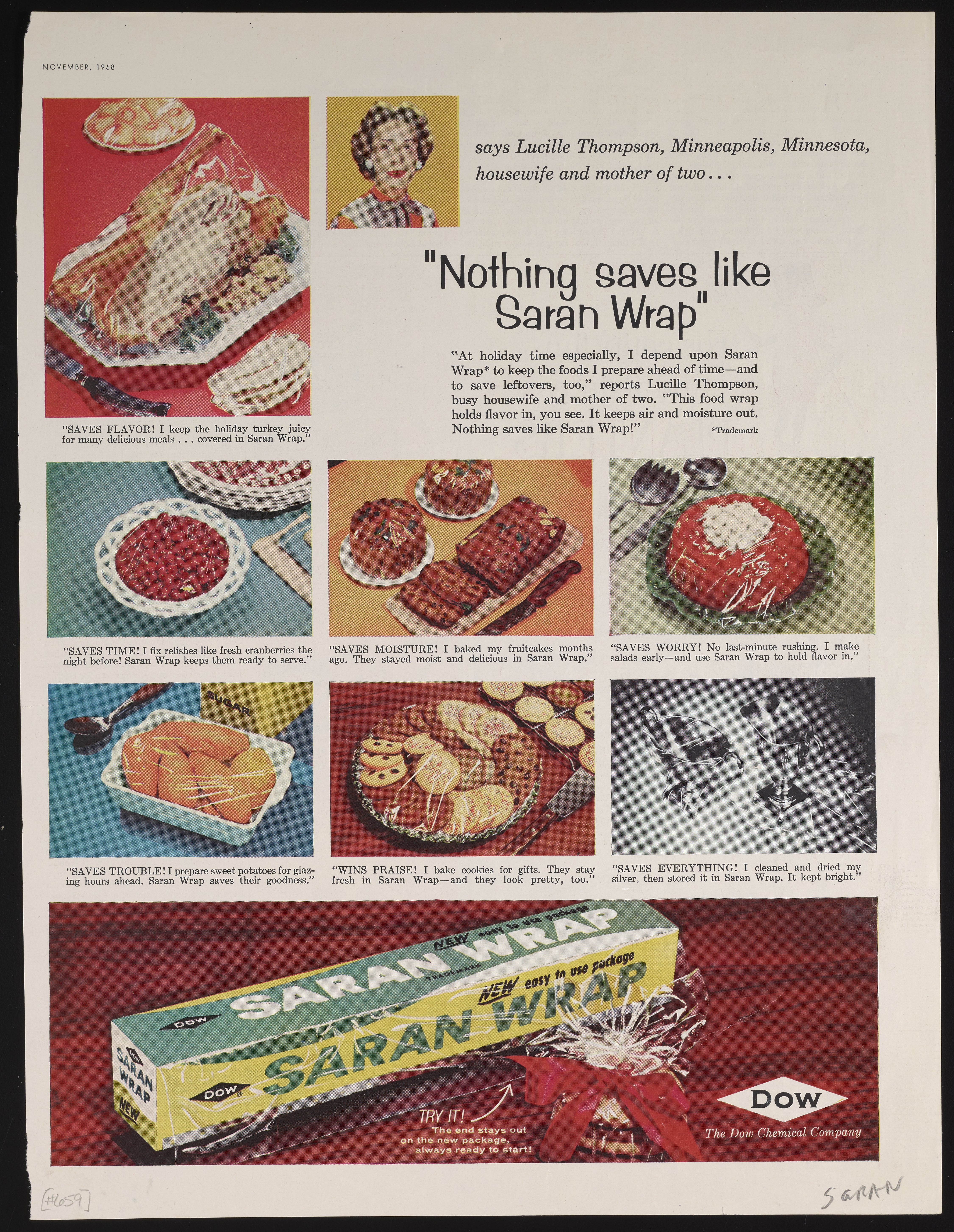 Color print advertisement for Saran Wrap, a product of the Dow Chemical Company. The advertisement features small photographs of food items wrapped in Saran film, as well as a testimonial from "Lucille Thompson," identified as a housewife and mother of two from Minneapolis, Minnesota. The accompanying text describes the benefits of Saran Wrap for food storage. This advertisement appeared in the November 1958 edition of Ladies' Home Journal.