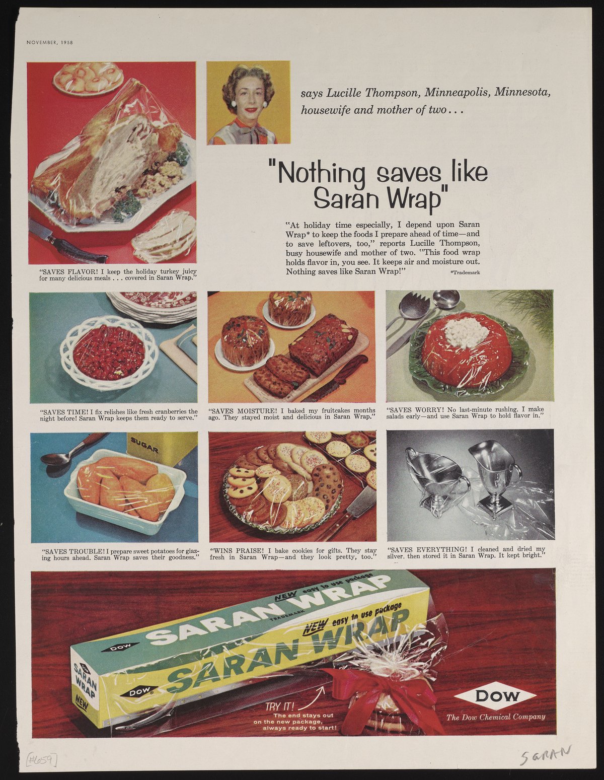 Dow Chemical Company. “‘Nothing Saves Like Saran Wrap,’” November 1958. Advertisements from the Dow Chemical Historical Collection, Box 9. Science History Institute. Philadelphia. https://digital.sciencehistory.org/works/88iia6k.