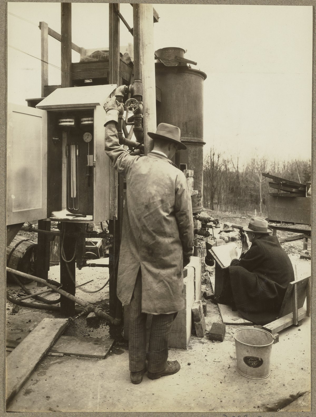 Travis P. Hignett and Mr. Royster reading temperature inside experimental blast furnace