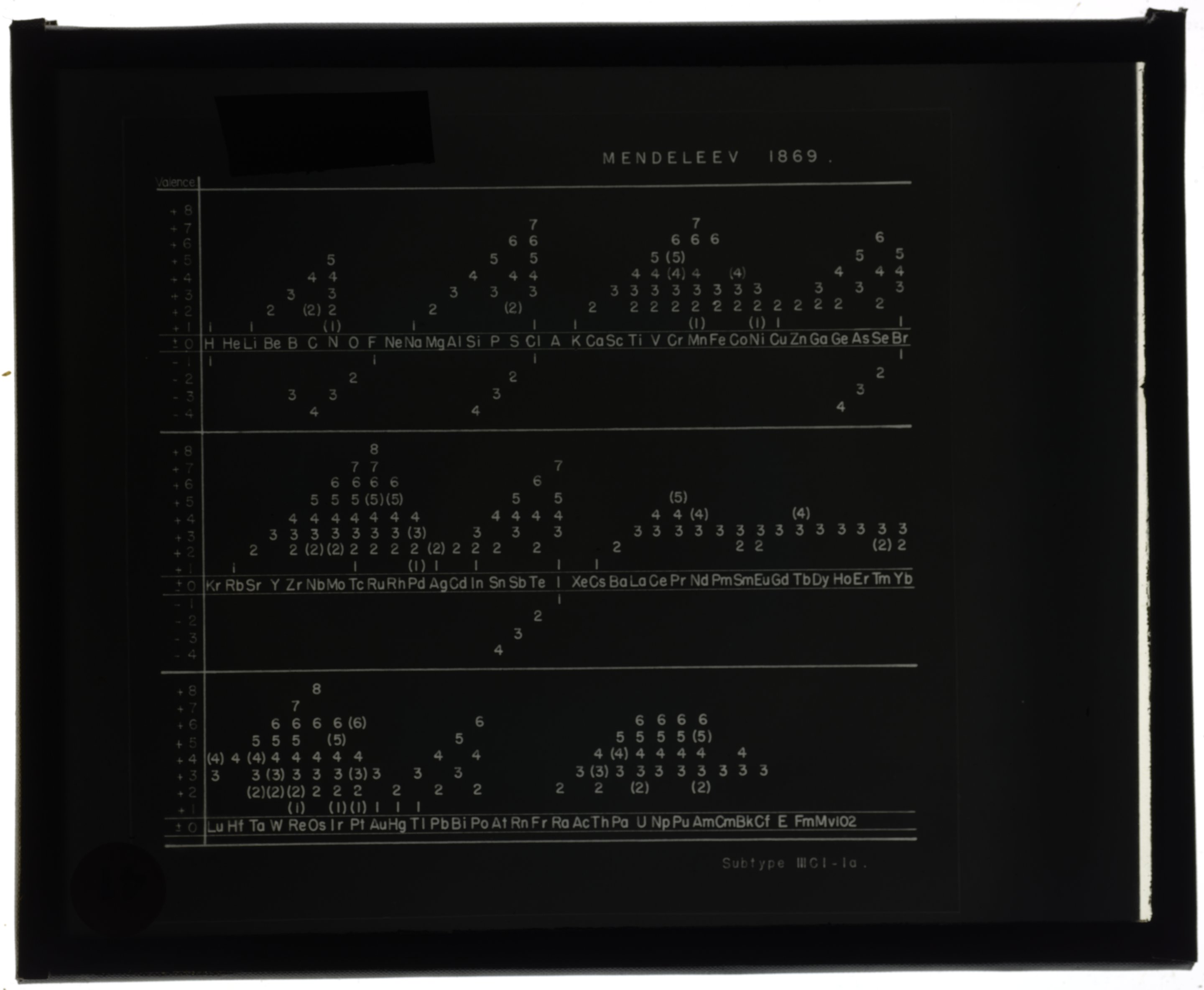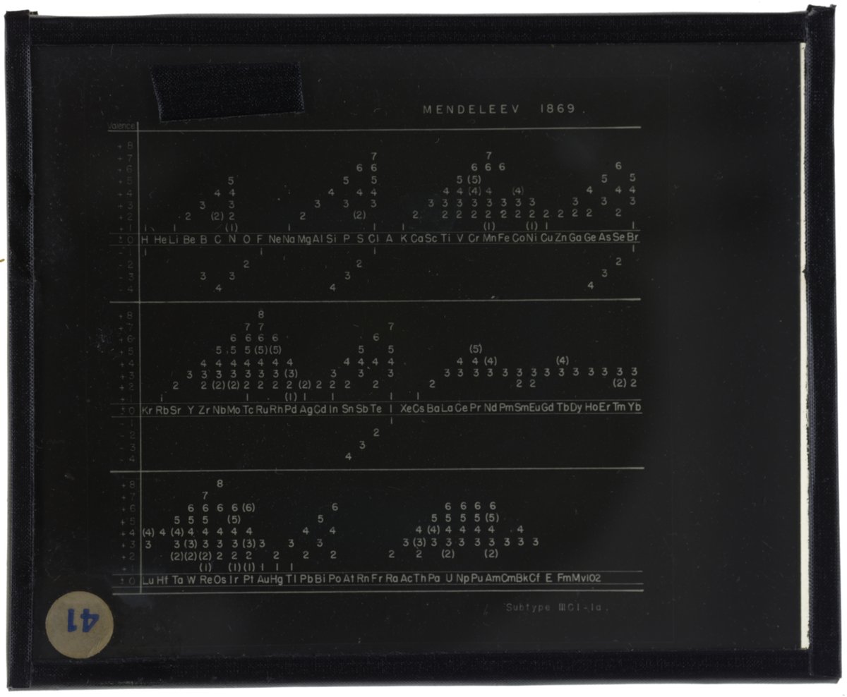 Series table designed by Dmitri Mendeleev (1869)1869 (Original design), Circa 1957 (Date attributed to slide)